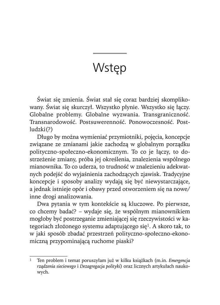 Wstęp Świat się zmienia. Świat stał się coraz bardziej skomplikowany. Świat się skurczył. Wszystko płynie. Wszystko się łączy. Globalne problemy. Globalne wyzwania. Transgraniczność. Transnarodowość. Postsuwerenność. Ponowoczesność. Postludzki(?) Długo by można wymieniać przymiotniki, pojęcia, koncepcje związane ze zmianami jakie zachodzą w globalnym porządku polityczno-społeczno-ekonomicznym. To co je łączy, to dostrzeżenie zmiany, próba jej określenia, znalezienia wspólnego mianownika. To co uderza, to trudność w znalezieniu adekwatnych podejść do wyjaśnienia zachodzących zjawisk. Tradycyjne koncepcje i sposoby analizy wydają się być niewystarczające, a jednak istnieje opór i obawy przed otworzeniem się na nowe/ inne drogi analizowania. Dwa pytania w tym kontekście są kluczowe. Po pierwsze, co chcemy badać? – wydaje się, że wspólnym mianownikiem mogłoby być postrzeganie zmieniającej się rzeczywistości w kategoriach złożonego systemu adaptującego się1. A skoro tak, to w jaki sposób zbadać przestrzeń polityczno-społeczno-ekonomiczną przypominającą ruchome piaski? 1 Ten problem i temat poruszyłam już w kilku książkach (m.in. Emergencja rządzenia sieciowego i Dezagregacja polityki) oraz licznych artykułach naukowych. 8 Wstęp 1. Nieliniowość, dynamika, otwartość Zmiany zachodzące w naszym świecie mają charakter nieliniowy, dynamiczny, piętrzący się i destabilizujący. Wobec tego należy zastosować takie narzędzia badawcze, które analizują tego rodzaju systemy. Analiza adaptujących się systemów złożonych – systemów otwartych będących w stanie „pomiędzy” pozwala nam na inne spojrzenie na takie zjawiska, jak chociażby globalizacja, terroryzm, rozprzestrzenianie się wirusów i innych zjawisk. Banałem być może jest stwierdzenie, że są one złożone, ale tak właśnie jest. Składają się z gromad różnorodnych aktorów, dynamicznie wchodzących ze sobą w interakcje, wywołując przy tym pętlę za pętlą sprzężenia zwrotnego. Zrozumienie wymaga trochę wyobraźni i pewnego wysiłku2. Istotą teorii złożoności jest złożony system adaptujący się – system a nie zbiór niepowiązanych ze sobą działań – układ dynamiczny i skomplikowany. Cechuje go porządek połączonych ze sobą części, które potencjalnie mogą być samodzielnymi podmiotami/aktorami/agentami. Autonomiczna aktywność jednostkowa nie pozostaje bez wpływu na działania innych jednostek, a wszyscy razem wykazują pewien model zachowań, mający charakter bądź to rutyny, albo też zerwania z nią, gdy trzeba sprostać nowym wymaganiom i wytworzyć nowe zachowania. Zdolność podmiotów/aktorów/agentów do zmiany zachowań, a co za tym idzie do wywoływania pętli pozytywnego sprzężenia zwrotnego – czegoś co jest inne, nowe, nieznane czyni system złożonym. Stanowi to przeciwieństwo systemów prostych, gdzie wszyscy zachowują się w sposób przewidywalny. Adaptacja systemu oznacza umiejętność zbiorowego radzenia 2 J.H. Miller, S.E. Page, Complex Adaptive Systems. An Introduction to Computa tional Models of Social Life, Princeton University Press, Princeton, Oxford 2007, s. 8. Wstęp 9 sobie z nowymi wyzwaniami. Takimi systemami, bez wątpienia, są systemy polityczne, takie jak państwo, czy system międzynarodowy, charakteryzujące się pewnym układem strukturalnym, który może ulegać transformacji, czy to pod wpływem bodźców zewnętrznych lub też wewnętrznych. Oczywiście nie oznacza to stanu ciągłej zmiany, mogą istnieć długie okresy stagnacji, trwałości, stabilności, ale nadchodzą też momenty burzy, głębokich wstrząsów i przemian mające wszelkie znamiona złożonych systemów adaptujących się3. Na ten temat napisano już wiele, więc pokrótce. Zmienia się przestrzeń analizy. Procesy globalizacji spowodowały zamazywanie się granic czasowo-przestrzennych. Procesy globalizacji implikują zwiększenie i zagęszczenie przekraczających granice interakcji, które wciągają prawie wszystkie społeczeństwa, państwa, organizacje, grupy podmiotów i jednostki – oczywiście w różnym stopniu zaangażowania – w złożony system wzajemnych zależności. Świat jest coraz trudniej podzielić w sposób wyraźny na sferę lokalną i globalną, krajową i międzynarodową. Rozwiązywanie rozmaitych globalnych problemów, jak chociażby przeciwdziałanie skutkom globalnych zmian klimatycznych, czy walka z ponadnarodowym terroryzmem lub ponadnarodową zorganizowaną przestępczością nie jest możliwe na poziomie krajowym. Problemy lokalne nabierają wymiaru globalnego, a problemy światowe „lokalizują się”. Co więcej, potrzebna jest dogłębna rekonfiguracja pojęcia przestrzeni, nie tylko w kontekście deterytorialności (tworzenie się „ponadterytorialnych” relacji międzyludzkich; rozprzestrzenianie się różnych ponadpaństwowych, ponadgranicznych powiązań likwiduje coś co nazywane jest „terytorializmem” – sytuację, 3 J.N. Rosenau, „Governance in Globalizing Space”, (w:) J. Pierre (red.), Debating Governance. Authority, Steering, and Democracy, Oxford, New York 2000, s. 181. 10 Wstęp w której geografia polityczna i społeczna jest określana terytorialnie), ale również wielowymiarowości rozumianej nie tylko w tradycyjny trójwymiarowy sposób. Zmieniają się parametry badawcze. Działania polityczne przekraczają granice, gdy dziejące się w jakimś miejscu wydarzenia i związane z nimi decyzje pociągają za sobą konsekwencje, zamierzone lub niezamierzone, w innym miejscu. Ponadto wzrasta liczba powiązań, inaczej mówiąc świat staje się gęstniejącą siatką powiązań i interakcji politycznych. Natychmiastowość obiegu informacji, rola mediów i nowoczes nych technologii komunikowania pozwala na relacjonowanie i śledzenie wydarzeń niemal w czasie rzeczywistym. Globalny obieg informacji wpływa na przyspieszenie pro