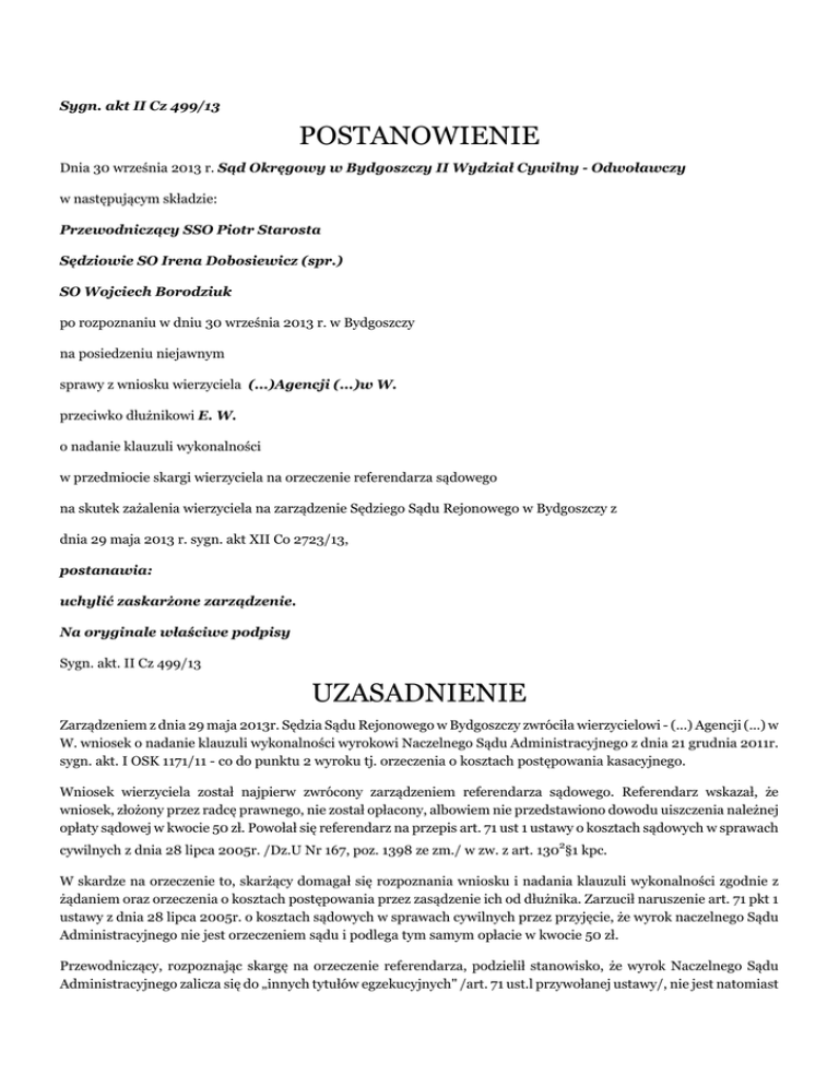 Sygn. akt II Cz 499/13 POSTANOWIENIE Dnia 30 września 2013 r. Sąd Okręgowy w Bydgoszczy II Wydział Cywilny - Odwoławczy w następującym składzie: Przewodniczący SSO Piotr Starosta Sędziowie SO Irena Dobosiewicz (spr.) SO Wojciech Borodziuk po rozpoznaniu w dniu 30 września 2013 r. w Bydgoszczy na posiedzeniu niejawnym sprawy z wniosku wierzyciela (...)Agencji (...)w W. przeciwko dłużnikowi E. W. o nadanie klauzuli wykonalności w przedmiocie skargi wierzyciela na orzeczenie referendarza sądowego na skutek zażalenia wierzyciela na zarządzenie Sędziego Sądu Rejonowego w Bydgoszczy z dnia 29 maja 2013 r. sygn. akt XII Co 2723/13, postanawia: uchylić zaskarżone zarządzenie. Na oryginale właściwe podpisy Sygn. akt. II Cz 499/13 UZASADNIENIE Zarządzeniem z dnia 29 maja 2013r. Sędzia Sądu Rejonowego w Bydgoszczy zwróciła wierzycielowi - (...) Agencji (...) w W. wniosek o nadanie klauzuli wykonalności wyrokowi Naczelnego Sądu Administracyjnego z dnia 21 grudnia 2011r. sygn. akt. I OSK 1171/11 - co do punktu 2 wyroku tj. orzeczenia o kosztach postępowania kasacyjnego. Wniosek wierzyciela został najpierw zwrócony zarządzeniem referendarza sądowego. Referendarz wskazał, że wniosek, złożony przez radcę prawnego, nie został opłacony, albowiem nie przedstawiono dowodu uiszczenia należnej opłaty sądowej w kwocie 50 zł. Powołał się referendarz na przepis art. 71 ust 1 ustawy o kosztach sądowych w sprawach cywilnych z dnia 28 lipca 2005r. /Dz.U Nr 167, poz. 1398 ze zm./ w zw. z art. 1302§1 kpc. W skardze na orzeczenie to, skarżący domagał się rozpoznania wniosku i nadania klauzuli wykonalności zgodnie z żądaniem oraz orzeczenia o kosztach postępowania przez zasądzenie ich od dłużnika. Zarzucił naruszenie art. 71 pkt 1 ustawy z dnia 28 lipca 2005r. o kosztach sądowych w sprawach cywilnych przez przyjęcie, że wyrok naczelnego Sądu Administracyjnego nie jest orzeczeniem sądu i podlega tym samym opłacie w kwocie 50 zł. Przewodniczący, rozpoznając skargę na orzeczenie referendarza, podzielił stanowisko, że wyrok Naczelnego Sądu Administracyjnego zalicza się do „innych tytułów egzekucyjnych" /art. 71 ust.l przywołanej ustawy/, nie jest natomiast tytułem pochodzącym od sądu, bo do tych zaliczyć należy tytuły egzekucyjne pochodzące od sądów powszechnych i Sądu Najwyższego. i W zażaleniu wierzyciel domagał się uchylenia zaskarżonego zarządzenia i nadania klauzuli wykonalności wskazanemu we wniosku oraz zasądzenia od dłużnika na rzecz wierzyciela kosztów postępowania za obie instancje wraz z opłatą od pełnomocnika. Zarzucił naruszenie przepisu art. 71 pkt.l ustawy o kosztach sądowych w sprawach cywilnych z dnia 28 lipca 2005r. przez przyjęcie, że wyrok NSA nie jest orzeczeniem sądu, wobec czego wniosek o nadanie temu wyrokowi klauzuli wykonalności, w zakresie orzeczenia o kosztach postępowania podlega opłacie w kwocie 50 zł. Sąd Okręgowy zważył, co następuje: Zażalenie jako zasadne podlegało uwzględnieniu, a zaskarżone zarządzenie winno było zostać uchylone. Sąd Okręgowy w składzie orzekającym w sprawie stwierdza, że doszło do naruszenia przepisu art. 71 pkt 1 ustawy o kosztach sądowych w sprawach cywilnych, przez przyjęcie, że wniosek o nadanie klauzuli wykonalności wyrokowi Naczelnego Sądu Administracyjnego - tu: w zakresie rozstrzygnięcia o kosztach postępowania podlega opłacie stałej w kwocie 50 zł. Przewodniczący dokonując zwrotu wniosku, przyjął, że jest to „inny tytuł egzekucyjny", o którym mowa w art. 777§ 1 pkt 3-6 kpc, a nie orzeczenie sądu, o czym mowa w pkt 1 art. 777§1 kpc. Jest to pogląd nie do przyjęcia, błędny, nie znajdujący odzwierciedlenia w orzecznictwie czy doktrynie. Jest to również rażąco sprzeczne z ustawą zasadniczą, gdy zważy się na treść art. 175 Konstytucji, stanowiącym w ust.l, że wymiar sprawiedliwości w Rzeczypospolitej Polskiej sprawują Sąd Najwyższy, sądy powszechne, sądy administracyjne oraz sądy wojskowe. Wobec tego, że zaskarżone orzeczenie dotyczyło zwrotu wniosku a nie jego oddalenia, a więc nie było merytoryczne, dlatego też, Sąd Okręgowy 2 uchylił zaskarżone orzeczenie na mocy art. 386§1 kpc w zw. z art. 397§2 kpc i art. 13 §2 kpc. Na oryginale właściwe podpisy Za zgodność z oryginałem
