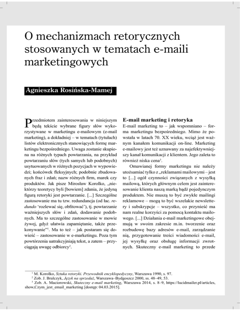 O mechanizmach retorycznych stosowanych w tematach e-maili marketingowych Agnieszka Rosiñska-Mamej P rzedmiotem zainteresowania w niniejszym bĊdą tekĞcie wybrane Þgury sáów wykorzystywane w marketingu e-mailowym (e-mail marketing), a dokáadniej – w tematach (tytuáach) listów elektronicznych stanowiących formĊ marketingu bezpoĞredniego. Uwaga zostanie skupiona na róĪnych typach powtarzania, na przykáad powtarzaniu sáów (tych samych lub podobnych) usytuowanych w róĪnych pozycjach w wypowiedzi; koĔcówek ßeksyjnych; podobnie zbudowanych fraz i zdaĔ; nazw róĪnych Þrm, marek czy produktów. Jak pisze Mirosáaw Korolko, „niektórzy teoretycy byli [bowiem] zdania, Īe jedyną Þgurą retoryki jest powtarzanie. [...] Szczególne zastosowanie ma tu tzw. redundancja (od áac. redundo ‘rozlewaü siĊ, obÞtowaü’), tj. powtarzanie waĪniejszych sáów i zdaĔ, dodawanie podobnych. Ma to szczególne zastosowanie w mowie Īywej, gdyĪ uáatwia zapamiĊtanie, takĪe przekonywanie”1. Ma to teĪ – jak postaram siĊ dowieĞü – zastosowanie w e-marketingu. Poza tym powtórzenia uatrakcyjniają tekst, a zatem – przyciągają uwagĊ odbiorcy2. 1 E-mail marketing i retoryka E-mail marketing to – jak wspomniano – forma marketingu bezpoĞredniego. Mimo Īe powstaáa w latach 70. XX wieku, wciąĪ jest waĪnym kanaáem komunikacji on-line. Marketing e-mailowy jest teĪ uznawany za najefektywniejszy kanaá komunikacji z klientem. Jego zaleta to równieĪ niska cena3. Omawianej formy marketingu nie naleĪy utoĪsamiaü tylko z „reklamami mailowymi – jest to [...] ogóá czynnoĞci związanych z wysyáką mailową, których gáównym celem jest zainteresowanie klienta naszą marką bądĨ pojedynczym produktem. Nie muszą to byü zwykáe mailingi reklamowe – mogą to byü wszelakie newslettery i subskrypcje – wszystko, co przynieĞü ma nam realne korzyĞci za pomocą kontaktu mailowego. [...] Dziaáania e-mail marketingowe obejmują w swoim zakresie m.in. tworzenie oraz rozbudowĊ bazy adresów e-mail, zarządzanie nią, przygotowanie treĞci wiadomoĞci e-mail, jej wysyákĊ oraz obsáugĊ informacji zwrotnych. Skuteczny e-mail marketing to przede M. Korolko, Sztuka retoryki. Przewodnik encyklopedyczny, Warszawa 1990, s. 97. Zob. J. Bralczyk, JĊzyk na sprzedaĪ, Warszawa–Bydgoszcz 2000, ss. 48–49, 53. 3 Zob. A. Maciorowski, Skuteczny e-mail marketing, Warszawa 2014, s. 8–9, https://lucidmailer.pl/articles, show,Czym_jest_email_marketing [dostĊp: 04.03.2015]. 2 84 wszystkim wnikliwa analiza informacji, pozyskanych za jego poĞrednictwem”4. W zakres marketingu e-mailowego wchodzą róĪne formy komunikacji: poza najpopularniejszymi newsletterem (tj. informacyjno-poradnikowo-lojalnoĞciowym e-mailem wysyáanym do subskrybentów, którzy dobrowolnie podali swoje dane sáuĪące do kontaktu) oraz e-mailingiem reklamowym (czyli formą reklamowo-sprzedaĪową, która ma wywoáaü reakcjĊ klienta w postaci zakupu produktu, rejestracji w konkursie czy wypeánienia formularza kontaktowego) wyróĪniamy tu: zaproszenia (np. na pokazy produktów), biuletyny wewnĊtrzne, e-maile transakcyjne (np. wiadomoĞci o statusie zamówienia), powiadomienia (np. cykliczne informacje o stanie konta), wiadomoĞci okolicznoĞciowe (jak Īyczenia z okazji urodzin poáączone z informacją o przygotowaniu specjalnego rabatu) czy e-maile pozakupowe5. Oprócz dostarczania informacji cennych dla osób zajmujących siĊ planowaniem promocji i sprzedaĪy internetowej e-mail marketing sáuĪy budowaniu relacji z odbiorcami, podtrzymuje kontakty z klientami i wpáywa na ich lojalnoĞü (funkcje newsletterów), a takĪe zachĊca uĪytkowników kont pocztowych do aktywnoĞci na stronach WWW, na przykáad do rejestrowania siĊ, wypeániania formularzy czy dokonywania zakupów (funkcje e-mailingu reklamowego)6. 4 Agnieszka RosiĔska-Mamej PoniewaĪ kaĪdy uĪytkownik (bezpáatnej) poczty elektronicznej otrzymuje kaĪdego dnia wiele e-maili marketingowych7, a aspekty techniczne omawianej usáugi internetowej decydują o tym, Īe otrzymane wiadomoĞci ukáadają siĊ jedna pod drugą, tworząc rodzaj listy, na której widoczną są tylko wąskie pola zawierające krótką informacjĊ o nadawcy oraz temat/tytuá wiadomoĞci, nadawcy wiadomoĞci muszą tak skonstruowaü nagáówek e-mailu, aby przykuá uwagĊ odbiorcy. SpecjaliĞci zajmujący siĊ omawianą dziedziną podkreĞlają: „od tego, w jaki sposób zaprezentujesz siĊ na liĞcie odebranych wiadomoĞci, zaleĪy to, czy odniesiesz sukces rozumiany jako otwarcie e-maila”8. Zadanie twórców wiadomoĞci marketingowej utrudnia dodatkowo to, Īe decyzjĊ o tym, co zrobimy z otrzymanym e-mailem podejmujemy w ciągu milisekundy. Ze wzglĊdu na opisaną wyĪej budowĊ skrzynki pocztowej o tym, czy odbiorca zainteresuje siĊ wiadomoĞcią i ją otworzy, czy uzna za nieistotną i usunie, decyduje zawartoĞü pól „Autor”/„Od” oraz „Temat”9, a zwáaszcza ten drugi element wiadomoĞci. Artur Maciorowski, konsultant, trener i publicysta w zakresie e-marketingu, pisze: „Tytuá, którym opatrzysz wiadomoĞü, to najistotniejszy czynnik wpáywający na jej otwarcie”10. Temat (tytuá) e-mailu – jak kaĪdy tytuá – to czĊĞü jego ramy. Peáni on funkcjĊ metatek- TamĪe, s. 9–10. Pozyskiwanie informacji za pomocą e-mail marketingu jest moĪliwe miĊdzy innymi dziĊki takim wskaĨnikom, jak: CTR (liczba klikniĊü warunkujących otworzenie listu), CPC (koszt klikniĊcia prowadzącego do przejĞcia uĪytkownika na okreĞloną stronĊ WWW) czy CR (procent dokonanych „akcji”, jak zakup produktu, w stosunku do klikniĊü w daną reklamĊ). 5 TamĪe, s. 10–11; zob. takĪe H. Füchsel, Korespondencja w Þrmie, czyli jak piszesz, tak ciĊ widzą, Warszawa 2000, s. 65 i n.; I. Kienzler, Pisma i umowy w Þrmie: wzory pism handlowych i umów cywilno-prawnych w jĊzyku polskim, angielskim i niemieckim, Warszawa 2013, s. 197 i n