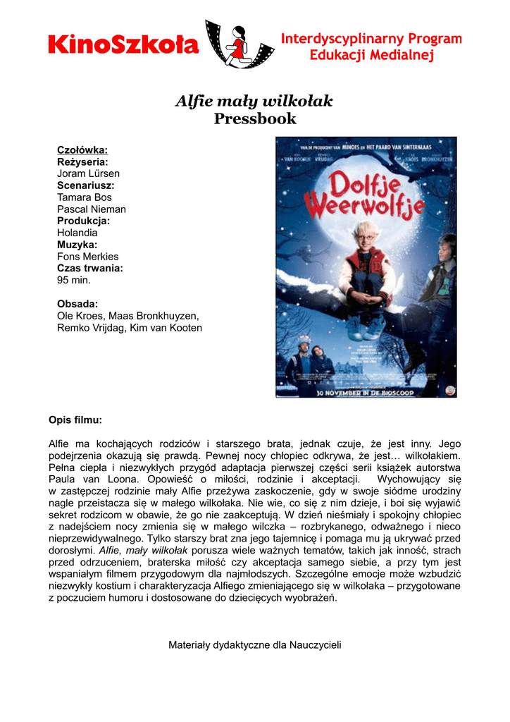 Alfie mały wilkołak Pressbook Czołówka: Reżyseria: Joram Lürsen Scenariusz: Tamara Bos Pascal Nieman Produkcja: Holandia Muzyka: Fons Merkies Czas trwania: 95 min. Obsada: Ole Kroes, Maas Bronkhuyzen, Remko Vrijdag, Kim van Kooten Opis filmu: Alfie ma kochających rodziców i starszego brata, jednak czuje, że jest inny. Jego podejrzenia okazują się prawdą. Pewnej nocy chłopiec odkrywa, że jest… wilkołakiem. Pełna ciepła i niezwykłych przygód adaptacja pierwszej części serii książek autorstwa Paula van Loona. Opowieść o miłości, rodzinie i akceptacji. Wychowujący się w zastępczej rodzinie mały Alfie przeżywa zaskoczenie, gdy w swoje siódme urodziny nagle przeistacza się w małego wilkołaka. Nie wie, co się z nim dzieje, i boi się wyjawić sekret rodzicom w obawie, że go nie zaakceptują. W dzień nieśmiały i spokojny chłopiec z nadejściem nocy zmienia się w małego wilczka – rozbrykanego, odważnego i nieco nieprzewidywalnego. Tylko starszy brat zna jego tajemnicę i pomaga mu ją ukrywać przed dorosłymi. Alfie, mały wilkołak porusza wiele ważnych tematów, takich jak inność, strach przed odrzuceniem, braterska miłość czy akceptacja samego siebie, a przy tym jest wspaniałym filmem przygodowym dla najmłodszych. Szczególne emocje może wzbudzić niezwykły kostium i charakteryzacja Alfiego zmieniającego się w wilkołaka – przygotowane z poczuciem humoru i dostosowane do dziecięcych wyobrażeń. Materiały dydaktyczne dla Nauczycieli O produkcji: Holenderski film animowany w przyjazny i niewymuszony sposób pokazuje, że odmienność nie jest powodem do wstydu, ale szansą dającą nowe możliwości. Główny bohater, Alfie, w dniu siódmych urodzin odkrywa, że podczas pełni księżyca zmienia się w wilkołaka. Uzyskuje wtedy niezwykłe moce – potrafi szybko biegać, skakać, jest silny. Ale też pożera kury sąsiadki i wygląda jak bestia. Alfie wstydzi się zmian, które zachodzą w jego ciele. Czuje się odmieńcem. Martwi się, że przybrani rodzice przestaną go kochać i pozbędą się go. Boi się też odrzucenia ze strony szkolnych kolegów. Oglądając film dzieci z łatwością utożsamiają się z problemami Alfiego i empatycznie odczuwają jego mieszane uczucia. Bohater filmu dobrze radzi sobie z kłopotami i lękiem przed odrzuceniem, dzięki temu mali widzowie również zostają pokrzepieni i wzbogaceni o przekonanie, że każdy z nas zasługuje na miłość bliskich, nawet jeśli czuje się odmienny. Atutem filmu jest niezwykła ścieżka dźwiękowa. Może być on inspirujący nie tylko dla dzieci, ale również dla nauczycieli zainteresowanych tym, jak uczyć dzieci pracy w grupie oraz jak wspomagać rozwój tych, które sprawiają kłopoty. Recenzja: Aż dziw bierze, że we współczesnym kinie, w którym motyw wilkołaka został już wykorzystany na dziesiątki różnych sposobów, na palcach jednej ręki można zliczyć produkcje w tym temacie skierowane do najmłodszych widzów. „Alfie, mały wilkołak” Jorama Lursena nie ma żadnych szans na zbliżenie się do statusu klasyku gatunku, jednakże jest to film, który powinien zapewnić solidną rozrywkę całym rodzinom. Warto jednak pamiętać, że to pozycja skierowana przede wszystkim dla widza przed 10. rokiem życia. Fabuła jest stosunkowo prosta. Oto Alfie, uroczy siedmioletni blondasek o pięknych dziecięcych marzeniach, któremu w ciągu pierwszych kilkunastu minut filmu cały świat zostaje wywrócony do góry nogami. Chłopak nie tylko dowiaduje się, że jego ukochani rodzice nie są jego prawdziwymi rodzicami, bowiem został podrzucony im lata wcześniej w koszyczku przez jakiegoś tajemniczego jegomościa, ale także zaczyna przeczuwać, że jest w jakiś sposób inny od swoich rówieśników. Staje się to oczywiste, gdy pewnej nocy całe ciało Alfiego zostaje w stu procentach obrośnięte przez gęste, długie, białe włosy, a przestraszony maluch zaczyna z jakiegoś powodu wyć do księżyca. Jednym słowem, główny bohater staje się dziecięcym wilkołakiem. Przed tym wydarzeniem Alfie był jednym z tych zakompleksionych małych okularników, którzy są w szkole pomiatani przez większych i silniejszych kolegów albo wyśmiewani za sposób noszenia bryli. Natomiast po kilku nocach fizycznych przemian chłopak zyskuje zarówno na pewności siebie i swoistym wdzięku, jak i na popularności, gdyż zaczyna interesować się nim pewna milutka dziewczynka, z którą bierze udział w szkolnej interpretacji „Piotrusia i wilka”. Samo przedstawienie i jego tematyka służą zresztą Lursenowi do nadania opowiadanej historii lekko przygodowego sznytu – Alfie musi nauczyć się być wilkołakiem, nie ujawniając swej prawdziwej tożsamości bliskim (o całej sprawie wie tylko jego starszy brat) ani reszcie mieszkańców, w szczególności pewnej złośliwej sąsiadce, która ma z nim pewien rachunek do wyrównania. Niemniej jednak „Alfie, mały wilkołak” to przede wszystkim ładna i pełna wartościowych morałów bajka dla najmłodszych dzieciaków. Humor jest oparty w prostym slapsticku, główni bohaterowie są fajni i pozytywni, czarne charaktery odpowiednio do nich dopasowane, a sama historia posiada pewną lekkość, która sprawia, że seans mija bardzo szybko. Co więcej, Alfie-wilkołak wygląda raczej jak przerośnięty pluszowy miś, a nie żadna krwiożercza bestia – tak też się zachowuje, tak się porusza. Jest na dodatek, zgodnie ze swoim wiekiem, wilkołakiem niezwykle psotnym. Skacze, biega, lubi robić innym na złość. A to pogoni w nocy kota po ulicy, a to zje trochę wbrew własnej woli żywego kurczaka, zdarza mu się także ugryźć w nogę szkolnego zabijakę, który znęca się nad innymi. I tak dalej. Alfie musi tylko uważać na srebro, które go parzy. Twórcy „Alfiego, małego wilkołaka” nadali głównemu bohaterowi trochę na wyrost cech małego buntownika – chłopak ma siedem lat, a ju