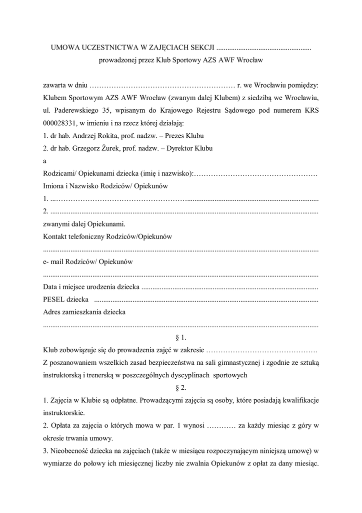 UMOWA UCZESTNICTWA W ZAJĘCIACH SEKCJI .................................................... prowadzonej przez Klub Sportowy AZS AWF Wrocław zawarta w dniu …………………………………………………… r. we Wrocławiu pomiędzy: Klubem Sportowym AZS AWF Wrocław (zwanym dalej Klubem) z siedzibą we Wrocławiu, ul. Paderewskiego 35, wpisanym do Krajowego Rejestru Sądowego pod numerem KRS 000028331, w imieniu i na rzecz której działają: 1. dr hab. Andrzej Rokita, prof. nadzw. – Prezes Klubu 2. dr hab. Grzegorz Żurek, prof. nadzw. – Dyrektor Klubu a Rodzicami/ Opiekunami dziecka (imię i nazwisko):…………………………………………… Imiona i Nazwisko Rodziców/ Opiekunów 1. ...………………………………………………........................................................................ 2. ................................................................................................................................................... zwanymi dalej Opiekunami. Kontakt telefoniczny Rodziców/Opiekunów ....................................................................................................................................................... e- mail Rodziców/ Opiekunów ....................................................................................................................................................... Data i miejsce urodzenia dziecka ................................................................................................. PESEL dziecka ........................................................................................................................... Adres zamieszkania dziecka ....................................................................................................................................................... § 1. Klub zobowiązuje się do prowadzenia zajęć w zakresie ………………………………………. Z poszanowaniem wszelkich zasad bezpieczeństwa na sali gimnastycznej i zgodnie ze sztuką instruktorską i trenerską w poszczególnych dyscyplinach sportowych § 2. 1. Zajęcia w Klubie są odpłatne. Prowadzącymi zajęcia są osoby, które posiadają kwalifikacje instruktorskie. 2. Opłata za zajęcia o których mowa w par. 1 wynosi ………… za każdy miesiąc z góry w okresie trwania umowy. 3. Nieobecność dziecka na zajęciach (także w miesiącu rozpoczynającym niniejszą umowę) w wymiarze do połowy ich miesięcznej liczby nie zwalnia Opiekunów z opłat za dany miesiąc. Opiekunowie dziecka są zobowiązani do wpłaty połowy opłaty za miejsce w danej grupie treningowej w razie nieobecności dziecka w wymiarze większym niż połowa miesięcznej liczby treningów, jeśli dziecko zamierza w następnych miesiącach kontynuować uczestnictwo w zajęciach. 4. Zmiana stawki wymaga aneksu do umowy 5. Opłata za zajęcia, w których stawka miesięczna jest uzależniona od liczby godzin i treningów w danym miesiącu, przez cały czas trwania umowy, będzie dokonywana co miesiąc wg następującego harmonogramu: Wrzesień 2014.......................................... Luty 2015 .............................................. zł. Październik 2014 ..................................... Marzec 2015 ......................................... zł. Listopad 2014 .......................................... Kwiecień 2015 ...................................... zł. Grudzień 2014 ......................................... Maj 2015 ............................................... zł. Styczeń 2015 ........................................... Czerwiec 2015 ...................................... zł. 6. opłata za zajęcia indywidualne wynosi 70,00 zł./godzinę zegarową § 3. Opiekunowie zobowiązują się do: 1. Dokonywania opłat za uczestnictwo dziecka w zajęciach prowadzonych przez Klub do 10 dnia każdego miesiąca (za dany miesiąc). 2. Niezwłocznego informowania prowadzących zajęcia w Klubie w przypadku wystąpienia przeciwwskazań medycznych do udziału dziecka w zajęciach. W takich przypadkach istotne jest skuteczne poinformowanie osób prowadzących ( trenerów), bądź sekretariat klubu (tel. 71 348 39 28, e-mail: [email protected]). 3. Wykupieniu ( raz na 12 miesięcy) legitymacji członkowskiej KS AZS-AWF Wrocław , która jest jednocześnie dokumentem potwierdzającym ubezpieczenie dziecka od następstw nieszczęśliwych wypadków na czas roku akademickiego tzn. od 01.10.2014 do 30.09.2015. § 4. 1. Opłaty za zajęcia oraz zapłata składki ubezpieczenia powinny być dokonywane na rachunek bankowy prowadzony przez BZWBK o nr: ................................................................. z dopiskiem w tytule wpłat danych: OPŁATA ZA TRENINGI W MIESIĄCU ......... (rok), IMIĘ I NAZWISKO DZIECKA ORAZ NAZWISKO TRENERA PROWADZĄCEGO (JAKO OSOBNA WPŁATA) I OPŁATA ZA LEGITYMACJE – IMIĘ I NAZWISKO DZIECKA ( JAKO OSOBNA WPŁATA) 2. Za datę dokonania zapłaty uznaje się dzień wpływu środków pieniężnych na wymieniony rachunek bankowy. Uchybienie terminowi płatności za poszczególne miesiące spowoduje brak możliwości uczestnictwa w dalszych treningach do chwili uregulowania zaległości.. § 5. 1. W przypadku rozwiązania umowy, Opiekunowie zobowiązani są do uregulowania opłaty za zajęcia do miesiąca, w którym nastąpiło rozwiązanie umowy włącznie, niezależnie w którym dniu miesiąca to nastąpiło oraz wszystkich innych należnych Klubowi zaległych płatności wraz z wymagalnymi odsetkami w terminie 30 dni od daty rozwiązania umowy na rachunek bankowy określony w § 4. 2. Klub zastrzega sobie prawo do rozwiązania umowy bez zachowania terminu wypowiedzenia w przypadku zalegania z płatnością za zajęcia za dwa pełne okresy płatności. § 6. 1. Umowa niniejsza zawarta jest na czas określony i wiąże strony od dnia podpisania do dnia 30 czerwca 2015r. 2. Umowa może zostać rozwiązana przez każdą ze stron za 2-m