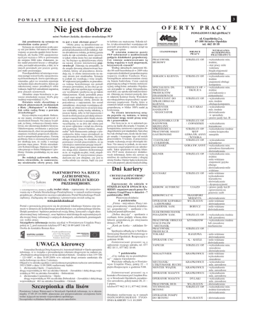 3 POWIAT STR Z E LE C K I Nie jest dobrze OFERTY PRACY POWIATOWY URZ¥D PRACY mówi Norbert Jaskó³a, dyrektor strzeleckiego PUP Jak przedstawia siê sytuacja na strzeleckim rynku pracy? Sytuacja na strzeleckim rynku pracy nie jest dobra. Od marca br odnotowujemy co prawda spadek iloci bezrobotnych, ale liczba 2302 zarejestrowanych jest wy¿sza o 30% w porównaniu do sierpnia 2008 roku. Za³amanie, jakie nadal przyniós³ kryzys z ubieg³ego roku, jest nadal odczuwalne, a fakt, ¿e w innych powiatach jest jeszcze gorzej, jest ma³o pocieszaj¹cy. Prawdopodobnie od miesi¹ca wrzenia nast¹pi wzrost liczby zarejestrowanych bezrobotnych. Jest to zjawisko powtarzalne, gdy¿ we wrzeniu rejestruje siê bardzo du¿o absolwentów, którzy po zakoñczonej nauce przed³u¿yli sobie wakacje, b¹d byli zatrudnieni zagranic¹ przy pracach sezonowych. Aktualnie stopa bezrobocia w powiecie strzeleckim wynosi 10,6% przy redniej wojewódzkiej 11,3%. Ostatnio wiele s³yszelimy o du¿ych planowanych zwolnieniach z Huty Ma³apanew w Ozimku. Jak sobie radz¹ firmy z powiatu strzeleckiego? Kryzys dotyka wszystkich. Dobrze, ¿e nie mamy zwolnieñ grupowych w strzeleckich firmach. Nie znaczy to jednak, ¿e firmy, zw³aszcza z bran¿y metalowej, nie odczuwaj¹ skutków kryzysu. Odnotowujemy zwolnienia z przyczyn ekonomicznych, choæ nie posiadaj¹ one znamion zwolnieñ grupowych okrelonych w przepisach prawa pracy. Zreszt¹ problemy firm w ociennych powiatach te¿ skutkuj¹ tym, ¿e osoby z naszego powiatu tr¹c¹ prace. Wielu mieszkañców Kolonowskiego, Staniszcz czy Spóroka pracuje w firmie Ma³apanew i problemy Ozimka przek³adaj¹ siê na nasz powiat. Do redakcji zadzwoni³a osoba, która stwierdzi³a, ¿e zamieszczamy nieaktualne oferty pracy. Jak to jest z tymi ofertami pracy? Oferty pracy s¹ aktualizowane co najmniej dwa razy w tygodniu i zawsze przed przekazaniem ich do redakcji. Jedno-dwudniowa zw³oka, po której gazeta trafia do r¹k czytelnika, mo¿e sprawiæ, i¿ jaka oferta mo¿e byæ ju¿ nieaktualna. Na bie¿¹co s¹ aktualizowane oferty na naszej stronie internetowej pupstrzelce.pl Zdarzaj¹ siê przypadki, ¿e do urzêdu dzwoni¹ zdenerwowani bezrobotni, którzy od pracodawcy dowiaduj¹ siê, i¿ oferta umieszczona na naszej stronie jest nieaktualna. Sytuacje te jednak nie wynikaj¹ z winy urzêdu. W wiêkszoci przypadków, to pracodawca widz¹c bezrobotnego nie potrafi otwarcie powiedzieæ, ¿e nie chce go zatrudniæ, gdy¿ nie spe³nia jego wymagañ, czy wyobra¿eñ i pozbywa siê go takim t³umaczeniem. Kiedy porednik pracy czyli nasz urz¹d - dowiaduje siê o takiej dezaktualizacji oferty, dzwoni do pracodawcy z zapytaniem, kto zosta³ zatrudniony, otrzymuje wymijaj¹c¹ odpowied, ¿e w³aciwie to on na tym miejscu widzia³by osobê trochê m³odsz¹, a jeszcze lepiej, ¿eby to by³ mê¿czyzna i niech ta oferta jeszcze jest dalej umieszczona w naszej bazie ofert. Kiedy stwierdzimy, ¿e jest to nie w porz¹dku i ofertê wycofujemy, to za dwa dni oferta jest na nowo zg³aszana i urz¹d ma obowi¹zek j¹ przyj¹æ. Jeszcze bardziej oryginalne by³o t³umaczenie jednego z pracodawców, który wrêcz owiadczy³, ¿e na zg³oszon¹ do urzêdu ofertê Na razie nikogo nie przyjmê, bo chcia³em tylko postraszyæ swoich pracowników, ¿e na ich miejsce zamierzam przyj¹æ innych. Oferty pracy przyjmowane przez urz¹d nie mog¹ mieæ znamion dyskryminacji m.in. ze wzglêdu na p³eæ, wiek, niepe³nosprawnoæ. W rzeczywistoci pracodawcom nie jest obojêtne, czy jest to osoba m³oda czy starsza, b¹d czy jest PARTNERSTWO NA RZECZ ZATRUDNIENIA. PORTAL STRZELECKIEGO PRZEDSIÊBIORY. Przedsiêbiorco, mikro, ma³y, redni i du¿y zapraszamy do zarejestrowania siê w Portalu Strzeleckiego Przedsiêbiorcy w ramach realizowanego projektu pn: Partnerstwo na rzecz zatrudnienia. Portal Strzeleckiego Przedsiêbiorcy. Zachêcamy do wspó³pracy i promowania swoich us³ug na: www.portal-strzelce.pl Portal z pewnoci¹ przyczyni siê do promocji lokalnego biznesu oraz pomo¿e w dotarciu do konkretnego przedsiêbiorcy czy potencjalnego klienta. Dziêki portalowi bêdziesz promowa³ swoj¹ firmê, korzysta³ z ci¹gle aktualizowanej bazy informacji , oraz bêdziesz mia³ dostêp do najwa¿niejszych dla twojej firmy informacji o unijnych dotacjach, szkoleniach, przetargach czy rynku pracy. Szczegó³owe informacje mo¿na uzyskaæ w Powiatowym Urzêdzie Pracy pokój nr 2, pod numerem telefonu 077 462 18 09 lu603 316 455. Osoba do kontaktu Roman Kus Projekt wspó³finansowany przez Uniê Europejsk¹ w ramach Europejskiego Funduszu Spo³ecznego UWAGA kierowcy Generalna Dyrekcja Dróg Krajowych i Autostrad Oddzia³ w Opolu uprzejmie informuje, i¿ w zwi¹zku z prowadzonymi robotami drogowymi na zadaniu pn. Przebudowa drogi krajowej nr 46 na odcinku Ozimek Grodziec w km 119+380 121+800, w dniu 18.09.2009r w/w odcinek drogi zostanie zamkniêty dla ruchu ko³owego na okres 2 miesiêcy. Objazd w/w odcinka zgodnie z zatwierdzonym projektem ruchu (nr zatwierdzenia 292/1/2009 z dnia 11.09.2009) realizowany bêdzie: 1. dla kierunku Opole Czêstochowa: drog¹ wojewódzk¹ nr 463 na odcinku Ozimek Zawadzkie i dalej drog¹ wojewódzk¹ nr 901 na odcinku Zawadzkie Dobrodzieñ. 2. dla kierunku Czêstochowa Opole: drogê wojewódzk¹ nr 901 na odcinku Dobrodzieñ Zawadzkie i dalej drog¹ wojewódzk¹ nr 463 na odcinku Zawadzkie Ozimek. Szczepionka dla lisów Powiatowy Lekarz Weterynarii w Strzelcach Opolskich informuje, ¿e w okresie miêdzy 27.0905.10.2009r. planowane jest przeprowadzenie szczepienia lisów wolno ¿yj¹cych na terenie województwa opolskiego. Szczepionka wyk³adana bêdzie przy u¿yciu samolotów. to kobieta czy mê¿czyzna. Szkoda tylko, i¿ taka nierzetelna i wymijaj¹ca odpowied pracodawcy nara¿a urz¹d na negatywne opinie. W ostatnim numerze gazety PUP informowa³ o mo¿liwociach podjêcia dzia³alnoci gospodarczej. Czy istnieje zainteresowanie t¹ form¹ wsparcia w tych niepewnych, kryzysowych czasach? Wed³ug 