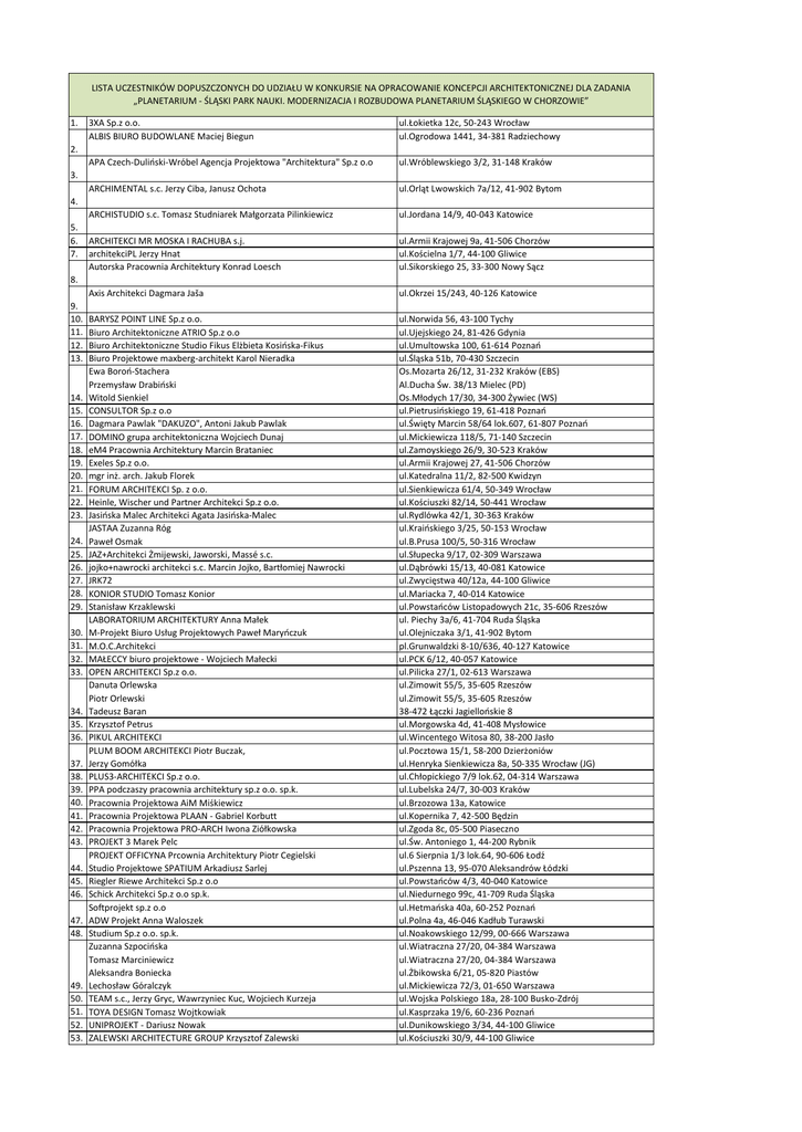 LISTA UCZESTNIKÓW DOPUSZCZONYCH DO UDZIAŁU W KONKURSIE NA OPRACOWANIE KONCEPCJI ARCHITEKTONICZNEJ DLA ZADANIA „PLANETARIUM - ŚLĄSKI PARK NAUKI. MODERNIZACJA I ROZBUDOWA PLANETARIUM ŚLĄSKIEGO W CHORZOWIE” 1. 3XA Sp.z o.o. ALBIS BIURO BUDOWLANE Maciej Biegun ul.Łokietka 12c, 50-243 Wrocław ul.Ogrodowa 1441, 34-381 Radziechowy APA Czech-Duliński-Wróbel Agencja Projektowa "Architektura" Sp.z o.o ul.Wróblewskiego 3/2, 31-148 Kraków ARCHIMENTAL s.c. Jerzy Ciba, Janusz Ochota ul.Orląt Lwowskich 7a/12, 41-902 Bytom ARCHISTUDIO s.c. Tomasz Studniarek Małgorzata Pilinkiewicz ul.Jordana 14/9, 40-043 Katowice ARCHITEKCI MR MOSKA I RACHUBA s.j. architekciPL Jerzy Hnat Autorska Pracownia Architektury Konrad Loesch ul.Armii Krajowej 9a, 41-506 Chorzów ul.Kościelna 1/7, 44-100 Gliwice ul.Sikorskiego 25, 33-300 Nowy Sącz Axis Architekci Dagmara Jaša ul.Okrzei 15/243, 40-126 Katowice BARYSZ POINT LINE Sp.z o.o. Biuro Architektoniczne ATRIO Sp.z o.o Biuro Architektoniczne Studio Fikus Elżbieta Kosińska-Fikus Biuro Projektowe maxberg-architekt Karol Nieradka Ewa Boroń-Stachera Przemysław Drabiński Witold Sienkiel CONSULTOR Sp.z o.o Dagmara Pawlak "DAKUZO", Antoni Jakub Pawlak DOMINO grupa architektoniczna Wojciech Dunaj eM4 Pracownia Architektury Marcin Brataniec Exeles Sp.z o.o. mgr inż. arch. Jakub Florek FORUM ARCHITEKCI Sp. z o.o. Heinle, Wischer und Partner Architekci Sp.z o.o. Jasińska Malec Architekci Agata Jasińska-Malec JASTAA Zuzanna Róg Paweł Osmak JAZ+Architekci Żmijewski, Jaworski, Massé s.c. jojko+nawrocki architekci s.c. Marcin Jojko, Bartłomiej Nawrocki JRK72 KONIOR STUDIO Tomasz Konior Stanisław Krzaklewski LABORATORIUM ARCHITEKTURY Anna Małek M-Projekt Biuro Usług Projektowych Paweł Maryńczuk M.O.C.Architekci MAŁECCY biuro projektowe - Wojciech Małecki OPEN ARCHITEKCI Sp.z o.o. Danuta Orlewska Piotr Orlewski Tadeusz Baran Krzysztof Petrus PIKUL ARCHITEKCI PLUM BOOM ARCHITEKCI Piotr Buczak, Jerzy Gomółka PLUS3-ARCHITEKCI Sp.z o.o. PPA podczaszy pracownia architektury sp.z o.o. sp.k. Pracownia Projektowa AiM Miśkiewicz Pracownia Projektowa PLAAN - Gabriel Korbutt Pracownia Projektowa PRO-ARCH Iwona Ziółkowska PROJEKT 3 Marek Pelc PROJEKT OFFICYNA Prcownia Architektury Piotr Cegielski Studio Projektowe SPATIUM Arkadiusz Sarlej Riegler Riewe Architekci Sp.z o.o Schick Architekci Sp.z o.o sp.k. Softprojekt sp.z o.o ADW Projekt Anna Waloszek Studium Sp.z o.o. sp.k. Zuzanna Szpocińska Tomasz Marciniewicz Aleksandra Boniecka Lechosław Góralczyk TEAM s.c., Jerzy Gryc, Wawrzyniec Kuc, Wojciech Kurzeja TOYA DESIGN Tomasz Wojtkowiak UNIPROJEKT - Dariusz Nowak ZALEWSKI ARCHITECTURE GROUP Krzysztof Zalewski ul.Norwida 56, 43-100 Tychy ul.Ujejskiego 24, 81-426 Gdynia ul.Umultowska 100, 61-614 Poznań ul.Śląska 51b, 70-430 Szczecin Os.Mozarta 26/12, 31-232 Kraków (EBS) Al.Ducha Św. 38/13 Mielec (PD) Os.Młodych 17/30, 34-300 Żywiec (WS) ul.Pietrusińskiego 19, 61-418 Poznań ul.Święty Marcin 58/64 lok.607, 61-807 Poznań ul.Mickiewicza 118/5, 71-140 Szczecin ul.Zamoyskiego 26/9, 30-523 Kraków ul.Armii Krajowej 27, 41-506 Chorzów ul.Katedralna 11/2, 82-500 Kwidzyn ul.Sienkiewicza 61/4, 50-349 Wrocław ul.Kościuszki 82/14, 50-441 Wrocław ul.Rydlówka 42/1, 30-363 Kraków ul.Kraińskiego 3/25, 50-153 Wrocław ul.B.Prusa 100/5, 50-316 Wrocław ul.Słupecka 9/17, 02-309 Warszawa ul.Dąbrówki 15/13, 40-081 Katowice ul.Zwycięstwa 40/12a, 44-100 Gliwice ul.Mariacka 7, 40-014 Katowice ul.Powstańców Listopadowych 21c, 35-606 Rzeszów ul. Piechy 3a/6, 41-704 Ruda Śląska ul.Olejniczaka 3/1, 41-902 Bytom pl.Grunwaldzki 8-10/636, 40-127 Katowice ul.PCK 6/12, 40-057 Katowice ul.Pilicka 27/1, 02-613 Warszawa ul.Zimowit 55/5, 35-605 Rzeszów ul.Zimowit 55/5, 35-605 Rzeszów 38-472 Łączki Jagiellońskie 8 ul.Morgowska 4d, 41-408 Mysłowice ul.Wincentego Witosa 80, 38-200 Jasło ul.Pocztowa 15/1, 58-200 Dzierżoniów ul.Henryka Sienkiewicza 8a, 50-335 Wrocław (JG) ul.Chłopickiego 7/9 lok.62, 04-314 Warszawa ul.Lubelska 24/7, 30-003 Kraków ul.Brzozowa 13a, Katowice ul.Kopernika 7, 42-500 Będzin ul.Zgoda 8c, 05-500 Piaseczno ul.Św. Antoniego 1, 44-200 Rybnik ul.6 Sierpnia 1/3 lok.64, 90-606 Łodź ul.Pszenna 13, 95-070 Aleksandrów Łódzki ul.Powstańców 4/3, 40-040 Katowice ul.Niedurnego 99c, 41-709 Ruda Śląska ul.Hetmańska 40a, 60-252 Poznań ul.Polna 4a, 46-046 Kadłub Turawski ul.Noakowskiego 12/99, 00-666 Warszawa ul.Wiatraczna 27/20, 04-384 Warszawa ul.Wiatraczna 27/20, 04-384 Warszawa ul.Żbikowska 6/21, 05-820 Piastów ul.Mickiewicza 72/3, 01-650 Warszawa ul.Wojska Polskiego 18a, 28-100 Busko-Zdrój ul.Kasprzaka 19/6, 60-236 Poznań ul.Dunikowskiego 3/34, 44-100 Gliwice ul.Kościuszki 30/9, 44-100 Gliwice 2. 3. 4. 5. 6. 7. 8. 9. 10. 11. 12. 13. 14. 15. 16. 17. 18. 19. 20. 21. 22. 23. 24. 25. 26. 27. 28. 29. 30. 31. 32. 33. 34. 35. 36. 37. 38. 39. 40. 41. 42. 43. 44. 45. 46. 47. 48. 49. 50. 51. 52. 53.
