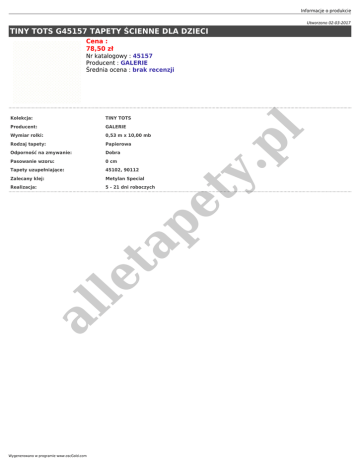 Informacje o produkcie Utworzono 02-03-2017 TINY TOTS G45157 TAPETY ŚCIENNE DLA DZIECI Cena : 78,50 zł Producent: GALERIE Wymiar rolki: 0,53 m x 10,00 mb Rodzaj tapety: Papierowa Odporność na zmywanie: Dobra Pasowanie wzoru: 0 cm Tapety uzupełniające: 45102, 90112 Zalecany klej: Metylan Special Realizacja: 5 - 21 dni roboczych ty TINY TOTS al le ta pe Kolekcja: .p l Nr katalogowy : 45157 Producent : GALERIE Średnia ocena : brak recenzji Wygenerowano w programie www.oscGold.com