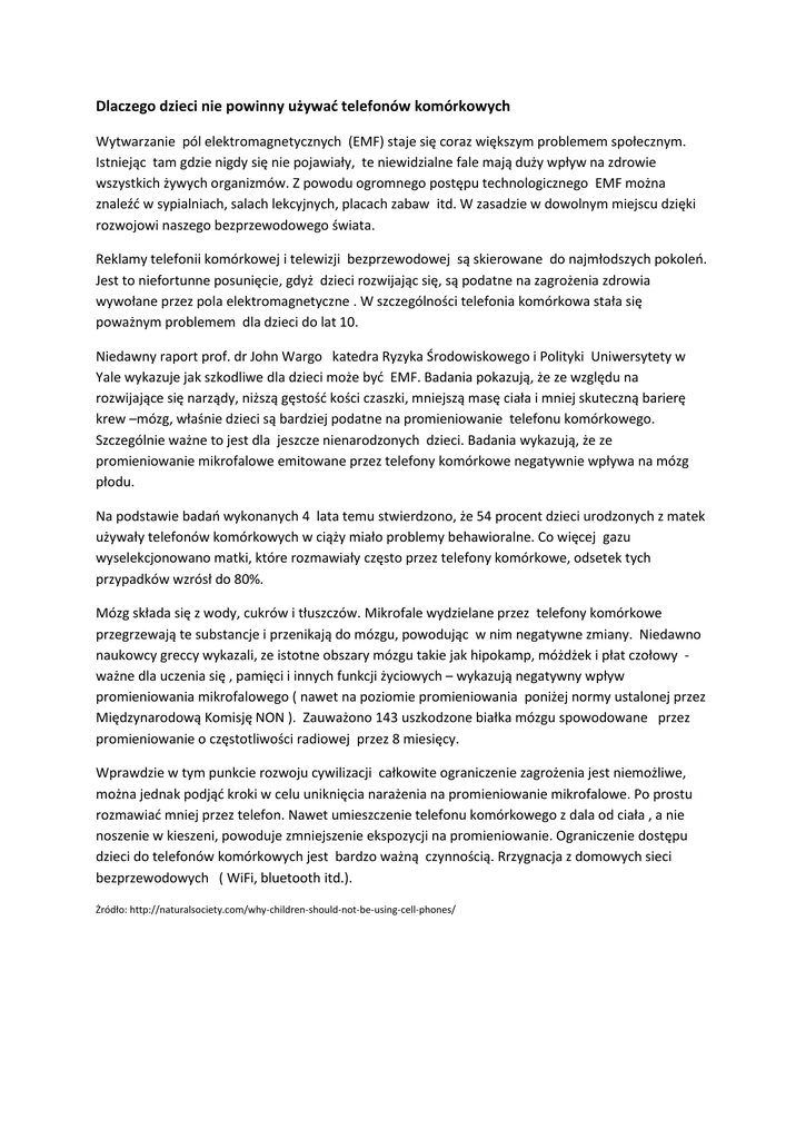Dlaczego dzieci nie powinny używać telefonów komórkowych Wytwarzanie pól elektromagnetycznych (EMF) staje się coraz większym problemem społecznym. Istniejąc tam gdzie nigdy się nie pojawiały, te niewidzialne fale mają duży wpływ na zdrowie wszystkich żywych organizmów. Z powodu ogromnego postępu technologicznego EMF można znaleźć w sypialniach, salach lekcyjnych, placach zabaw itd. W zasadzie w dowolnym miejscu dzięki rozwojowi naszego bezprzewodowego świata. Reklamy telefonii komórkowej i telewizji bezprzewodowej są skierowane do najmłodszych pokoleń. Jest to niefortunne posunięcie, gdyż dzieci rozwijając się, są podatne na zagrożenia zdrowia wywołane przez pola elektromagnetyczne . W szczególności telefonia komórkowa stała się poważnym problemem dla dzieci do lat 10. Niedawny raport prof. dr John Wargo katedra Ryzyka Środowiskowego i Polityki Uniwersytety w Yale wykazuje jak szkodliwe dla dzieci może być EMF. Badania pokazują, że ze względu na rozwijające się narządy, niższą gęstość kości czaszki, mniejszą masę ciała i mniej skuteczną barierę krew –mózg, właśnie dzieci są bardziej podatne na promieniowanie telefonu komórkowego. Szczególnie ważne to jest dla jeszcze nienarodzonych dzieci. Badania wykazują, że ze promieniowanie mikrofalowe emitowane przez telefony komórkowe negatywnie wpływa na mózg płodu. Na podstawie badań wykonanych 4 lata temu stwierdzono, że 54 procent dzieci urodzonych z matek używały telefonów komórkowych w ciąży miało problemy behawioralne. Co więcej gazu wyselekcjonowano matki, które rozmawiały często przez telefony komórkowe, odsetek tych przypadków wzrósł do 80%. Mózg składa się z wody, cukrów i tłuszczów. Mikrofale wydzielane przez telefony komórkowe przegrzewają te substancje i przenikają do mózgu, powodując w nim negatywne zmiany. Niedawno naukowcy greccy wykazali, ze istotne obszary mózgu takie jak hipokamp, móżdżek i płat czołowy ważne dla uczenia się , pamięci i innych funkcji życiowych – wykazują negatywny wpływ promieniowania mikrofalowego ( nawet na poziomie promieniowania poniżej normy ustalonej przez Międzynarodową Komisję NON ). Zauważono 143 uszkodzone białka mózgu spowodowane przez promieniowanie o częstotliwości radiowej przez 8 miesięcy. Wprawdzie w tym punkcie rozwoju cywilizacji całkowite ograniczenie zagrożenia jest niemożliwe, można jednak podjąć kroki w celu uniknięcia narażenia na promieniowanie mikrofalowe. Po prostu rozmawiać mniej przez telefon. Nawet umieszczenie telefonu komórkowego z dala od ciała , a nie noszenie w kieszeni, powoduje zmniejszenie ekspozycji na promieniowanie. Ograniczenie dostępu dzieci do telefonów komórkowych jest bardzo ważną czynnością. Rrzygnacja z domowych sieci bezprzewodowych ( WiFi, bluetooth itd.). Żródło: http://naturalsociety.com/why-children-should-not-be-using-cell-phones/