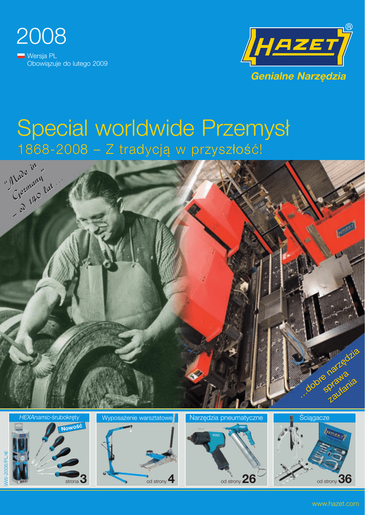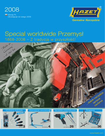 2008 Wersja PL Obowiązuje do lutego 2009 Genialne Narzędzia Special worldwide Przemysł 1868-2008 – Z tradycją w przyszłość! in e ad ny” “M rma lat … e G 140 od – zia d ę rz a n e awa a r b r i do sp fan u … za HEXAnamic-śrubokręty Wyposażenie warsztatowe Narzędzia pneumatyczne Ściągacze WW-2008/PL/€ ć Nowoś strona 3 od strony 4 od strony 26 od strony 36 www.hazet.com Diagnozowanie Special worldwide Boreskop (lupa do otworów) Z żarówką 2,5V XHL- lampa ręczna xenonowa i uchwytem na baterie w kpl. baterie • do otworów od d 1 mm z możliwością • do wizualnej kontroli miejsc trudno dostępnych podglądu do głębokości 250 mm gołym okiem np. zamki samochodu, • powiększenie 10-krotne otwory, wtryskiwacze • 17 soczewek pozwalających na kontrolę • możliwa praca bez okularów obiektów w odległości od 5 do 250 mm • ze zintegrowanym systemem odległości – podświetlonym • w kpl. zatrzask 4810-5 EAN-No. 4000896127214 • waga tylko 100 gr. Cena specjalna 199,– W Profesjonalny endoskop 6 mm d (Zimne światło) do diagnozowania uszkodzonych elementów wraz z bateriami oraz osłoną na oko • przy pokręcaniu endoskopem mamy gwarancję pełnego pola widzenia oglądanego obiektu • 4x jaśniejszy od dotychczasowych endoskopów dzięki zastosowaniu lampy xenonowej (15.000 lux w odległości od 16 mm) • stopniowe pokręcanie fokusem (okular) pozwala uzyskać wyraźny obraz • wyłącznik z możliwością regulacji siły światła • wysokiej jakości obraz z możliwością uzyskania zmiennej ogniskowej i większą niż 7000 fazami obrazu, 50.000 lux • duże pole widzenia (50˚) • minimalny promień gięcia (30 mm) do kontroli miejsc trudno dostępnych np. przewody, węże • specjalny układ soczewek poprawia jakość obrazu i kolorów • odporny na działanie wody, krótkie kontakty z benzyną i olejem dozwolone • szybki montaż uchwytu do przyrządu umożliwia system bagnetowy(opatentowany) praktyczna walizka z plastiku z wkładem miękkiej wykładziny pozwala na bezpieczne przechowywanie wraz z częściami dodatkowymi. • temperatura pracy i przechowywania -20 ± 55 • osłona na oko dla użytkowników okularów • długość sondy 1000 mm (gięta) • minimalny zakres odległości od obiektu 10 mm • przyrząd mobilny – przy użyciu baterii tzw. suchych dostępnych w handlu (praca do 10 godz.) • przy użyciu adapterów 90/110 z bocznym lusterkiem średnica badanego obiektu pozostaje niezmienna – 6 mm • wyposażenie opcjonalne – adapter z lusterkiem do miejsc trudno dostępnych 90 4811-2 lub 110 4811-3 Niezastąpiony przy pracach wymagających diagnozy np. do kontroli jakości, ustalenia uszkodzeń, diagnozowania zamkniętych powierzchni np. Przemysł: • Maszyny CNC, przekładnie planetarne, łożyska i wiele innych • Kontrola jakości powierzchni wewnętrznych, spawów, połączeń nitowych, połączeń śrubowych, otworów po wierceniach, gwintów itd. Przemysł lotniczy • samoloty sportowe z silnikami, śmigłowce, podwozia, komory spalania, zawory itp. Budownictwo • kontrola starych murów, kanałów prowadzenia przewodów, rur itp. Warsztat samochodowy, samochodów użytkowych, motocykli, łodzi. • kontrola silników, powierzchni cylindrów, zaworów, pompy olejowej, miski olejowej, skrzyni biegów itp. • diagnozowanie nieszczelności np. w układzie chłodzenia, katalizatora, powierzchni zamkniętych w karoserii, podwozia, skrzyni biegów, łożysk, i wiele innych XSWT UYV m in . 30 m m m in .3 0 m m Oprzyrządowanie dodatkowe Adapter 90˚ i 110˚ z lusterkiem bocznym • średnica sondy 6 mm pozostaje zachowana • dokładne mocowanie pomiędzy sondą, a przyrządem zabezpiecza przed zgubieniem adapteru • pole widzenia 40˚ 1 얒 6 mm • Zakres dostawy Endoskop 4811-1/2 składa się z: – endoskop – osłona na oko – uchyt na 3 baterie (LR14) 4811-1/2 90° 40° EAN-No. Cena 4000896+ specjalna ø 109685 115891 75,– 75,– 110° Możliwe zastosowania przyrządu: EAN-No. 4000896109678 Cena specjalna 653,– W Wszystkie podane ceny są cenami netto bez VAT 2 4811-2 4811-3 40° www.hazet.com uszkodzenia mostów Miejsca trudno dostępne napędowych (np. szyberdach, progi, słupki) zawór Komory spalania uszkodzenia skrzyni biegów HEXAnamic-Śrubokręty Nowy program śrubokrętów typu • 2 komponent (twardy): zapewnia trwałość części zewnętrznej Ergonomiczny uchwyt uformowany zgodnie z zaleceniami anatomii • 3 komponent (miękki): do optymalnego przenoszenia siły nacisku • zapobiega ześlizgiwaniu się zaolejonych dłoni • 1 pierwszy komponent (twardy): zapewnia optymalne mocowanie klingi śrubokrętu Nowość Genialne Narzędzia • 6 zgrubień na rękojeści celem przeniesienia optymalnej siły • poczerniony szpic do perfekcyjnej pracy w profilu śruby • 6-kąt w części początkowej rękojeści: – Optymalne zabezpieczenie przed poślizgiem – Na powierzchniach pochyłych zapobiega niekontrolowanemu obróceniu się śrubokręta • Optymalna wielkość do szybkiej pracy Obciążenie ręki Dotychczasowe śrubokręty Śrubokręt HEXAnamic Rękojeść HEXAnamic = zielony kolor niewielkie obciążenie Rękojeści Dotychczasowe = wysokie obciążenie stały moment obrotowy Nowy zestaw śrubokrętów 5 części Anatomicznie uformowane do perfekcyjnego połączenia dłoni ze śrubokrętem K L • 3 komponentowa rękojeść, ukształtowana wg nowych ergonomicznych badań naukowych w Niemczech – Komponent 1(twardy): zapewnia optymalne mocowanie klingi – Komponent 2(twardy): zapewnia trwałość części zewnętrznej – Komponent 3(miękki): zapewnia optymalne przeniesienie siły nacisku • 6 kąt na początku rękojeści zabezpiecza przed zsunięciem się dłoni oraz zapobiega niekontrolowanemu obróceniu się śrubokręta na powierzchniach pochyłych • zapobiega ześlizgiwaniu się zaolejonych dłoni • odporny na działanie benzyny, kwasów, płynu hamulcowego i