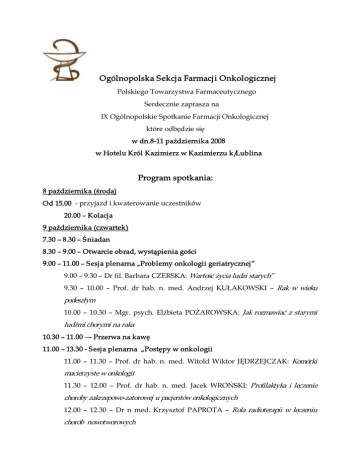 Ogólnopolska Sekcja Farmacj i Onkologicznej Polskiego Towarzystwa Farmaceutycznego Serdecznie zaprasza na IX Ogólnopolskie Spotkanie Farmacji Onkologicznej które odbędzie się w dn.811 pażdziernika 2008 w Hotelu Król Kazimierz w Kazimierzu k/Lublina Program spotkania: 8 października (środa) Od 15.00 przyjazd i kwaterowanie uczestników 20.00 – Kolacj a 9 października (czwartek) 7.30 – 8.30 – Śniadan 8.30 – 9.00 – Otwarcie obrad, wystąpienia gości 9.00 – 11.00 – Sesj a plenarna „Problemy onkologii geriatrycznej ” 9.00 – 9.30 – Dr fil. Barbara CZERSKA: Wartość życia ludzi starych” 9.30 – 10.00 – Prof. dr hab. n. med. Andrzej KUŁAKOWSKI – Rak w wieku podeszłym 10.00 – 10.30 – Mgr. psych. Elżbieta POŻAROWSKA: Jak rozmawiać z starymi ludźmi chorymi na raka 10.30 – 11.00 –– Przerwa na kawę 11.00 – 13.30 Sesj a plenarna „Postępy w onkologii 11.00 – 11.30 – Prof. dr hab. n. med. Witold Wiktor JĘDRZEJCZAK: Komórki macierzyste w onkologii 11.30 – 12.00 – Prof. dr hab. n. med. Jacek WROŃSKI: Profilaktyka i leczenie choroby zakrzepowozatorowej u pacjentów onkologicznych 12.00 – 12.30 – Dr n med. Krzysztof PAPROTA – Rola radioterapii w leczeniu chorób nowotworowych 12.30 – 13.00 Prof. dr hab. med. Krzysztof WARZOCHA: Ewolucja leczenia nudności i wymiotów w przebiegu chemioterapii. 13.00 – 13.15 Dr n. farm. Jerzy ŁAZOWSKI: Molekularne mechanizmy działania palonosetronu 13.15 – 15.15 – Przerwa obiadowa 15.15 – 15.30 – Klaus MEIER (prezes ESOP) – Współpraca ESOP z ECCO. 15.30 – 17.15 – Doniesienia uczestników Spotkania · Dr Agnieszka ZIMMERMANN – Leki sieroce · Mgr Anna WIECZOREK, mgr Jowita PIOTROWSKA – Praktyka farmaceutyczna w pracowni leku cytotoksycznego, a rozbieżność danych z firm farmaceutycznych · Mgr Danuta PARTYKA, mgr Agnieszka PESTKA, dr Hanna JANKOWIAK GRACZ, mgr Ewelina KORCZOWSKA: Zastosowanie urydyny w zespole „ręka stopa” · Prof. dr Edmund GRZEŚKOWIAK, dr Hanna JANKOWIAKGRACZ, mgr Marcin NOWAK, mgr Ewa NAROŻNY: Trwałość 5Fluorouracylu · Dr Hanna JANKOWIAKGRACZ, Hanna HELLERMAKOSZ: Kryteria oceny systemów bezigłowych w farmacji onkologicznej 17.15 – 17.45 – Wioletta SEKULAR Systemy sporządzania roztworów cytostatyków 20.00 Kolacj a 10 pażdziernika (piątek) 7.30 – 9.00 – Śniadanie 9.00 – 9.30 – Prof. dr hab. n. farm. Jerzy PAŁKA – Nowe leki w onkologii 9.30 – 10.00 Dr Hanna JANKOWIAKGRACZ – Sunitynib w leczeniu raka nerki 10.00 – 10.30 – Prezentacje firm farmaceutycznych · Ekonomiczna analiza porównawcza podawania fludarabiny drogą dożylną i doustną (Fludara Oral) – badanie pilotażowe (Bayer HealthCare) – 15 min · Bezpieczne linie naczyniowe (B.Braun) – 15 min 10.30 – 11.00 – Przerwa na kawę 11.00 – 13.15 – Warsztaty prowadzone przez fmy B. Braun i Baxter n.t bezpiecznego przygotowywania i podawania cytostatyków 13.15 – 15.15 – Przerwa obiadowa 15.15 – 17.15– Spotkania dyskusyj ne w grupach (grupy maksymalnie 25 osobowe) · Dlaczego prawo farmaceutyczne nie jest przestrzegane – moderator dr H. JankowiakGracz · Współpraca apteki szpitalnej z dyrekcją szpitala – moderator mgr Anna Wieczorek · Jakość informacji o lekach dostarczane przez przedstawicieli firm farmaceutycznych – moderator dr Krystyna ChmalJagiełło · Jak tworzyć atmosferę dobrej współpracy z lekarzamionkologami? – moderator prof. dr Anna WielaHojeńska 20.00 – Kolacj a 11 października (sobota) 7.30 – 9.00 Śniadanie 9.00 – 10.00 – Prezentacja standardów w farmacji onkologicznej (dr K. Chmal Jagiełło, dr H. Jankowiak Gracz, mgr H. Kuźniar) 10.00 – 10.30 Posumowanie spotkań dyskusyjnych w dn. 10 października 10.30 – 11.15 – Informacja o działalności Ogólnopolskiej Sekcji Farmacji Onkologicznej · Informacja o Europejskiej Konferencji Farmacji Onkologicznej Hamburg 2008 · Informacja o V PolskoNiemieckiej Konferencji Farmacji Onkologicznej – Frankfurt 2008 · Sprawozdanie z XI Międzynarodowego Sympozjum Farmacji Onkologicznej w Anaheim (USA) · Sprawozdanie z warsztatów n.t. standardów jakości Quapos w Luksemburgu · Plany działania Sekcji na 2009 r. 11.15 Zakończenie IX Ogólnopolskiego Spotkania Farmacji Onkologicznej Do zobaczenia w Kazimierzu Organizatorzy Spotkania Przewodniczący Ogólnopolskiej Sekcj i Farmacj i Onkologicznej PTFarm Dr n. farm Jerzy Łazowski oraz Mgr farm. Bogumiła Julia Sobkowiak