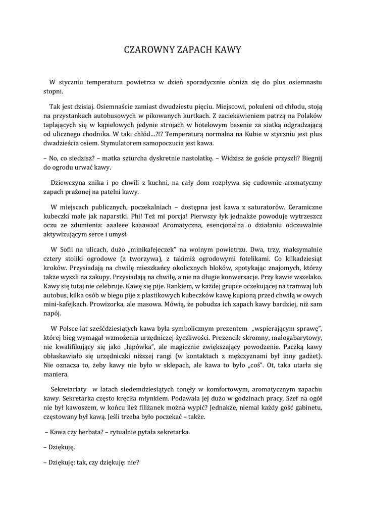 CZAROWNY ZAPACH KAWY W styczniu temperatura powietrza w dzień sporadycznie obniża się do plus osiemnastu stopni. Tak jest dzisiaj. Osiemnaście zamiast dwudziestu pięciu. Miejscowi, pokuleni od chłodu, stoją na przystankach autobusowych w pikowanych kurtkach. Z zaciekawieniem patrzą na Polaków taplających się w kąpielowych jedynie strojach w hotelowym basenie za siatką odgradzającą od ulicznego chodnika. W taki chłód…?!? Temperaturą normalna na Kubie w styczniu jest plus dwadzieścia osiem. Stymulatorem samopoczucia jest kawa. – No, co siedzisz? – matka szturcha dyskretnie nastolatkę. – Widzisz że goście przyszli? Biegnij do ogrodu urwać kawy. Dziewczyna znika i po chwili z kuchni, na cały dom rozpływa się cudownie aromatyczny zapach prażonej na patelni kawy. W miejscach publicznych, poczekalniach – dostępna jest kawa z saturatorów. Ceramiczne kubeczki małe jak naparstki. Phi! Też mi porcja! Pierwszy łyk jednakże powoduje wytrzeszcz oczu ze zdumienia: aaaleee kaaawaa! Aromatyczna, esencjonalna o działaniu odczuwalnie aktywizującym serce i umysł. W Sofii na ulicach, dużo „minikafejeczek” na wolnym powietrzu. Dwa, trzy, maksymalnie cztery stoliki ogrodowe (z tworzywa), z takimiż ogrodowymi fotelikami. Co kilkadziesiąt kroków. Przysiadają na chwilę mieszkańcy okolicznych bloków, spotykając znajomych, którzy także wyszli na zakupy. Przysiadają na chwilę, a nie na długie konwersacje. Przy kawie wszelako. Kawy się tutaj nie celebruje. Kawę się pije. Rankiem, w każdej grupce oczekującej na tramwaj lub autobus, kilka osób w biegu pije z plastikowych kubeczków kawę kupioną przed chwilą w owych mini-kafejkach. Prowizorka, ale masowa. Mówią, że pobudza ich zapach kawy bardziej, niż sam napój. W Polsce lat sześćdziesiątych kawa była symbolicznym prezentem „wspierającym sprawę”, której bieg wymagał wzmożenia urzędniczej życzliwości. Prezencik skromny, małogabarytowy, nie kwalifikujący się jako „łapówka”, ale magicznie zwiększający powodzenie. Paczką kawy obłaskawiało się urzędniczki niższej rangi (w kontaktach z mężczyznami był inny gadżet). Nie oznacza to, żeby kawy nie było w sklepach, ale kawa to było „coś”. Ot, taka utarła się maniera. Sekretariaty w latach siedemdziesiątych tonęły w komfortowym, aromatycznym zapachu kawy. Sekretarka często kręciła młynkiem. Podawała jej dużo w godzinach pracy. Szef na ogół nie był kawoszem, w końcu ileż filiżanek można wypić? Jednakże, niemal każdy gość gabinetu, częstowany był kawą. Jeśli trzeba było poczekać – także. – Kawa czy herbata? – rytualnie pytała sekretarka. – Dziękuję. – Dziękuję: tak, czy dziękuję: nie? Rytuał owego czasu. W pokojach biurowych, przed każdym niemal urzędnikiem, a na pewno przed każdą urzędniczką stała szklanka z wystygłą, niedopitą kawą. I oto hit: Słuchajcie!!! W SAM-ie mają elektryczny młynek!! Kupujesz kawę i ekspedientka na życzenie od razu ją miele! Naprawdę!!! „SAM” – sklep samoobsługowy, był wynalazkiem PSS „Społem”, symbolem postępu cywilizacyjnego i elegancji w ekspozycji towarów handlowych (Słuchaj, normalnie wchodzisz między półki i sama bierzesz z nich towar! Rozumiesz? Nie tak, że ekspedientka ci podaje. Sama sobie grzebiesz w towarach i wkładasz do koszyka co chcesz, a potem tylko idziesz do kasy. Masz wolność! Rozumiesz?). Tak więc, elektryczne młynki w sklepie w sposób widomy uświadamiały nam nowoczesność kraju, w którym żyjemy, pozwalały osobiście doświadczyć wkraczającego w nasze życie postępu technicznego. Ręczne natomiast młynki, w których mielono pachnące ziarenka kawy w ilości takiej – ile porcji było do zaparzenia, dyskretnie odchodziły w głąb kuchennych kredensów. Życie towarzyskie płynęło z nieodłącznym atrybutem, jakim była pachnąca kawa. Stanowiła nie tylko nieodłączną częścią każdego spotkania towarzyskiego a zwłaszcza przyjęciowego czy wręcz po prostu „wódkowego”. Toczyło się ono w licznych kawiarniach. Kawiarnie miały różnorodny wystrój i klimaty. Były to centra kontaktowe wszystkich grup wiekowych i wszystkich warstw społecznych poza lumpami. Już samo wejście do kawiarni, było wejściem w aromat kawy. A wewnątrz: eleganccy starsi panowie zatopieni w czasopismach lub niegłośno rozprawiający o czymś przy filiżance kawy, a to eleganckie panie jak kumoszki półgłosem przędące barwne i pełne oburzeń rewelacje przy kawie z ciasteczkiem, a to grupka młodzieży… Każda „paka” młodzieży miała swoją kawiarnię. Szło się tam w czasie wolnym i albo zastawało się kogoś ze znajomych, albo zamawiało kawę i czekało – lada chwila ktoś z paki na pewno zajrzy. Czas oczekiwania urozmaicał pianista lub skrzypek. Płynąc nutkami w zapachu kawy, będącym nieodłączną częścią wystroju kawiarni, rozwieszał popularne motywy muzyczne między stolikami w łagodnym, intymnym półmroku. A młodzi ludzie przy filiżankach kawy ćwiczyli się w sztuce interesującej konwersacji (wszak węzłowym elementem personalnym paki były nade wszystko dziewczyny!), ścigając się nierzadko w różnych popisach intelektualnych. Ileż to było wysiłku dla tego jednego, uważnego uśmiechu… W mojej kawiarni nie ma już pianisty, skrzypka, pluszowych foteli, infantylnej atmosfery, dyskretnego oświetlenia ani zapachu kawy. Jest sklep z dżinsami. W moim mieście nie ma już kawiarni z klimatami (może za wyjątkiem resztki po dawnej „WZ”, gdzie w niektóre dni, jak za czasów młodości, licznie gaworzą przy filiżaneczkach eleganckie panie z UTW). Samotni, eleganccy starsi panowie z filiżankami wystygłej kawy zatopieni w czasopismach, rozpierzchli się po kawiarenkach marketowych jak rodzynki w tanim cieście. Znużony dniem siadam na restauracyjnym tarasie. – Kawę poproszę. – W szklance…? – pyta siwowłosy kelner.