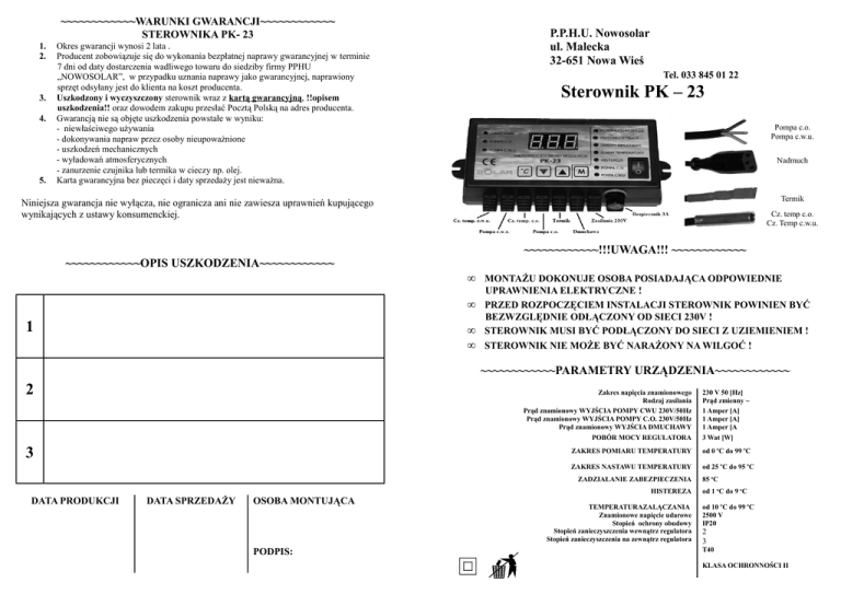 ~~~~~~~~~~~~WARUNKI GWARANCJI~~~~~~~~~~~~ P.P.H.U. Nowosolar ul. Malecka 32-651 Nowa Wieś STEROWNIKA PK- 23 1. 2. 3. 4. 5. Okres gwarancji wynosi 2 lata . Producent zobowiązuje się do wykonania bezpłatnej naprawy gwarancyjnej w terminie 7 dni od daty dostarczenia wadliwego towaru do siedziby firmy PPHU „NOWOSOLAR”, w przypadku uznania naprawy jako gwarancyjnej, naprawiony sprzęt odsyłany jest do klienta na koszt producenta. Uszkodzony i wyczyszczony sterownik wraz z kartą gwarancyjną, !!opisem uszkodzenia!! oraz dowodem zakupu przesłać Pocztą Polską na adres producenta. Gwarancją nie są objęte uszkodzenia powstałe w wyniku: - niewłaściwego używania - dokonywania napraw przez osoby nieupoważnione - uszkodzeń mechanicznych - wyładowań atmosferycznych - zanurzenie czujnika lub termika w cieczy np. olej. Karta gwarancyjna bez pieczęci i daty sprzedaży jest nieważna. Tel. 033 845 01 22 Sterownik PK – 23 Pompa c.o. Pompa c.w.u. Nadmuch Termik Niniejsza gwarancja nie wyłącza, nie ogranicza ani nie zawiesza uprawnień kupującego wynikających z ustawy konsumenckiej. Cz. temp c.o. Cz. Temp c.w.u. ~~~~~~~~~~~~!!!UWAGA!!! ~~~~~~~~~~~~ ~~~~~~~~~~~~OPIS USZKODZENIA~~~~~~~~~~~~ • MONTAŻU DOKONUJE OSOBA POSIADAJĄCA ODPOWIEDNIE • 1 • • UPRAWNIENIA ELEKTRYCZNE ! PRZED ROZPOCZĘCIEM INSTALACJI STEROWNIK POWINIEN BYĆ BEZWZGLĘDNIE ODŁĄCZONY OD SIECI 230V ! STEROWNIK MUSI BYĆ PODŁĄCZONY DO SIECI Z UZIEMIENIEM ! STEROWNIK NIE MOŻE BYĆ NARAŻONY NA WILGOĆ ! ~~~~~~~~~~~~PARAMETRY URZĄDZENIA~~~~~~~~~~~~ 2 Zakres napięcia znamionowego Rodzaj zasilania Prąd znamionowy WYJŚCIA POMPY CWU 230V/50Hz Prąd znamionowy WYJŚCIA POMPY C.O. 230V/50Hz Prąd znamionowy WYJŚCIA DMUCHAWY POBÓR MOCY REGULATORA 3 od 0 oC do 99 oC ZAKRES NASTAWU TEMPERATURY od 25 oC do 95 oC HISTEREZA DATA SPRZEDAŻY OSOBA MONTUJĄCA PODPIS: 3 Wat [W] ZAKRES POMIARU TEMPERATURY ZADZIAŁANIE ZABEZPIECZENIA DATA PRODUKCJI 230 V 50 [Hz] Prąd zmienny ~ 1 Amper [A] 1 Amper [A] 1 Amper [A TEMPERATURAZALĄCZANIA Znamionowe napięcie udarowe Stopień ochrony obudowy Stopień zanieczyszczenia wewnątrz regulatora Stopień zanieczyszczenia na zewnątrz regulatora 85 oC od 1 oC do 9 oC od 10 oC do 99 oC 2500 V IP20 2 3 T40 KLASA OCHRONNOŚCI II ~~~~~~~~~~~~FUNKCJE/PARAMETRY MENU~~~~~~~~~~~~ 1. PRZEDMUCH PRZERWA – wartość podana w minutach. Oznacza czas przerwy ~~~~~~~~~~~~MONTAŻ~~~~~~~~~~~~ 1. Przymocuj blachowkrętami stelaż pod sterownik do kotła c.o., a następnie przymocuj sterownik. 2. Czujnik wraz z termikiem (dodatkowe zabezpieczanie termiczne zapobiegające przegrzaniu – zagotowaniu wody w piecu – w postaci termika/ wyłącznik bimetalowy) umocuj na wyjściu (rurze) ciepłej wody z kotła i dokładnie oizoluj np. otuliną izolacyjną. !!! ZABRANIA SIĘ ZANURZANIA CZ. TEMP. ORAZ TERMIKA W CIECZY GROZI TO USZKODZENIEM STEROWNIKA I UTRATĄ GWARANCJI !!! 3. Przewody zasilające pompy powinny być podłączone wg oznaczeń na danej pompie. 4. Dmuchawę/wentylator podepnij odpowiednią wtyczką do sterownika. 5. Podłącz sterownik do sieci 230V. ~~~~~~~~~~~~INSTRUKCJA OBSŁUGI~~~~~~~~~~~~ Po włącznie sterownika odczekaj kilka sekund, aż sterownik wykona wewnętrzny test i na wyświetlaczu pojawi się właściwa temperatura którą wskazuje czujnik temp. w postaci XXo. Z tego miejsca są możliwe dwa kroki: 1. Krok pierwszy – edycja temperatury na kotle poprzez wciśnięcie 2. Krok drugi – wejście do MENU poprzez wciśniecie Ad. 1 (krok pierwszy) – ustawienie temp. kotła, lub chwilowe wył. nadmuchu - Od tej chwili na wyświetlaczu będzie migać wartość temperatury zadanej, oraz co równie ważne wyłączy się nadmuch. - Za pomocą klawiszy ustaw wymagana wartość. - ustawioną wartość zatwierdzamy klawiszem , dodatkowo załączy się wentylator. Pozostawienie sterownika w trybie edycji temperatur (migający wyświetlacz) grozi wygaśnięciem pieca ponieważ dmuchawa jest nieaktywna Ad. 2 (krok drugi) poruszanie się po MENU - Po wciśnięciu uaktywni się dioda wskazująca parametr „CZAS PRACY”, a na wyświetlaczu pojawi się jego wartość. - Poruszanie się w trybie Menu odbywa się za pomocą klawiszy , a sygnalizowane jest podświetleniem diody przy opisie 6 funkcji/ parametrów z prawej strony sterownika. - Wejście w tryb edycji danego parametru odbywa sie z pomocą . - Gdy wyświetlacz miga, można zmieniać jego wartość przyciskami - Wyjście z edycji danego parametru odbywa się za pomocą , , następnie aby opuścić MENU (wejście do MENU) 5x do parametru „POMPA C.O.”) lub analogicznie 1x (wejście do tego parametru) (ustawienie żądanej wartości) (wyjście z parametru do menu) MENU do wyświetlania aktualnej temperatury na czujniku) osiągnie temperaturę żądaną 2. PRZEDMUCH PRACA – wartość podana w sekundach. Oznacza czas pracy wentylatora od jego załączenia do wyłączenia. Dotyczy sytuacji gdy temperatura na kotle osiągnie temperaturę żądaną. 3. OBROTY DMUCHAWY – wartość „1” oznacza min. obroty „8” oznacza prace z max. prędkością. Sterownik zaprojektowany jest do współpracy z dmuchawą NWS 75 lub firm Ewmar lub M plus M. Biegi od 1 do 3 są biegami „rozruchowymi”. Nie ma natomiast gwarancji, iż inne dmuchawy nie będą sprawiać problemów- zwłaszcza na najniższych biegach. Nie należy używać biegów, z którymi dmuchawa nie chce działać poprawnie (nie startuje, zatrzymuje się po jakimś czasie). Stan ten może być spowodowany spadkiem napięć, zakłóceniami w instalacji elek. lub innym modelem dmuchawy. Grozi uszkodzeniem sterownika lub dmuchawy. 4. ALARM TEMPERATURY – jeśli temperatura pieca przekroczy wartość parametru, to sterownik przejdzie w tryb alarmowania. Na wyświetlaczy zacznie migać Er6, dmuchawa zostanie wyłączona, zaś obydwie pompy załączone. Alarm można skasować naciśnięciem dowolnego klawisza. Aby skasować alarm najpierw temperatura musi spaść poniżej temper