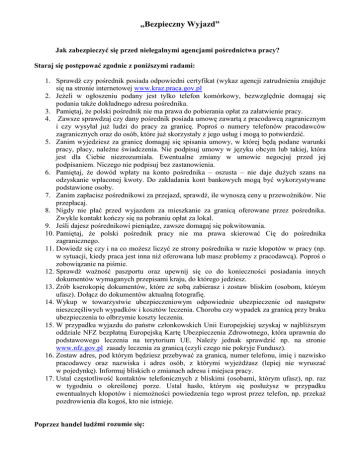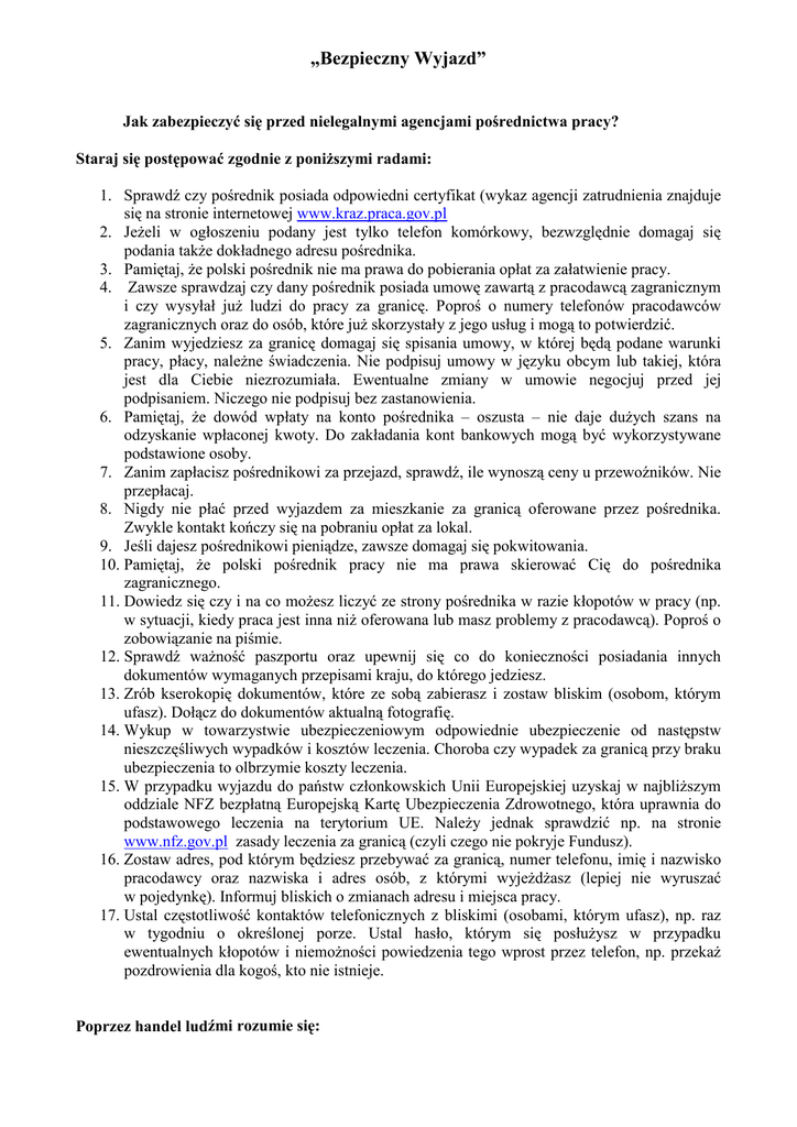 „Bezpieczny Wyjazd” Jak zabezpieczyć się przed nielegalnymi agencjami pośrednictwa pracy? Staraj się postępować zgodnie z poniższymi radami: 1. Sprawdź czy pośrednik posiada odpowiedni certyfikat (wykaz agencji zatrudnienia znajduje się na stronie internetowej www.kraz.praca.gov.pl 2. Jeżeli w ogłoszeniu podany jest tylko telefon komórkowy, bezwzględnie domagaj się podania także dokładnego adresu pośrednika. 3. Pamiętaj, że polski pośrednik nie ma prawa do pobierania opłat za załatwienie pracy. 4. Zawsze sprawdzaj czy dany pośrednik posiada umowę zawartą z pracodawcą zagranicznym i czy wysyłał już ludzi do pracy za granicę. Poproś o numery telefonów pracodawców zagranicznych oraz do osób, które już skorzystały z jego usług i mogą to potwierdzić. 5. Zanim wyjedziesz za granicę domagaj się spisania umowy, w której będą podane warunki pracy, płacy, należne świadczenia. Nie podpisuj umowy w języku obcym lub takiej, która jest dla Ciebie niezrozumiała. Ewentualne zmiany w umowie negocjuj przed jej podpisaniem. Niczego nie podpisuj bez zastanowienia. 6. Pamiętaj, że dowód wpłaty na konto pośrednika – oszusta – nie daje dużych szans na odzyskanie wpłaconej kwoty. Do zakładania kont bankowych mogą być wykorzystywane podstawione osoby. 7. Zanim zapłacisz pośrednikowi za przejazd, sprawdź, ile wynoszą ceny u przewoźników. Nie przepłacaj. 8. Nigdy nie płać przed wyjazdem za mieszkanie za granicą oferowane przez pośrednika. Zwykle kontakt kończy się na pobraniu opłat za lokal. 9. Jeśli dajesz pośrednikowi pieniądze, zawsze domagaj się pokwitowania. 10. Pamiętaj, że polski pośrednik pracy nie ma prawa skierować Cię do pośrednika zagranicznego. 11. Dowiedz się czy i na co możesz liczyć ze strony pośrednika w razie kłopotów w pracy (np. w sytuacji, kiedy praca jest inna niż oferowana lub masz problemy z pracodawcą). Poproś o zobowiązanie na piśmie. 12. Sprawdź ważność paszportu oraz upewnij się co do konieczności posiadania innych dokumentów wymaganych przepisami kraju, do którego jedziesz. 13. Zrób kserokopię dokumentów, które ze sobą zabierasz i zostaw bliskim (osobom, którym ufasz). Dołącz do dokumentów aktualną fotografię. 14. Wykup w towarzystwie ubezpieczeniowym odpowiednie ubezpieczenie od następstw nieszczęśliwych wypadków i kosztów leczenia. Choroba czy wypadek za granicą przy braku ubezpieczenia to olbrzymie koszty leczenia. 15. W przypadku wyjazdu do państw członkowskich Unii Europejskiej uzyskaj w najbliższym oddziale NFZ bezpłatną Europejską Kartę Ubezpieczenia Zdrowotnego, która uprawnia do podstawowego leczenia na terytorium UE. Należy jednak sprawdzić np. na stronie www.nfz.gov.pl zasady leczenia za granicą (czyli czego nie pokryje Fundusz). 16. Zostaw adres, pod którym będziesz przebywać za granicą, numer telefonu, imię i nazwisko pracodawcy oraz nazwiska i adres osób, z którymi wyjeżdżasz (lepiej nie wyruszać w pojedynkę). Informuj bliskich o zmianach adresu i miejsca pracy. 17. Ustal częstotliwość kontaktów telefonicznych z bliskimi (osobami, którym ufasz), np. raz w tygodniu o określonej porze. Ustal hasło, którym się posłużysz w przypadku ewentualnych kłopotów i niemożności powiedzenia tego wprost przez telefon, np. przekaż pozdrowienia dla kogoś, kto nie istnieje. Poprzez handel ludźmi rozumie się: Wynajmowanie, przewożenie, przechowywanie, przyjmowanie osób przy stosowaniu gróźb, użyciu siły czy innych form przymusu, porwania, podstępu, kłamstwa, nadużycia władzy, wykorzystania bezsilności osoby z zamiarem wykorzystywania tych osób w celu prac przymusowych, pobierania organów, niewolnictwa i praktyk zbliżonych do niewolnictwa, zmuszania do prostytucji i innych form wykorzystywania seksualnego. Formy handlu: • • • • • • Handel ludźmi w celu wykorzystania ich w przemyśle erotycznym – większość osób będących przedmiotem handlu ludźmi nie jest informowana o warunkach, w jakich będą musiały pracować. Niektórzy trafiają do przemysłu erotycznego wbrew swej woli, w drodze oszustwa lub przy użyciu siły. Zadłużenie/niewolnicze długi, zabieranie dokumentów, przymus psychiczny i fizyczny, gwałt seksualny oraz więzienie są to najczęstsze problemy, z jakimi spotykają się osoby będące przedmiotem handlu, Handel ludźmi w celu zmuszania do pracy/praktyki zbliżone do niewolnictwa – ten handel jest szczególnie ukierunkowany na sektor rolnictwa, budownictwa i pracy w fabrykach. Ludzie są zmuszani do pracy niewolniczej (przymus, wykorzystywanie, ograniczanie możliwości przemieszczania się, minimalna płaca lub jej brak itd.), Handel ludźmi przeznaczonymi do pracy w domach/pielęgnowanie – osoby te są zmuszane do nieprzerwanej pracy w niewolniczych warunkach (przymus, wykorzystywanie, ograniczanie możliwości przemieszczania się, minimalna płaca lub jej brak) jako służący lub do opieki przy osobach ciężko chorych i upośledzonych, Handel ludźmi w celu zawarcia małżeństwa z reguły z „bogatym” cudzoziemcem – kobiety przyjeżdżają do nieznanego środowiska, nie znając języka ani kultury, natomiast ich status w większości przypadków jest całkowicie uzależniony od męża. Stają się ich niewolnicami, są zmuszane do prostytucji, pracy bez wynagrodzenia itd., Handel ludźmi w celu zmuszania do żebractwa – kobiety, dzieci, ludzie starzy lub upośledzeni są zmuszani do żebrania w wielkich miastach, również w innych państwach. Nie potrafią poruszać się w miejscu, w którym się znajdują, a poza tym są pod stałym nadzorem kogoś kto im zabiera wyżebrane pieniądze, Handel ludźmi w celu pobierania organów – młodzi ludzie czy dzieci są sprzedawani lub porywani, następnie pobiera się od nich organy, które służą do przeszczepów. Sposoby poszukiwania zatrudnienia za granicą: • • • • • • Czytanie ogłoszeń pra