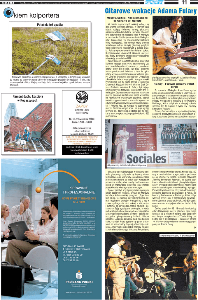 3.09.2008 „Czas Ostrzeszowski” jest prywatnym pismem, na áamach którego moĪesz zaprezentowaü swoje poglądy i podzieliü siĊ zainteresowaniami z mieszkaĔcami caáej Ziemi Ostrzeszowskiej. 11 Gitarowe wakacje Adama Fulary kiem kolportera Meksyk, Saltillo - XIII Internacional de Guitarra del Noreste Potaśnia też upadła Niedawno pisaliśmy o upadłym Ostrzeszowie, a konkretnie o leżącej przy wjeździe do miasta od strony Ostrowa tablicy informującej o przyjaźni Ostrzeszów – Stuhr, a tu znowu upadek tablicy. Miejmy nadzieję, że to nie wróżba jakiejś upadłościowej masy w powiecie. Remont dachu kościoła w Rogaszycach. W czasie tegorocznych wakacji odbyły się dwa ważne festiwale gitarowe, w których wziął udział, robiący światową karierę, gitarzysta ostrzeszowski Adam Fulara. Pierwszy z koncertów odbywał się na początku lipca w Meksyku w miasteczku Saltillo (w rozumieniu Meksykanów liczące 650 tys. mieszkańców Saltillo to tylko miasteczko). Na festiwal, który promuje wszelkiego rodzaju muzykę gitarową, przybyło wielu gitarzystów klasycznych z całego świata. Polskę reprezentował Adam Fulara i Łukasz Kuropaczewski, absolwent akademii muzycznej, znany głównie w świecie gitary klasycznej, mieszkający na stałe w USA. Każdy koncert tego festiwalu miał swój tytuł. Koncert naszego gitarzysty, zatytułowany „La otra cara de la guitarra”, co znaczy „Inna twarz gitary”, odbył się 3 lipca. Trzy bisy i ogromny aplauz publiczności świadczą o tym, że był to udany występ ostrzeszowskiego wirtuoza gitary. Dwa dni wcześniej z koncertem „Przesłanie z Polski dla świata” wystąpił Ł. Kuropaczewski. Prezentowali się tu także artyści z Meksyku, Chorwacji, Hiszpanii i Grecji. Właśnie Grek Costas Costiolis, zdaniem A. Fulary, był najlepszym gitarzystą festiwalu, jego koncert był rewelacyjny. Zaprezentowany repertuar klasycznej muzyki gitarowej został przez niego wykonany na najwyższym światowym poziomie. Jednak największą popularnością w czasie tegorocznej edycji festiwalu cieszył się wykonawca hiszpański – Antonio Rey, ze względu na popularność muzyki flamenco w tym kraju. Na jego występ przyszło ok. 1500 osób, podczas gdy na koncerty innych wykonawców przychodziło ok. 650 melomanów. pieniądze głównie z turystyki, bo jest tam Morze Karaibskie” – wspomina A. Fulara. Niemcy – Festiwal gitarowy w Rietbergu Po powrocie z Meksyku Adam Fulara wystąpił na Ogólnopolskim Festiwalu w Olsztynie, organizowanym przez środowisko gitary klasycznej. Festiwal ten był jednak tylko przerywnikiem między występami w Meksyku a festiwalem w Rietbergu, który odbył się w drugiej połowie sierpnia. Był to festiwal z cyklu tzw. „Tommy Emmanuel Festiwal”. Tommy Emmanuel jest w tej chwili najbardziej cenionym gitarzystą na świecie używającym gitary akustycznej (instrument z pudłem rezonan- Na pierwszej stronie meksykańskiej gazety W czasie tego największego w Meksyku festiwalu gitarowego odbywały się imprezy okołofestiwalowe oraz warsztaty, prowadzone także przez Adama Fularę. W czasie tych warsztatów poruszone zostały dwa tematy: budowanie napięcia w improwizacji gitarowej, oraz metody poszukiwania własnego stylu w muzyce. Oprócz przeżyć artystycznych i muzycznych, jakich dostarczył festiwal, wyjazd do Meksyku był dla p. Adama wielką przygodą. „Spędziłem tam 10 dni. To zupełnie inny kraj niż Polska, klimat tropikalny, cieplej o 10 stopni niż u nas w czasie upalnego lata. Jest to kraj, w którym jest i pustynia, są góry i plaże, tropik, dżungla i płaskowyże. Żyją egzotyczne zwierzęta, a wśród nich wiele gatunków jadowitych węży i pająków. Meksyk podzielony jest na 2 strefy – bogatą północ, gdzie był organizowany festiwal, i biedne południe. Ludzie na południu mają inną budowę ciała, są niżsi. Przez system są gorzej traktowani niż mieszkańcy bogatej północnej części kraju. Amerykanie wolą robić interesy z przedstawicielami północnego Meksyku. Południe ma sowym i metalowymi strunami). Koncertuje 300 razy w roku i właśnie na jego cześć organizowane są, również w Polsce, festiwale nazywane „Tommy Emmanuel Festiwal”. W czasie tych imprez sławni i mniej sławni gitarzyści mają zaszczyt wystąpić u boku Tommiego. Adam Fulara również został zaproszony do takiego występu. Po wspólnym koncercie otrzymał od Tommiego specjalną dedykację dla przyjaciół z Polski. Na koncerty festiwalowe w Rietbergu, które odbywały się przez 4 dni w przepięknym, nowoczesnym budynku, przychodziło ok. 200-300 osób, co na warunki europejskie stanowi bardzo dużą liczbę. Za dwa tygodnie – 12 i 13 września miłośnicy gitary klasycznej i muzyki gitarowej będą mogli spotkać się z Adamem Fularą, jego zespołem oraz innymi muzykami na JaZZlocie, który odbędzie się w Ostrzeszowie – szczegóły strona 10. Wkrótce też opowiemy o innym muzycznym pomyśle Adama Fulary. js A Fulara koncertuje z T. Emmanuelem PKO Bank Polski SA 1 Oddział w Ostrzeszowie ul. 1 Maja 3A tel. 062/ 732 26 00 062/ 732 26 16 062/ 732 26 10