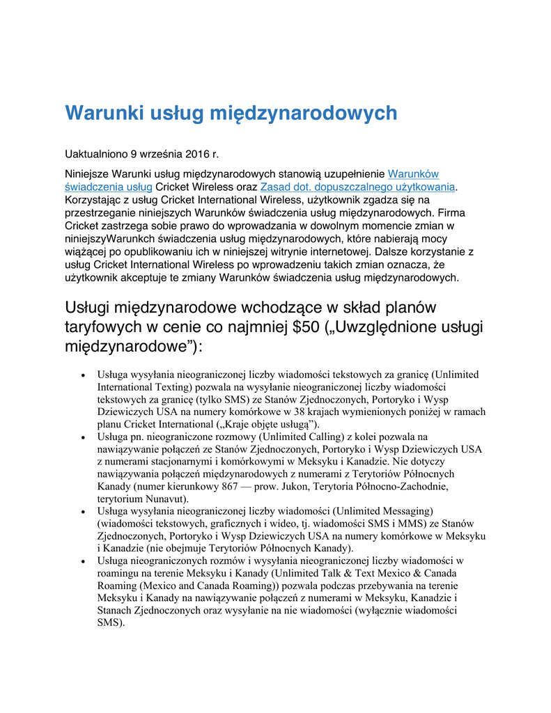 Warunki usług międzynarodowych Uaktualniono 9 września 2016 r. Niniejsze Warunki usług międzynarodowych stanowią uzupełnienie Warunków świadczenia usług Cricket Wireless oraz Zasad dot. dopuszczalnego użytkowania. Korzystając z usług Cricket International Wireless, użytkownik zgadza się na przestrzeganie niniejszych Warunków świadczenia usług międzynarodowych. Firma Cricket zastrzega sobie prawo do wprowadzania w dowolnym momencie zmian w niniejszyWarunkch świadczenia usług międzynarodowych, które nabierają mocy wiążącej po opublikowaniu ich w niniejszej witrynie internetowej. Dalsze korzystanie z usług Cricket International Wireless po wprowadzeniu takich zmian oznacza, że użytkownik akceptuje te zmiany Warunków świadczenia usług międzynarodowych. Usługi międzynarodowe wchodzące w skład planów taryfowych w cenie co najmniej $50 („Uwzględnione usługi międzynarodowe”): • • • • Usługa wysyłania nieograniczonej liczby wiadomości tekstowych za granicę (Unlimited International Texting) pozwala na wysyłanie nieograniczonej liczby wiadomości tekstowych za granicę (tylko SMS) ze Stanów Zjednoczonych, Portoryko i Wysp Dziewiczych USA na numery komórkowe w 38 krajach wymienionych poniżej w ramach planu Cricket International („Kraje objęte usługą”). Usługa pn. nieograniczone rozmowy (Unlimited Calling) z kolei pozwala na nawiązywanie połączeń ze Stanów Zjednoczonych, Portoryko i Wysp Dziewiczych USA z numerami stacjonarnymi i komórkowymi w Meksyku i Kanadzie. Nie dotyczy nawiązywania połączeń międzynarodowych z numerami z Terytoriów Północnych Kanady (numer kierunkowy 867 — prow. Jukon, Terytoria Północno-Zachodnie, terytorium Nunavut). Usługa wysyłania nieograniczonej liczby wiadomości (Unlimited Messaging) (wiadomości tekstowych, graficznych i wideo, tj. wiadomości SMS i MMS) ze Stanów Zjednoczonych, Portoryko i Wysp Dziewiczych USA na numery komórkowe w Meksyku i Kanadzie (nie obejmuje Terytoriów Północnych Kanady). Usługa nieograniczonych rozmów i wysyłania nieograniczonej liczby wiadomości w roamingu na terenie Meksyku i Kanady (Unlimited Talk & Text Mexico & Canada Roaming (Mexico and Canada Roaming)) pozwala podczas przebywania na terenie Meksyku i Kanady na nawiązywanie połączeń z numerami w Meksyku, Kanadzie i Stanach Zjednoczonych oraz wysyłanie na nie wiadomości (wyłącznie wiadomości SMS). • Usługa szybkiej transmisji danych w roamingu (Roaming High-speed Data Access) pozwala na korzystanie z transmisji danych przewidzianych planem podczas przebywania na terytorium Meksyku i Kanady. Przekroczenie dozwolonego limitu szybkiej transmisji danych przewidzianych planem za $50 lub $60 spowoduje zmniejszenie prędkości przesyłania danych do 128 kb/s na pozostałą część miesiąca rozliczeniowego. Warunki świadczenia Uwzględnionych usług międzynarodowych • • • • • • • • • • • Uwzględnione usługi międzynarodowe nie są dostępne w ramach planów za $25, $30 oraz $40 oferowanych przez Cricket. Nawiązywanie połączeń z numerami w Kanadzie i wysyłanie wiadomości na numery w Kanadzie ze Stanów Zjednoczonych, Portoryko i Wysp Dziewiczych USA w ramach Usługi nieograniczonych rozmów i Usługi nieograniczonego wysyłania wiadomości nie obejmuje Terytoriów Północnych Kanady. Plany Smart i Pro obejmują starsze plany Smart, Pro i Advanced. Uwzględnione usługi międzynarodowe nie są dostępne w ramach starszych planów CDMA firmy Cricket. Zdolności przesyłowe i wydajność sieci różnią się w zależności od operatora. Usługi głosowe są przeznaczone do użytku indywidualnego i są świadczone w celu zapewnienia nieprzerwanego prowadzenia rozmów między dwiema osobami fizycznymi. Nie można ich odsprzedawać, obciążać ich kosztami innych osób, ani używać w celach komercyjnych. Z usług głosowych nie można korzystać w celach innych, niż określone przez firmę Cricket, w tym m.in. w celu: monitorowania, transmitowania programów lub nagranych materiałów wideo, telemarketingu, oszustwa, połączeń wykonywanych samoczynnie, przekierowywania rozmów itp. Wypożyczanie lub wynajmowanie urządzenia komórkowego przez użytkownika innemu podmiotowi do jego celów nie spełnia warunków użytku indywidualnego. W jednej międzynarodowej wiadomości tekstowej (tylko SMS) można umieścić do 160 znaków, a rozmiar wiadomości graficznej/wideo jest ograniczony do 1 MB. Nie gwarantuje się dostarczenia międzynarodowych wiadomości tekstowych, a wiadomości (w tym pobrane treści), niedostarczone w ciągu 3 dni będą usuwane. Cricket zastrzega sobie prawo do zmiany tego terminu dostarczania bez powiadomienia. Usługi wysyłania wiadomości świadczone przez firmę Cricket (w tym wiadomości tekstowych, graficznych i wideo) są przeznaczone do niekomercyjnego użytku osobistego. Nie można z nich korzystać w celu: wysyłania wiadomości zawierających reklamy lub oferty komercyjne do żadnej osoby lub podmiotu bez ich zgody; wiadomości zbiorczych; generowanych automatycznie; które mogą zakłócać działanie sieci Cricket; nękają inne osoby lub im grożą; zakłócają korzystanie z Usług Cricket przez innego abonenta; są przyczyną częstych lub poważnych skarg innych abonentów, fałszują lub maskują nadawcę/twórcę wiadomości; lub naruszają jakiekolwiek przepisy lub rozporządzenia. • • • • Pełną listę niedozwolonych form korzystania z usług głosowych i usług wysyłania wiadomości znaleźć można w Warunkach świadczenia usługi Cricket oraz Zasadach dot. dopuszczalnego użytkowania. Określone dane dotyczące użycia i wykonywania połączeń pozwalają nam podejrzewać, że użytkownik wykorzystuje Uwzględnione usługi międzynarodowe firmy Cricket w niedozwolony sposób, w celu innym niż do użytku indywidualnego. Jeśli uznamy, że używają Państwo Uwzględnionych usług międzynarodowych firmy C