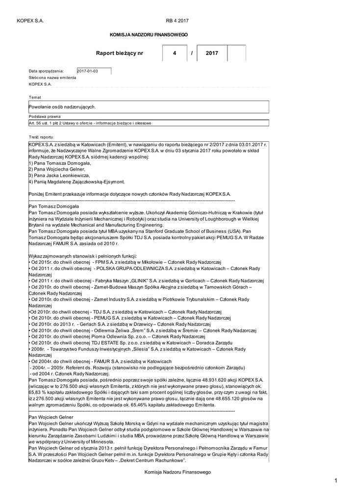 KOPEX S.A. RB 4 2017 KOMISJA NADZORU FINANSOWEGO Raport bieżący nr Data sporządzenia: 4 / 2017 2017-01-03 Skróc ona nazwa emitenta KOPEX S.A. Temat Powołanie osób nadzorujących. Podstawa prawna Art. 56 ust. 1 pkt 2 Ustawy o oferc ie - informac je bieżąc e i okresowe Treść raportu: KOPEX S.A. z siedzibą w Katowicach (Emitent), w nawiązaniu do raportu bieżącego nr 2/2017 z dnia 03.01.2017 r. informuje, że Nadzwyczajne Walne Zgromadzenie KOPEX S.A. w dniu 03 stycznia 2017 roku powołało w skład Rady Nadzorczej KOPEX S.A. siódmej kadencji wspólnej: 1) Pana Tomasza Domogała, 2) Pana Wojciecha Gelner, 3) Pana Jacka Leonkiewicza, 4) Panią Magdalenę Zajączkowską-Ejsymont. Poniżej Emitent przekazuje informacje dotyczące nowych członków Rady Nadzorczej KOPEX S.A. ------------------------------------------------------------------------------------------------------------------------------------Pan Tomasz Domogała Pan Tomasz Domogała posiada wykształcenie wyższe. Ukończył Akademię Górniczo-Hutniczą w Krakowie (tytuł inżyniera na Wydziale Inżynierii Mechanicznej i Robotyki) oraz studia na University of Loughborough w Wielkiej Brytanii na wydziale Mechanical and Manufacturing Engineering. Pan Tomasz Domogała posiada tytuł MBA uzyskany na Stanford Graduate School of Business (USA). Pan Tomasz Domogała będąc akcjonariuszem Spółki TDJ S.A. posiada kontrolny pakiet akcji PEMUG S.A. W Radzie Nadzorczej FAMUR S.A. zasiada od 2010 r. Wykaz zajmowanych stanowisk i pełnionych funkcji: • Od 2015r. do chwili obecnej - FPM S.A. z siedzibą w Mikołowie – Członek Rady Nadzorczej • Od 2011 r. do chwili obecnej - POLSKA GRUPA ODLEWNICZA S.A. z siedzibą w Katowicach – Członek Rady Nadzorczej • Od 2011 r. do chwili obecnej - Fabryka Maszyn „GLINIK” S.A. z siedzibą w Gorlicach – Członek Rady Nadzorczej • Od 2010r. do chwili obecnej - Zamet-Budowa Maszyn Spółka Akcyjna z siedzibą w Tarnowskich Górach – Członek Rady Nadzorczej • Od 2010r. do chwili obecnej - Zamet Industry S.A. z siedzibą w Piotrkowie Trybunalskim – Członek Rady Nadzorczej •Od 2010r. do chwili obecnej - TDJ S.A. z siedzibą w Katowicach – Członek Rady Nadzorczej • Od 2010r. do chwili obecnej - PEMUG S.A. z siedzibą w Katowicach – Członek Rady Nadzorczej • Od 2010r. do 2013 r. - Gerlach S.A. z siedzibą w Drzewicy – Członek Rady Nadzorczej • Od 2010r. do chwili obecnej - Odlewnia Żeliwa „Śrem” S.A. z siedzibą w Śremie – Członek Rady Nadzorczej • Od 2010r. do chwili obecnej Pioma Odlewnia Sp. z o.o. – Członek Rady Nadzorczej • Od 2010r. do chwili obecnej TDJ ESTATE Sp. z o.o. z siedzibą w Katowicach – Doradca Zarządu • 2008r. - Towarzystwo Funduszy Inwestycyjnych „Silesia” S.A. z siedzibą w Katowicach – Członek Rady Nadzorczej • Od 2004r. do chwili obecnej - FAMUR S.A. z siedzibą w Katowicach - 2004r. – 2005r. Referent ds. Rozwoju (stanowisko nie podlegające bezpośrednio członkom Zarządu) - od 2004 r. Członek Rady Nadzorczej. Pan Tomasz Domogała posiada, pośrednio poprzez swoje spółki zależne, łącznie 48.931.620 akcji KOPEX S.A. (wliczając w to 276.500 akcji własnych Emitenta, z których nie jest wykonywane prawo głosu), stanowiących ok. 65,83 % kapitału zakładowego Spółki i dających taki sam procent ogólnej liczby głosów, przy czym z uwagi na fakt, iż z 276.500 akcji własnych Emitenta nie jest wykonywane prawo głosu, łącznie dają one 48.655.120 głosów na walnym zgromadzeniu Spółki, co odpowiada ok. 65,46% kapitału zakładowego Emitenta. ------------------------------------------------------------------------------------------------------------------------------------Pan Wojciech Gelner Pan Wojciech Gelner ukończył Wyższą Szkołę Morską w Gdyni na wydziale mechanicznym uzyskując tytuł magistra inżyniera. Ponadto Pan Wojciech Gelner odbył studia podyplomowe w Szkole Głównej Handlowej w Warszawie na kierunku Zarządzanie Zasobami Ludzkimi i studia MBA, prowadzone przez Szkołę Główną Handlową w Warszawie we współpracy z University of Minnesota. Pan Wojciech Gelner od stycznia 2013 r. pełnił funkcję Dyrektora Personalnego i Pełnomocnika Zarządu w Famur S.A. W przeszłości Pan Wojciech Gelner pełnił m.in. funkcje Dyrektora Personalnego w Grupie Kęty i członka Rady Nadzorczej w spółce zależnej Grupy Kety – „Dekret Centrum Rachunkowe”. Komisja Nadzoru Finansowego 1 KOPEX S.A. RB 4 2017 Nadzorczej w spółce zależnej Grupy Kety – „Dekret Centrum Rachunkowe”. Pan Wojciech Gelner był także Dyrektorem Personalnym i pełnił funkcję Pełnomocnika Zarządu w Huhtamaki Foodservice Poland Sp. z o.o. Uzupełnieniem działalności zawodowej Pana Wojciecha Gelner jest także stanowisko wykładowcy studiów podyplomowych w Wyższej Szkole Biznesu w Dąbrowie Górniczej. ------------------------------------------------------------------------------------------------------------------------------------Pan Jacek Leonkiewicz Pan Jacek Leonkiewicz posiada wykształcenie wyższe - jest absolwentem Szkoły Głównej Handlowej w Warszawie oraz CEMS Master in International Management. Pan Jacek Leonkiewicz studiował również w Madrycie na Universidad Carlos III oraz w Kopenhadze na Copenhagen Business School. Pan Jacek Leonkiewicz rozpoczął karierę zawodową w banku inwestycyjnym J.P. Morgan w Londynie, gdzie pracował w zespołach Equity Capital Markets, Debt Capital Markets oraz Equity Private Placements. Był również członkiem zespołu Debt Capital Partners banku Merrill Lynch w Londynie. Następnie był związany z PKO TFI, gdzie zajmował się analizą rynku akcji, zwłaszcza spółek z sektora budowlanego, przemysłowego, deweloperskiego i transportowego. W latach od 2013 do 2015 pełnił funkcję Dyrektora Zarządzającego ds. Nadzoru Właścicielskiego i Prywatyzacji w PKP S.A. gdzie odpowiadał m.in. za nadzorowanie procesów prywatyzacyjnych w Gr