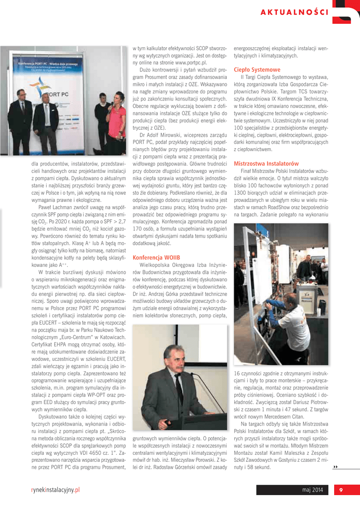 AKTUALNOŚCI dla producentów, instalatorów, przedstawicieli handlowych oraz projektantów instalacji z pompami ciepła. Dyskutowano o aktualnym stanie i najbliższej przyszłości branży grzewczej w Polsce i o tym, jak wpłyną na nią nowe wymagania prawne i ekologiczne. Paweł Lachman zwrócił uwagę na współczynnik SPF pomp ciepła i związaną z nim emisję CO2. Po 2020 r. każda pompa o SPF > 2,7 będzie emitować mniej CO2 niż kocioł gazowy. Powrócono również do tematu rynku kotłów stałopalnych. Klasę A+ lub A będą mogły osiągnąć tylko kotły na biomasę, natomiast kondensacyjne kotły na pelety będą sklasyfikowane jako A++. W trakcie burzliwej dyskusji mówiono o wspieraniu mikrokogeneracji oraz enigmatycznych wartościach współczynników nakładu energii pierwotnej np. dla sieci ciepłowniczej. Sporo uwagi poświęcono wprowadzanemu w Polsce przez PORT PC programowi szkoleń i certyfikacji instalatorów pomp ciepła EUCERT – szkolenia te mają się rozpocząć na początku maja br. w Parku Naukowo Technologicznym „Euro-Centrum” w Katowicach. Certyfikat EHPA mogą otrzymać osoby, które mają udokumentowane doświadczenie zawodowe, uczestniczyli w szkoleniu EUCERT, zdali wieńczący je egzamin i pracują jako instalatorzy pomp ciepła. Zaprezentowano też oprogramowanie wspierające i uzupełniające szkolenia, m.in. program symulacyjny dla instalacji z pompami ciepła WP-OPT oraz program EED służący do symulacji pracy gruntowych wymienników ciepła. Dyskutowano także o kolejnej części wytycznych projektowania, wykonania i odbioru instalacji z pompami ciepła pt. „Skrócona metoda obliczania rocznego współczynnika efektywności SCOP dla sprężarkowych pomp ciepła wg wytycznych VDI 4650 cz. 1”. Zaprezentowano narzędzia wsparcia przygotowane przez PORT PC dla programu Prosument, rynekinstalacyjny.pl w tym kalkulator efektywności SCOP stworzony wg wytycznych organizacji. Jest on dostępny online na stronie www.portpc.pl. Dużo kontrowersji i pytań wzbudził program Prosument oraz zasady dofinansowania mikro i małych instalacji z OZE. Wskazywano na nagłe zmiany wprowadzone do programu już po zakończeniu konsultacji społecznych. Obecne regulacje wykluczają bowiem z dofinansowania instalacje OZE służące tylko do produkcji ciepła (bez produkcji energii elektrycznej z OZE). Dr Adolf Mirowski, wiceprezes zarządu PORT PC, podał przykłady najczęściej popełnianych błędów przy projektowaniu instalacji z pompami ciepła wraz z prezentacją prawidłowego postępowania. Główne trudności przy doborze długości gruntowego wymiennika ciepła sprawia współczynnik jednostkowej wydajności gruntu, który jest bardzo często źle dobierany. Podkreślano również, że dla odpowiedniego doboru urządzenia ważna jest analiza jego czasu pracy, którą trudno przeprowadzić bez odpowiedniego programu symulacyjnego. Konferencja zgromadziła ponad 170 osób, a formuła uzupełniania wystąpień otwartymi dyskusjami nadała temu spotkaniu dodatkową jakość. energooszczędnej eksploatacji instalacji wentylacyjnych i klimatyzacyjnych. Ciepło Systemowe II Targi Ciepła Systemowego to wystawa, którą zorganizowała Izba Gospodarcza Ciepłownictwo Polskie. Targom TCS towarzyszyła dwudniowa IX Konferencja Techniczna, w trakcie której omawiano nowoczesne, efektywne i ekologiczne technologie w ciepłownictwie systemowym. Uczestniczyło w niej ponad 100 specjalistów z przedsiębiorstw energetyki cieplnej, ciepłowni, elektrociepłowni, gospodarki komunalnej oraz firm współpracujących z ciepłownictwem. Mistrzostwa Instalatorów Finał Mistrzostw Polski Instalatorów wzbudził wielkie emocje. O tytuł mistrza walczyło blisko 100 fachowców wyłonionych z ponad 1300 biorących udział w eliminacjach przeprowadzanych w ubiegłym roku w wielu miastach w ramach RoadShow oraz bezpośrednio na targach. Zadanie polegało na wykonaniu Konferencja WOIIB Wielkopolska Okręgowa Izba Inżynierów Budownictwa przygotowała dla inżynierów konferencję, podczas której dyskutowano o efektywności energetycznej w budownictwie. Dr inż. Andrzej Górka przedstawił techniczne możliwości budowy układów grzewczych o dużym udziale energii odnawialnej z wykorzystaniem kolektorów słonecznych, pomp ciepła, gruntowych wymienników ciepła. O potencjale współczesnych instalacji z nowoczesnymi centralami wentylacyjnymi i klimatyzacyjnymi mówił dr hab. inż. Mieczysław Porowski. Z kolei dr inż. Radosław Górzeński omówił zasady 16 czynności zgodnie z otrzymanymi instrukcjami i były to prace monterskie – przykręcanie, regulacja, montaż oraz przeprowadzenie próby ciśnieniowej. Oceniano szybkość i dokładność. Zwycięzcą został Dariusz Piotrowski z czasem 1 minuta i 47 sekund. Z targów wrócił nowym Mercedesem Citan. Na targach odbyły się także Mistrzostwa Polski Instalatorów dla Szkół, w ramach których przyszli instalatorzy także mogli spróbować swoich sił w montażu. Młodym Mistrzem Montażu został Kamil Maleszka z Zespołu Szkół Zawodowych w Gostyniu z czasem 2 minuty i 58 sekund. maj 2014 9 AKTUALNOŚCI Konkurs wspierały firmy: Afriso, Vogel&Noot, Mercedes Benz, Grundfos, Rehau, Broetje Heizung, Bims Plus oraz MTP. tanci – laureaci konkursu Helios – prezentowali swoje prace na stoisku Flowair, które wyróżniało się niekonwencjonalną budową – było to odzwierciedlenie hali magazynowej, w której zamontowano kompleksowe rozwiązania grzewczo-wentylacyjne oferowane przez firmę – w tym nagrzewnice, kurtyny i jednostki odzysku ciepła. Klub Instalatora Grupa SBS i MTP kolejny raz zorganizowały Klub Instalatora ze specjalnie zaaranżowaną przestrzenią do integracji środowiska i rozrywki. Odbywały się tam m.in. pokazy mody roboczej, a nawet strojów wieczorowych i plażowych. Można było też podziwiać akrobacje mistrzów Polski i wicemistrzów świata w trialu rowerowym. Dla instalatorów orga