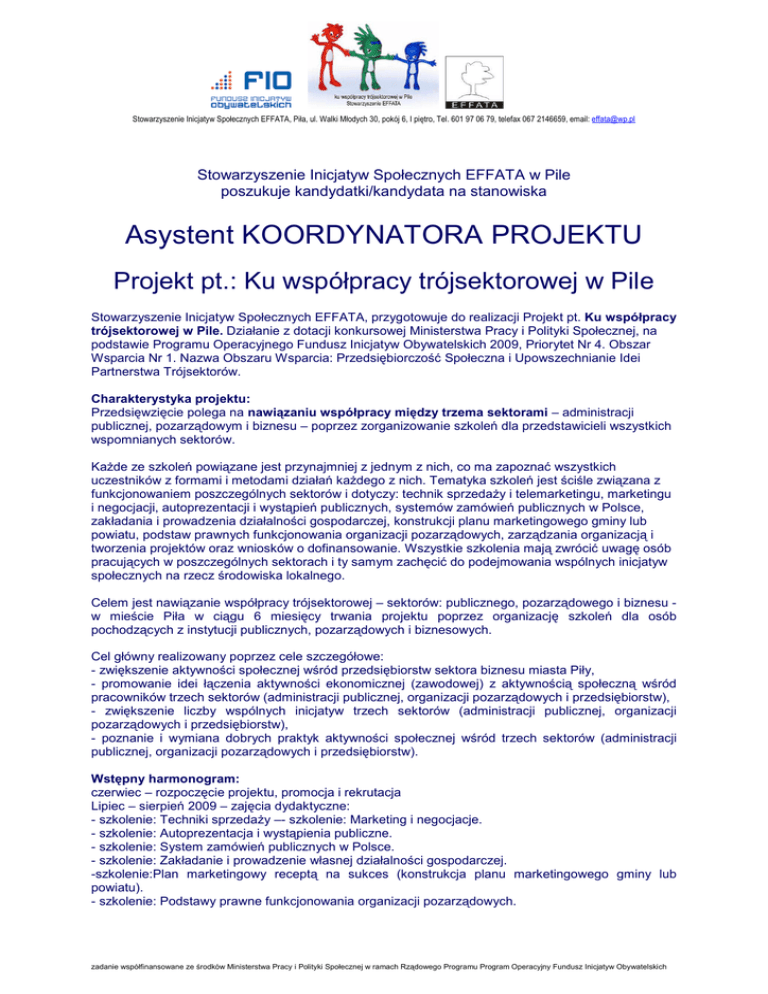Stowarzyszenie Inicjatyw Społecznych EFFATA, Piła, ul. Walki Młodych 30, pokój 6, I piętro, Tel. 601 97 06 79, telefax 067 2146659, email: [email protected] Stowarzyszenie Inicjatyw Społecznych EFFATA w Pile poszukuje kandydatki/kandydata na stanowiska Asystent KOORDYNATORA PROJEKTU Projekt pt.: Ku współpracy trójsektorowej w Pile Stowarzyszenie Inicjatyw Społecznych EFFATA, przygotowuje do realizacji Projekt pt. Ku współpracy trójsektorowej w Pile. Działanie z dotacji konkursowej Ministerstwa Pracy i Polityki Społecznej, na podstawie Programu Operacyjnego Fundusz Inicjatyw Obywatelskich 2009, Priorytet Nr 4. Obszar Wsparcia Nr 1. Nazwa Obszaru Wsparcia: Przedsiębiorczość Społeczna i Upowszechnianie Idei Partnerstwa Trójsektorów. Charakterystyka projektu: Przedsięwzięcie polega na nawiązaniu współpracy między trzema sektorami – administracji publicznej, pozarządowym i biznesu – poprzez zorganizowanie szkoleń dla przedstawicieli wszystkich wspomnianych sektorów. KaŜde ze szkoleń powiązane jest przynajmniej z jednym z nich, co ma zapoznać wszystkich uczestników z formami i metodami działań kaŜdego z nich. Tematyka szkoleń jest ściśle związana z funkcjonowaniem poszczególnych sektorów i dotyczy: technik sprzedaŜy i telemarketingu, marketingu i negocjacji, autoprezentacji i wystąpień publicznych, systemów zamówień publicznych w Polsce, zakładania i prowadzenia działalności gospodarczej, konstrukcji planu marketingowego gminy lub powiatu, podstaw prawnych funkcjonowania organizacji pozarządowych, zarządzania organizacją i tworzenia projektów oraz wniosków o dofinansowanie. Wszystkie szkolenia mają zwrócić uwagę osób pracujących w poszczególnych sektorach i ty samym zachęcić do podejmowania wspólnych inicjatyw społecznych na rzecz środowiska lokalnego. Celem jest nawiązanie współpracy trójsektorowej – sektorów: publicznego, pozarządowego i biznesu w mieście Piła w ciągu 6 miesięcy trwania projektu poprzez organizację szkoleń dla osób pochodzących z instytucji publicznych, pozarządowych i biznesowych. Cel główny realizowany poprzez cele szczegółowe: - zwiększenie aktywności społecznej wśród przedsiębiorstw sektora biznesu miasta Piły, - promowanie idei łączenia aktywności ekonomicznej (zawodowej) z aktywnością społeczną wśród pracowników trzech sektorów (administracji publicznej, organizacji pozarządowych i przedsiębiorstw), - zwiększenie liczby wspólnych inicjatyw trzech sektorów (administracji publicznej, organizacji pozarządowych i przedsiębiorstw), - poznanie i wymiana dobrych praktyk aktywności społecznej wśród trzech sektorów (administracji publicznej, organizacji pozarządowych i przedsiębiorstw). Wstępny harmonogram: czerwiec – rozpoczęcie projektu, promocja i rekrutacja Lipiec – sierpień 2009 – zajęcia dydaktyczne: - szkolenie: Techniki sprzedaŜy –- szkolenie: Marketing i negocjacje. - szkolenie: Autoprezentacja i wystąpienia publiczne. - szkolenie: System zamówień publicznych w Polsce. - szkolenie: Zakładanie i prowadzenie własnej działalności gospodarczej. -szkolenie:Plan marketingowy receptą na sukces (konstrukcja planu marketingowego gminy lub powiatu). - szkolenie: Podstawy prawne funkcjonowania organizacji pozarządowych. zadanie współfinansowane ze środków Ministerstwa Pracy i Polityki Społecznej w ramach Rządowego Programu Program Operacyjny Fundusz Inicjatyw Obywatelskich Stowarzyszenie Inicjatyw Społecznych EFFATA, Piła, ul. Walki Młodych 30, pokój 6, I piętro, Tel. 601 97 06 79, telefax 067 2146659, email: [email protected] - szkolenie: Zarządzanie organizacją. - szkolenie: Pozyskiwanie funduszy zewnętrznych Wrzesień 2009 – ankiety ewaluacyjne 30 wrzesień – zakończenie projektu czas trwania dla kaŜdego szkolenia: 16 godzin; liczba uczestników: 15; wstępny harmonogram projektu 1. 17-20 lipca - Techniki sprzedaŜy, Marketing 2. 24-27 lipca- Zakładania i prowadzenie działalności gospodarczej, Podstawy prawne funkcjonowania NGO 3. 3-4 sierpnia- System zamówień publicznych 4. 11-12 sierpnia - Plan marketingowy 5. 22-23 sierpnia- Zarządzanie NGO 6. 27-28 sierpnia Autoprezentacja 7. 29-30 sierpnia Pozyskiwanie funduszy zewnętrznych Zakres zadań koordynatora naleŜy: • • • Jeśli: • • • • • Koordynowanie działań prowadzonych w ramach projektu rekrutacja uczestników szkoleń pomoc w tworzeniu materiałów dla beneficjentów projektu (broszury, newslettery) Interesujesz się problematyką społeczną Posiadasz zdolności organizacyjne Jesteś osobą odpowiedzialną Szukasz ciekawej pracy Chciałbyś/abyś działać w organizacji pozarządowej Oferujemy: • Pracę na umowę wolontariacką • MoŜliwość rozwoju zawodowego • moŜliwość nawiązania trwałej współpracy oraz uczestnictwa w innych inicjatywach Osoby zainteresowane prosimy o przesłanie CV i listu motywacyjnego na adres: Stowarzyszeniu Inicjatyw Społecznych EFFATA w Pile Pila, ul. Walki Młodych 30, pokój 6, I piętro, telefax 0672146659; email: [email protected] Informujemy, Ŝe skontaktujemy się z wybranym Kandydatem. zadanie współfinansowane ze środków Ministerstwa Pracy i Polityki Społecznej w ramach Rządowego Programu Program Operacyjny Fundusz Inicjatyw Obywatelskich