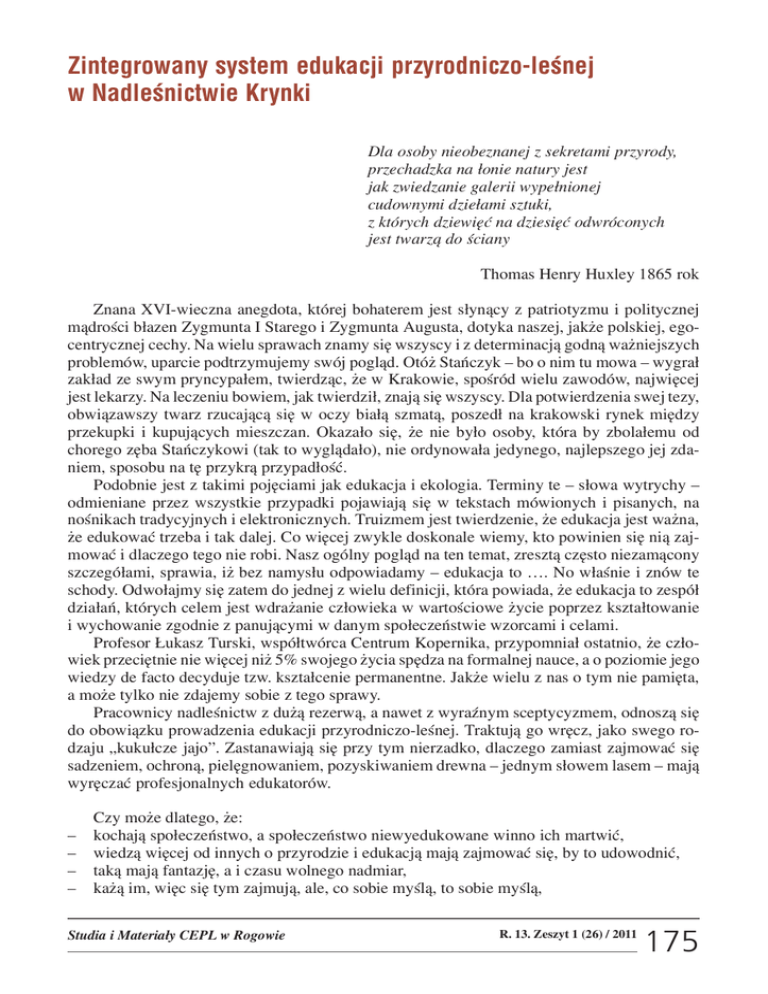 Zintegrowany system edukacji przyrodniczo-leœnej w Nadleœnictwie Krynki Dla osoby nieobeznanej z sekretami przyrody, przechadzka na ³onie natury jest jak zwiedzanie galerii wype³nionej cudownymi dzie³ami sztuki, z których dziewiêæ na dziesiêæ odwróconych jest twarz¹ do œciany Thomas Henry Huxley 1865 rok Znana XVI-wieczna anegdota, której bohaterem jest s³yn¹cy z patriotyzmu i politycznej m¹droœci b³azen Zygmunta I Starego i Zygmunta Augusta, dotyka naszej, jak¿e polskiej, egocentrycznej cechy. Na wielu sprawach znamy siê wszyscy i z determinacj¹ godn¹ wa¿niejszych problemów, uparcie podtrzymujemy swój pogl¹d. Otó¿ Stañczyk – bo o nim tu mowa – wygra³ zak³ad ze swym pryncypa³em, twierdz¹c, ¿e w Krakowie, spoœród wielu zawodów, najwiêcej jest lekarzy. Na leczeniu bowiem, jak twierdzi³, znaj¹ siê wszyscy. Dla potwierdzenia swej tezy, obwi¹zawszy twarz rzucaj¹c¹ siê w oczy bia³¹ szmat¹, poszed³ na krakowski rynek miêdzy przekupki i kupuj¹cych mieszczan. Okaza³o siê, ¿e nie by³o osoby, która by zbola³emu od chorego zêba Stañczykowi (tak to wygl¹da³o), nie ordynowa³a jedynego, najlepszego jej zdaniem, sposobu na tê przykr¹ przypad³oœæ. Podobnie jest z takimi pojêciami jak edukacja i ekologia. Terminy te – s³owa wytrychy – odmieniane przez wszystkie przypadki pojawiaj¹ siê w tekstach mówionych i pisanych, na noœnikach tradycyjnych i elektronicznych. Truizmem jest twierdzenie, ¿e edukacja jest wa¿na, ¿e edukowaæ trzeba i tak dalej. Co wiêcej zwykle doskonale wiemy, kto powinien siê ni¹ zajmowaæ i dlaczego tego nie robi. Nasz ogólny pogl¹d na ten temat, zreszt¹ czêsto niezam¹cony szczegó³ami, sprawia, i¿ bez namys³u odpowiadamy – edukacja to …. No w³aœnie i znów te schody. Odwo³ajmy siê zatem do jednej z wielu definicji, która powiada, ¿e edukacja to zespó³ dzia³añ, których celem jest wdra¿anie cz³owieka w wartoœciowe ¿ycie poprzez kszta³towanie i wychowanie zgodnie z panuj¹cymi w danym spo³eczeñstwie wzorcami i celami. Profesor £ukasz Turski, wspó³twórca Centrum Kopernika, przypomnia³ ostatnio, ¿e cz³owiek przeciêtnie nie wiêcej ni¿ 5% swojego ¿ycia spêdza na formalnej nauce, a o poziomie jego wiedzy de facto decyduje tzw. kszta³cenie permanentne. Jak¿e wielu z nas o tym nie pamiêta, a mo¿e tylko nie zdajemy sobie z tego sprawy. Pracownicy nadleœnictw z du¿¹ rezerw¹, a nawet z wyraŸnym sceptycyzmem, odnosz¹ siê do obowi¹zku prowadzenia edukacji przyrodniczo-leœnej. Traktuj¹ go wrêcz, jako swego rodzaju „kuku³cze jajo”. Zastanawiaj¹ siê przy tym nierzadko, dlaczego zamiast zajmowaæ siê sadzeniem, ochron¹, pielêgnowaniem, pozyskiwaniem drewna – jednym s³owem lasem – maj¹ wyrêczaæ profesjonalnych edukatorów. – – – – Czy mo¿e dlatego, ¿e: kochaj¹ spo³eczeñstwo, a spo³eczeñstwo niewyedukowane winno ich martwiæ, wiedz¹ wiêcej od innych o przyrodzie i edukacj¹ maj¹ zajmowaæ siê, by to udowodniæ, tak¹ maj¹ fantazjê, a i czasu wolnego nadmiar, ka¿¹ im, wiêc siê tym zajmuj¹, ale, co sobie myœl¹, to sobie myœl¹, Studia i Materia³y CEPL w Rogowie R. 13. Zeszyt 1 (26) / 2011 175 – – wiedz¹, ¿e niedostatek profesjonalnej informacji o œrodowisku naturalnym jest zwykle szkodliwy dla przyrody, a wiêc i dla lasów, maj¹ œwiadomoœæ, ¿e brak wiedzy przyrodniczo-leœnej determinuje niesprawiedliw¹ ocenê pracy i zawodu leœnika. Trudno nie zauwa¿yæ, ¿e powy¿sze odpowiedzi s¹ tyle merytoryczne, co prowokacyjne. I chocia¿ ¿adnej z nich nie da siê oderwaæ od rzeczywistoœci, to nie sposób nie przyznaæ, ¿e najskuteczniejszym sposobem zapewnienia zrozumienia i poparcia dla pracy leœnika jest kszta³towanie, przez m¹dr¹ edukacjê, w³aœciwej postawy spo³eczeñstwa wobec lasów i problemów leœnictwa. Nie ma uniwersalnej metody nauczania. I dobrze, bowiem ludzka fantazja nie zna granic, a droga naszego rozwoju jest wypadkow¹ ró¿nych koncepcji. Jedn¹ z nich, w obszarze edukacji przyrodniczo-leœnej, wypracowano w Nadleœnictwie Krynki. Zak³ada ona, ¿e edukacja przyrodniczo-leœna jest swoistym produktem (ryc. 1), który poddaje siê zabiegom marketingowym i reaguje na popyt oraz poda¿. Ryc. 1. Zintegrowany produkt edukacyjny Nadleœnictwa Krynki Fig. 1. Integrated educational product of Krynki Forest Inspectorate Podstawow¹ funkcj¹ ka¿dego produktu jest zaspokajanie okreœlonych potrzeb potencjalnych nabywców (klientów). By przybli¿yæ nieco filozofiê budowy naszego, specyficznego produktu w aspekcie jego u¿ytecznoœci, a jednoczeœnie nie uwik³aæ siê w nadmiar naukowych dywagacji pos³u¿my siê piêciopoziomow¹ analiz¹ Kotlera: – poziom pierwszy – po¿ytek podstawowy winien zapewniæ zaspokojenie podstawowych potrzeb zainteresowanego (wiedza przyrodniczo-leœna), – poziom drugi – produkt podstawowy gwarantuje spe³nienie przypisanych mu g³ównych funkcji (infrastruktura, ludzie wyposa¿eni w niezbêdny zakres wiedzy), – poziom trzeci – produkt jest oczekiwany, poniewa¿ odpowiada potrzebom potencjalnego nabywcy (atrakcyjnoœæ, przyjaznoœæ, dostêpnoœæ), – poziom czwarty – istnieje mo¿liwoœæ rozszerzenia produktu o elementy pozytywnie zaskakuj¹ce (niekonwencjonalna postaæ produktu), – poziom pi¹ty – produkt potencjalny w wyniku mo¿liwego rozwoju osi¹gnie now¹ jakoœæ (wzbogacanie infrastruktury, zmiana sposobu przekazu). 176 Waldemar P. Sieradzki Zintegrowany system edukacji przyrodniczo-leœnej... Tak opisawszy nasz produkt o nazwie „Zintegrowany system edukacji przyrodniczo-leœnej” odnajdziemy potwierdzenie, z jednej strony jago kompletnoœci, z drugiej zaœ u¿ytecznoœci. St¹d ju¿ tylko krok do rozszyfrowania samej nazwy produktu, która odzwierciedla cztery jego synergicznie powi¹zane sk³adowe: edukacjê publiczn¹ rozproszon¹, edukacjê lokaln¹ skoncentrowan¹, ekoturystykê i wzorce: Edukacja publiczna rozproszona W