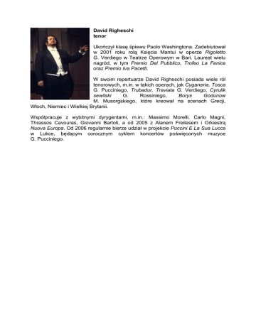 David Righeschi tenor Ukończył klasę śpiewu Paolo Washingtona. Zadebiutował w 2001 roku rolą Księcia Mantui w operze Rigoletto G. Verdiego w Teatrze Operowym w Bari. Laureat wielu nagród, w tym Premio Del Pubblico, Trofeo La Fenice oraz Premio Iva Pacetti. W swoim repertuarze David Righeschi posiada wiele ról tenorowych, m.in. w takich operach, jak Cyganeria, Tosca G. Pucciniego, Trubadur, Traviata G. Verdiego, Cyrulik sewilski G. Rossiniego, Borys Godunow M. Musorgskiego, które kreował na scenach Grecji, Włoch, Niemiec i Wielkiej Brytanii. Współpracuje z wybitnymi dyrygentami, m.in.: Massimo Morelli, Carlo Magni, Thrassos Cavouras, Giovanni Bartoli, a od 2005 z Alanem Freilesem i Orkiestrą Nuova Europa. Od 2006 regularnie bierze udział w projekcie Puccini E La Sua Lucca w Lukce, będącym corocznym cyklem koncertów poświęconych muzyce G. Pucciniego.
