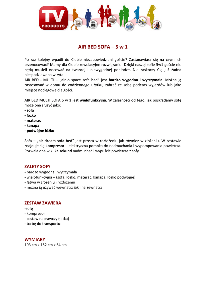 AIR BED SOFA – 5 w 1 Po raz kolejny wpadli do Ciebie niezapowiedziani goście? Zastanawiasz się na czym ich przenocować? Mamy dla Ciebie rewelacyjne rozwiązanie! Dzięki naszej sofie 5w1 goście nie będą musieli nocować na twardej i niewygodnej podłodze. Nie zaskoczy Cię już żadna niespodziewana wizyta. AIR BED ‐ MULTI – „air o space sofa bed” jest bardzo wygodna i wytrzymała. Można ją zastosować w domu do codziennego użytku, zabrać ze sobą podczas wyjazdów lub jako miejsce noclegowe dla gości. AIR BED MULTI SOFA 5 w 1 jest wielofunkcyjna. W zależności od tego, jak poskładamy sofę może ona służyć jako: ‐ sofa ‐ łóżko ‐ materac ‐ kanapa ‐ podwójne łóżko Sofa – „air dream sofa bed” jest prosta w rozłożeniu jak również w złożeniu. W zestawie znajduje się kompresor – elektryczna pompka do nadmuchania i wypompowania powietrza. Pozwala ona w kilka sekund nadmuchać i wypuścić powietrze z sofy. ZALETY SOFY ‐ bardzo wygodna i wytrzymała ‐ wielofunkcyjna – (sofa, łóżko, materac, kanapa, łóżko podwójne) ‐ łatwa w złożeniu i rozłożeniu ‐ można ją używać wewnątrz jak i na zewnątrz ZESTAW ZAWIERA ‐sofę ‐ kompresor ‐ zestaw naprawczy (łatka) ‐ torbę do transportu WYMIARY 193 cm x 152 cm x 64 cm ODPOWIEDZI NA NAJCZĘŚCIEJ ZADAWANE PYTANIA W jakich kolorach dostępna jest sofa? Sofa dostępna jest tylko w kolorze czarnym. W jaki sposób wyczyścić sofę? Powierzchnię sofy należy umyć za pomocą szmatki i wody z mydłem – pozostawić do całkowitego wyschnięcia. Czy posiadają Państwo air bed multi sofę jednoosobową? Niestety, w sprzedaży mamy tylko sofę dwuosobową.