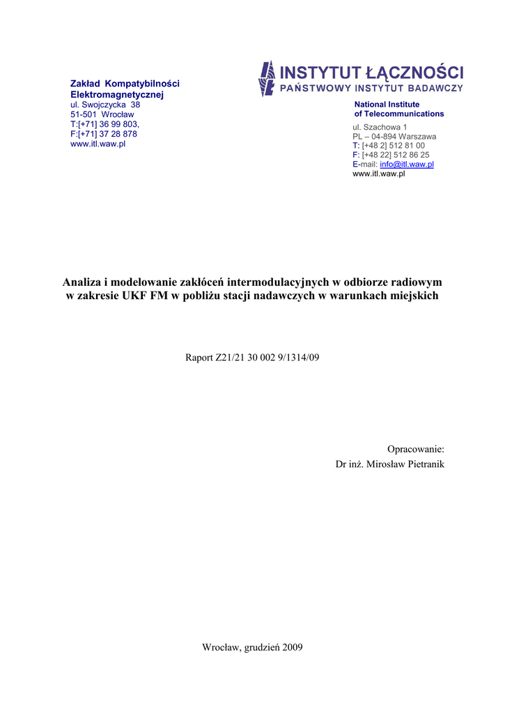 Zakład Kompatybilności Elektromagnetycznej National Institute of Telecommunications ul. Swojczycka 38 51-501 Wrocław T:[+71] 36 99 803, F:[+71] 37 28 878 www.itl.waw.pl ul. Szachowa 1 PL – 04-894 Warszawa T: [+48 2] 512 81 00 F: [+48 22] 512 86 25 E-mail: [email protected] www.itl.waw.pl Analiza i modelowanie zakłóceń intermodulacyjnych w odbiorze radiowym w zakresie UKF FM w pobliżu stacji nadawczych w warunkach miejskich Raport Z21/21 30 002 9/1314/09 Opracowanie: Dr inż. Mirosław Pietranik Wrocław, grudzień 2009 Analiza i modelowanie zakłóceń intermodulacyjnych w odbiorze radiowym Nr pracy : Nazwa pracy : Zleceniodawca : Praca statutowa Data rozpoczęcia : Styczeń 2009 r. Data zakończenia : Grudzień 2009 r Słowa kluczowe : Zakłócenia intermodulacyjne – UKF FM – odbiorniki – propagacja w warunkach miejskich Kierownik pracy : mgr inż. Marek Kałuski Wykonawcy pracy : Prof. dr hab. inż. Ryszard Strużak dr inż. Mirosław Pietranik mgr inż. Marek Michalak mgr inż. Magdalena Modrzewska mgr inż. Karolina Skrzypek mgr inż. Piotr Tyrawa technik Michał Stajszczyk technik Rafał Bobrowski str. 2 21 30 002 9 Analiza i modelowanie zakłóceń intermodulacyjnych w odbiorze radiowym w zakresie UKF FM w pobliżu stacji nadawczych w warunkach miejskich Praca wykonana w Zakładzie Kompatybilności Elektromagnetycznej Instytutu Łączności we Wrocławiu Kierownik Zakładu: dr inż. . Janusz Sobolewski Niniejsze opracowanie może być powielane i publikowane wyłącznie w całości Powielanie i publikowanie fragmentów wymaga uzyskaniu zgody Instytutu Łączności © Copyright by Instytut Łączności, Wrocław 2009 Analiza i modelowanie zakłóceń intermodulacyjnych w odbiorze radiowym str. 3 Spis treści 1. Uzasadnienie realizacji pracy 2. Odbiornik radiowy jako urządzenie wrażliwe na zakłócenia 2.1 Uwagi ogólne 2.2 Zakłócenia intermodulacyjne w odbiornikach FM – model ogólny 2.3 Model amplitudowy zakłóceń intermodulacyjnych dla odbiorników UKF FM F 2.4 Modele odporności odbiorników – wyniki badań 2.5 Czynniki wpływające na realną wartość współczynnika odporności intermodulacyjnej – K32 3. Badania rozkładu natężenia pola sygnałów radiowych UKF FM w dużych miastach 3.1 Uwagi ogólne 3.2 Metody określania natężenia pola w dużych miastach 4. Zależności między poziomem natężenia pola elektromagnetycznego w warunkach miejskich i napięciem na zaciskach antenowych odbiorników 5. Metoda analizy DODATEK A: Analiza skutków wprowadzania nowej stacji do istniejącej sieci stacji UKF FM (niepublikowany) DODATEK B: Zakłócenia intermodulacyjne w odbiorze radiowym UKF FM w obecności sygnałów cyfrowych (niepoblikowany) DODATEK C Analiza zakłóceń intermodulacyjnych w systemie łączności radiowej Centrum Zarządzania Kryzysowego (niepublikowany) Analiza i modelowanie zakłóceń intermodulacyjnych w odbiorze radiowym 1. str. 4 Uzasadnienie realizacji pracy W warunkach miejskich, w szczególności w dużych aglomeracjach, przy dużej ilości lokalnych stacji radiowych i telewizyjnych, pracujących przy względnie małych wzajemnych odległościach, istnieje duże prawdopodobieństwo wystąpienia zakłóceń w odbiorze niektórych stacji na pewnych obszarach miasta. Ich przyczyną mogą być zakłócenia intermodulacyjne, pojawiające się na tych obszarach miasta, gdzie jednocześnie występują silne sygnały od kilku stacji, których częstotliwości spełniają jednocześnie określone warunki. Zakłócenia intermodulacyjne są powodowane nieliniowościami w obwodach wejściowych odbiorników. W szczególności zjawisko to jest groźne w przypadku odbiorników radiowych. Prawdopodobieństwo wystąpienia zakłóceń intermodulacyjnych jest bardzo duże. Przykładowo przy 15 stacjach radiowych spełnionych jest kilka tysięcy warunków częstotliwościowych wystąpienia zakłóceń intermodulacyjnych w paśmie UKF FM. Po uwzględnieniu warunków amplitudowych (dla realnego rozmieszczenia stacji na terenie danego miasta) ilość istotnych warunków częstotliwościowych redukuje się do kilkudziesięciu. Przy czym uciążliwość takich zakłóceń będzie głównie zależeć od właściwości odbiornika. Zatem zagadnienie sformułowania odpowiednich minimalnych wymagań w odniesieniu do odporności odbiorników radiowych na zakłócenia intermodulacyjne jest bardzo ważne ze względu na racjonalizację planowania sieci stacji radiowych i telewizyjnych. Wiedza o właściwościach odbiornika jest w szczególności ważna w przypadkach sytuacji, gdy w jego pobliżu występują jedna lub kilka silnych stacji radiowych (UKF FM lub innych służb, np. sygnał CDMA stosowany w bezprzewodowej transmisji Internetu). Zjawiska te powinny być brane pod uwagę w szczególności w przypadkach zmian parametrów w już istniejącej sieci stacji radiowych (np. zmian lokalizacji, wysokości zawieszenia anteny nadawczej) lub wprowadzenia na danym terenie miejskim nowej służby radiowej. W tym ostatnim przypadku zachodzi bezwzględna potrzeba takiego doboru jej parametrów, aby nie naruszyć już istniejącej jakości odbioru. Wszelkie zmiany w już istniejącej strukturze sieci stacji radiowych są raczej trudne (i często kosztowne) i cały proces analizy ewentualnych przyczyn wystąpienia zakłóceń powinien być przedsięwzięty przed ostatecznym przyznaniem koncesji dla nowego nadawcy. W Dodatku A przedstawiono wyniki analizy możliwości pojawienia się zakłóceń, wynikających ze zjawiska intermodulacji w stopniach wejściowych odbiorników UKF FM, po uruchomieniu nowej silnej stacji UKF FM. Uruchomienie nowej stacji radiowej w mieście, to przede wszystkim problem odbiorców z bezpośredniego jej sąsiedztwa. Dodatek B dotyczy wyników badań, przeprowadzonych przez zespół Zakładu Kompatybilności Elektromagnetycznej Instytutu Łączności we Wrocławiu, zakłóceń wzajemnych w odbiorze radiowym w zakresie UKF FM w przypadku poja