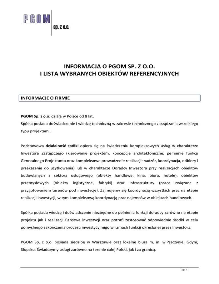 sp. z o.o. INFORMACJA O PGOM SP. Z O.O. I LISTA WYBRANYCH OBIEKTÓW REFERENCYJNYCH INFORMACJE O FIRMIE PGOM Sp. z o.o. działa w Polsce od 8 lat. Spółka posiada doświadczenie i wiedzę techniczną w zakresie technicznego zarządzania wszelkiego typu projektami. Podstawowa działalność spółki opiera się na świadczeniu kompleksowych usług w charakterze Inwestora Zastępczego (kierowanie projektem, koncepcje architektoniczne, pełnienie funkcji Generalnego Projektanta oraz kompleksowe prowadzenie realizacji: nadzór, koordynacja, odbiory i przekazanie do użytkowania) lub w charakterze Doradcy Inwestora przy realizacjach obiektów budowlanych z sektora usługowego (obiekty handlowe, kina, biura, hotele), obiektów przemysłowych (obiekty logistyczne, fabryki) oraz infrastruktury (prace związane z przygotowaniem terenów pod inwestycje). Zajmujemy się koordynacją wszystkich prac na etapie realizacji inwestycji, w tym kompleksową koordynacją prac najemców w obiektach handlowych. Spółka posiada wiedzę i doświadczenie niezbędne do pełnienia funkcji doradcy zarówno na etapie projektu jak i realizacji Państwa inwestycji oraz potrafi zastosować odpowiednie środki w celu pomyślnego zakończenia procesu inwestycyjnego w ramach funkcji określonej przez Inwestora. PGOM Sp. z o.o. posiada siedzibę w Warszawie oraz lokalne biura m. in. w Pszczynie, Gdyni, Słupsku. Świadczymy usługi zarówno na terenie całej Polski, jak i za granicą. Str. 1 sp. z o.o. ZARZĄD SPÓŁKI Patrick Grand: Prezes Spółki • Przez cztery lata pełnił funkcję Dyrektora Technicznego w Pionie Inwestycji Casino Group w Polsce (1995-1999). • Przez cztery lata pracował jako Dyrektor Generalny ds. Nieruchomości w Casino Group w Polsce (1999-2003). • Pracował przy realizacji 19 projektów związanych z budową centrów handlowych (średnia wielkość projektu: 40 milionów Euro - 40.000 m2) Filip Kaczkowski oraz Bartłomiej Arnold: Udziałowcy • Sześć lat pracy w dziale Dyrekcji ds. Technicznych w Grupie Casino w Polsce. • Kilkanaście realizowanych wspólnie inwestycji na stanowisku Kierownika Projektu. NASZA EKIPA Spółka zatrudnia około 50 osób na stanowiskach administracyjnych oraz technicznych. W naszej ekipie pracują doświadczeni kierownicy budowy, kierownicy projektów, koordynatorzy najemców, projektanci oraz inspektorzy. W zależności od specyfiki projektu współpracujemy również z zewnętrznymi specjalistami (projektanci, inspektorzy nadzoru). str. 2 sp. z o.o. NASI KLIENCI Activ-Dev Sp. z o.o. Apsys Polska Sp. z o.o. Centrum Wzgórze Sp. z o.o. Concorde Tychy Sp. z o.o. Decathlon Sp. z o.o. Distribution Casino France Emka SA Feu Vert Polska Sp. z o.o. Floreal SA Galeria Copernicus Toruń Sp. z o.o. (Atrium European Real Estate) Gühring Sp. z o.o. IGC Services – Groupe Casino IVG Polska Sp. z o.o. King Cross Development Karolinka Investments Sp. z o.o. Manhattan Development Sp. z o.o. Mayland Real Estate Sp. z o.o. Metro Group Asset Management Sp. z o.o. Niebieski Dom Sp. z o.o. Opus2 Investment Sp. z o.o. Plan40 Sp. z o.o. „real,- Sp. z o.o. i Spółka” Spółka Komandytowa Retail Park Sochaczew Sp. z o.o. Superhobby Market Budowlany Sp. z o.o. TESCO (Polska) Sp. z o.o. str. 3 sp. z o.o. PROJEKTY NA TERENIE POLSKI: W Gdyni : Współpraca z Centrum Wzgórze Sp. z o.o. przy projekcie przebudowy i rozbudowy Centrum Handlowego „Wzgórze” w Gdyni, m.in.: Pełnienie funkcji inwestora zastępczego, prace projektowe, koordynacja realizacji prac, kierowanie budową oraz nadzory inwestorskie. Aktualnie współpraca przy projekcie polegającym na wybudowaniu nowej części budynku wraz z niezbędną infrastrukturą techniczną, drogami wewnętrznymi, parkingiem, ciągami ruchu pieszych, nośnikami reklam, wjazdami i wyjazdami (2011 – w trakcie). Opracowanie projektu budowlanego sieci zewnętrznych, dróg oraz przyłączy mediów wraz z nadzorem autorskim przy kolejnym etapie rozbudowy Centrum Handlowego „Wzgórze” w Gdyni (2010 – 2011). Inwestor zastępczy przy rozbudowie Centrum Handlowego „Wzgórze” polegającej na dobudowaniu dwóch poziomów parkingu wraz z budową niezbędnych sieci i dróg dojazdowych, modernizacji elewacji, utworzeniu dwóch wejść do istniejącej Galerii Handlowej oraz pracach modernizacyjnych wewnątrz Galerii Handlowej. Zakres prac obejmuje również nadzory inwestorskie (2009 – 2011). Generalny koordynator techniczny i zarządzający inwestycją rozbudowy Centrum Handlowego „Wzgórze” (2007 – 2008). Koordynacja i pilotaż prac najemców w Centrum Handlowym „Wzgórze” (12/2006 – 02/2007). Współpraca z Carrefour Polska : wykonanie dokumentacji projektowej Centrum Handlowego Carrefour w Gdyni wraz z zewnętrznym układem drogowym i sprawowanie nadzoru inwestorskiego (2007 – 2010). Współpraca z Centrum Wzgórze Sp. z o.o. oraz Apsys Polska Sp. z o.o. : pełnienie funkcji koordynatora technicznego dla projektu przebudowy i rozbudowy Centrum Handlowego „Wzgórze” (2006 – 2007). Współpraca z Metro Group Asset Management w zakresie opracowań projektowych dla projektu przebudowy Centrum Handlowego, w tym m.in. projekt architektoniczno-budowlany, inwentaryzacje obiektu, dokumentacja przetargowa, projekty wykonawcze i kontrola projektów powykonawczych (2007). W Słupsku : Współpraca z Mayland Real Estate: jako koordynator techniczny przy rozbudowie Centrum Handlowego „Jantar” w Słupsku; kierowanie projektem centrum handlowego, jak również str. 4 sp. z o.o. przygotowanie, organizacja i koordynacja procesu budowlanego, zapewnienie jego należytego przebiegu, przeprowadzanie rozliczeń inwestycji, nadzory (2010 - 2012). Współpraca z Mayland Real Estate: prace projektowe dla projektu rozbudowy Centrum Handlowego „Jantar” w Słupsku – szczegółowa koncepcja projektowa, projekt budowlany, wystąpienie i uzyskanie pozwolenia na budowę (2009 – 2010). Współpraca z Mayland Real Estate w zakresi
