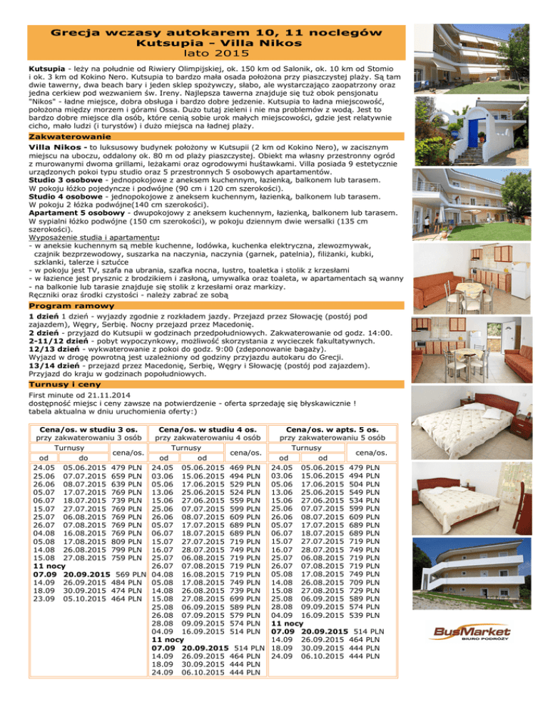 Grecja wczasy autokarem 10, 11 noclegów Kutsupia - Villa Nikos lato 2015 Kutsupia - leży na południe od Riwiery Olimpijskiej, ok. 150 km od Salonik, ok. 10 km od Stomio i ok. 3 km od Kokino Nero. Kutsupia to bardzo mała osada położona przy piaszczystej plaży. Są tam dwie tawerny, dwa beach bary i jeden sklep spożywczy, słabo, ale wystarczająco zaopatrzony oraz jedna cerkiew pod wezwaniem św. Ireny. Najlepsza tawerna znajduje się tuż obok pensjonatu "Nikos" - ładne miejsce, dobra obsługa i bardzo dobre jedzenie. Kutsupia to ładna miejscowość, położona między morzem i górami Ossa. Dużo tutaj zieleni i nie ma problemów z wodą. Jest to bardzo dobre miejsce dla osób, które cenią sobie urok małych miejscowości, gdzie jest relatywnie cicho, mało ludzi (i turystów) i dużo miejsca na ładnej plaży. Zakwaterowanie Villa Nikos - to luksusowy budynek położony w Kutsupii (2 km od Kokino Nero), w zacisznym miejscu na uboczu, oddalony ok. 80 m od plaży piaszczystej. Obiekt ma własny przestronny ogród z murowanymi dwoma grillami, leżakami oraz ogrodowymi huśtawkami. Villa posiada 9 estetycznie urządzonych pokoi typu studio oraz 5 przestronnych 5 osobowych apartamentów. Studio 3 osobowe - jednopokojowe z aneksem kuchennym, łazienką, balkonem lub tarasem. W pokoju łóżko pojedyncze i podwójne (90 cm i 120 cm szerokości). Studio 4 osobowe - jednopokojowe z aneksem kuchennym, łazienką, balkonem lub tarasem. W pokoju 2 łóżka podwójne(140 cm szerokości). Apartament 5 osobowy - dwupokojowy z aneksem kuchennym, łazienką, balkonem lub tarasem. W sypialni łóżko podwójne (150 cm szerokości), w pokoju dziennym dwie wersalki (135 cm szerokości). Wyposażenie studia i apartamentu: - w aneksie kuchennym są meble kuchenne, lodówka, kuchenka elektryczna, zlewozmywak, czajnik bezprzewodowy, suszarka na naczynia, naczynia (garnek, patelnia), filiżanki, kubki, szklanki, talerze i sztućce - w pokoju jest TV, szafa na ubrania, szafka nocna, lustro, toaletka i stolik z krzesłami - w łazience jest prysznic z brodzikiem i zasłoną, umywalka oraz toaleta, w apartamentach są wanny - na balkonie lub tarasie znajduje się stolik z krzesłami oraz markizy. Ręczniki oraz środki czystości - należy zabrać ze sobą Program ramowy 1 dzień 1 dzień - wyjazdy zgodnie z rozkładem jazdy. Przejazd przez Słowację (postój pod zajazdem), Węgry, Serbię. Nocny przejazd przez Macedonię. 2 dzień - przyjazd do Kutsupii w godzinach przedpołudniowych. Zakwaterowanie od godz. 14:00. 2-11/12 dzień - pobyt wypoczynkowy, możliwość skorzystania z wycieczek fakultatywnych. 12/13 dzień - wykwaterowanie z pokoi do godz. 9:00 (zdeponowanie bagaży). Wyjazd w drogę powrotną jest uzależniony od godziny przyjazdu autokaru do Grecji. 13/14 dzień - przejazd przez Macedonię, Serbię, Węgry i Słowację (postój pod zajazdem). Przyjazd do kraju w godzinach popołudniowych. Turnusy i ceny First minute od 21.11.2014 dostępność miejsc i ceny zawsze na potwierdzenie - oferta sprzedaję się błyskawicznie ! tabela aktualna w dniu uruchomienia oferty:) Cena/os. w studiu 3 os. przy zakwaterowaniu 3 osób Turnusy cena/os. od do 24.05 05.06.2015 479 PLN 25.06 07.07.2015 659 PLN 26.06 08.07.2015 639 PLN 05.07 17.07.2015 769 PLN 06.07 18.07.2015 739 PLN 15.07 27.07.2015 769 PLN 25.07 06.08.2015 769 PLN 26.07 07.08.2015 769 PLN 04.08 16.08.2015 769 PLN 05.08 17.08.2015 809 PLN 14.08 26.08.2015 799 PLN 15.08 27.08.2015 759 PLN 11 nocy 07.09 20.09.2015 569 PLN 14.09 26.09.2015 484 PLN 18.09 30.09.2015 474 PLN 23.09 05.10.2015 464 PLN Cena/os. w studiu 4 os. przy zakwaterowaniu 4 osób Turnusy cena/os. od od 24.05 05.06.2015 469 PLN 03.06 15.06.2015 494 PLN 05.06 17.06.2015 529 PLN 13.06 25.06.2015 524 PLN 15.06 27.06.2015 559 PLN 25.06 07.07.2015 599 PLN 26.06 08.07.2015 609 PLN 05.07 17.07.2015 689 PLN 06.07 18.07.2015 689 PLN 15.07 27.07.2015 719 PLN 16.07 28.07.2015 749 PLN 25.07 06.08.2015 719 PLN 26.07 07.08.2015 719 PLN 04.08 16.08.2015 719 PLN 05.08 17.08.2015 749 PLN 14.08 26.08.2015 739 PLN 15.08 27.08.2015 699 PLN 25.08 06.09.2015 589 PLN 26.08 07.09.2015 579 PLN 28.08 09.09.2015 574 PLN 04.09 16.09.2015 514 PLN 11 nocy 07.09 20.09.2015 514 PLN 14.09 26.09.2015 464 PLN 18.09 30.09.2015 444 PLN 24.09 06.10.2015 444 PLN Cena/os. w apts. 5 os. przy zakwaterowaniu 5 osób Turnusy cena/os. od od 24.05 05.06.2015 479 PLN 03.06 15.06.2015 494 PLN 05.06 17.06.2015 504 PLN 13.06 25.06.2015 549 PLN 15.06 27.06.2015 534 PLN 25.06 07.07.2015 599 PLN 26.06 08.07.2015 609 PLN 05.07 17.07.2015 689 PLN 06.07 18.07.2015 689 PLN 15.07 27.07.2015 719 PLN 16.07 28.07.2015 749 PLN 25.07 06.08.2015 719 PLN 26.07 07.08.2015 719 PLN 05.08 17.08.2015 749 PLN 14.08 26.08.2015 709 PLN 15.08 27.08.2015 729 PLN 25.08 06.09.2015 589 PLN 28.08 09.09.2015 574 PLN 04.09 16.09.2015 539 PLN 11 nocy 07.09 20.09.2015 514 PLN 14.09 26.09.2015 464 PLN 18.09 30.09.2015 444 PLN 24.09 06.10.2015 444 PLN Cena zawiera - przejazd autokarem (toaleta, barek, DVD, klimatyzacja) 10 lub 11 noclegów w studio lub apartamencie opieka pilota podczas podróży, rezydenta na miejscu ubezpieczenie KL (obejmuje również choroby przewlekłe), NNW, bagaż pościel, sprzątanie końcowe Zniżki i dopłaty Zniżki: - 399 - 449 PLN - cena dla dziecka do lat 4 jako dodatkowa osoba w studio lub apartamencie - 100 PLN - zniżka dla dziecka do lat 12 - 100 PLN - zniżka w przypadku łączenia turnusów Dopłaty: - pokój jednoosobowy 99 PLN - 499 PLN - dopłata w zależności od terminu - Wyżywienie istnieje możliwość zakupu obiadu lub/i kolacji na miejscu w tawernie w cenie ok. 8 E. - Leżaki na plaży dostępne po złożeniu zamówienia barze od 2 EUR. - Wypożyczalnia rowerów - na telefon wypożyczenie roweru na 1 dzień 20 zł wypożyczenie roweru na 3 dni 35 zł wypożyczenie roweru na 6 dni 55 zł wypożyczenie roweru na 9 dni 70 zł wypożyczenie roweru na 10 dni 75 zł Ręczniki oraz środki czystości - należy zabrać z
