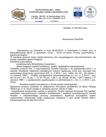 OGÓLNOPOLSKA IZBA GOSPODARKI NIERUCHOMOŚCIAMI Gdańsk 80-355, ul. Beniowskiego 84 b Tel. 585572854 lub tel./fax 585584521 do 25 www.oign.pl [email protected] Gdańsk, 01.06.2015 roku Szanowna/y Pani/Pan Zapraszamy na szkolenie w dniu 08.09.2015r w Warszawie w lokalu przy ul Marszałkowskiej 58/19, w godzinach 10.00 – 16.00 na temat „Proces upominawczy i egzekucja długów”. W szkoleniu powinni wziąć udział kierownicy firm zarządzających nieruchomościami, ale przede wszystkim główni księgowi. Szkolenie poprowadzą: przedstawiciele Ministerstwa Gospodarki, główni księgowi (zakład budżetowy, spółka, spółdzielnia mieszkaniowa). Podstawa prawna: Par. 2 rozporządzenia ministra finansów z 30 października 2014 r. w sprawie określenia należności pieniężnych, których egzekucja może być wszczęta bez uprzedniego doręczenia upomnienia (DZ. U. Z 2014 r. poz. 1494). Art. 42 – 45 ustawy z 14 czerwca 1960 r. - Kodeks postępowania administracyjnego (t.j. Dz. U. Z 2013 r. poz. 267 ze zm.). Art. 15 par. 1 i 2, art. 33 par. 1 pkt 7, art. 59 par. 59 par. 1 pkt 7 ustawy z 17 czerwca 1966 r. o postępowaniu egzekucyjnym w administracji (t. j. Dz. U. Z 2014 r. poz. 1619). Szkolenie będzie prowadzone w formie panelu dyskusyjnego. Zgłoszenia prosimy podawać na załączonym formularzu przesłanym do Biura Obsługi OIGN (zał. nr 1). Koszt udziału w szkoleniu wynosi 120,00 zł netto. Uzasadnienie konieczności udziału w szkoleniu. Trudna sytuacja finansowa firm (spółek, spółdzielni mieszkaniowych, zakładów budżetowych i wspólnot mieszkaniowych) wynika również z niedoskonałego procesu prowadzenia egzekucji szczególnie wobec użytkowników (właścicieli) lokali użytkowych, świadczą o tym wyniki kontroli NIK-u, przeprowadzonej za lata 2012-2013. FORMULARZ ZGŁOSZENIA NA SZKOLENIE Proszę wypełnić formularz i przesłać go do: Ogólnopolska Izba Gospodarki Nieruchomościami ul. Beniowskiego 84 B, 80-355 Gdańsk tel/ faks (0-58) 557 28 54, e-mail: [email protected] KONTO IZBY : Bank Millennium S.A. nr 65 1160 2202 0000 0000 6190 6295 W tytule płatności prosimy wpisać temat szkolenia UCZESTNIK NAZWISKO I IMIĘ: TELEFON: E-MAIL: DATA I MIEJSCE URODZENIA NR LICENCJI ZAWODOWEJ ZARZĄDCY NIERUCHOMOŚCI/ ADRES Zamieszkania ADRES: KOD POCZTOWY: MIEJSCOWOŚĆ: Wrzesień 2015 TERMIN Koszt udziału ROZPOCZĘCIA 08.09.2015 „Proces upominawczy i egzekucja długów” 120zł netto/osoba Koszt uczestnictwa w szkoleniu obejmuje udział w szkoleniu, materiały. Oświadczamy, iż akceptujemy warunki uczestnictwa i upoważniamy OIGN do wystawienia rachunku bez naszego podpisu. Podaj dane do rachunku, jeżeli są inne niż dane uczestnika powyżej. NAZWA: ADRES: KOD POCZTOWY: MIEJSCOWOŚĆ: NIP: Oświadczam, że wyrażam zgodę na przetwarzanie moich danych osobowych przez OIGN w związku z prowadzoną procedurą, wiem, że udostępnienie danych ma charakter dobrowolny, oraz oświadczam, że znam swoje prawa (zgodnie z Ust. z dn. 29.08.97 r. o Ochronie Danych Osobowych, Dz. U. Nr 133 poz. 883). Data i podpis OGÓLNOPOLSKA IZBA GOSPODARKI NIERUCHOMOŚCIAMI Gdańsk 80-355, ul. Beniowskiego 84 b Tel. 585572854 lub tel./fax 585584521 do 25 www.oii;:n.pl A C 166 [email protected] Gdańsk, 25.06.2015 roku Szanowni Państwo ! Zapraszamy na bardzo ważne szkolenie w dniu 27.08.2015 roku w naszej siedzibie w Warszawie, ul. Marszałkowska 58/19, w godzinach 11.00 - 17.00 w tworzonym przez nas Centrum mediacyjno - szkoleniowym na temat bieżących problemów związanych z jakością zarządzania . Wykłady wygłosi Pani Eugenia Śleszyńska specjalista Federacji ds. ekonomiczno finansowych. Koszt udziału w szkoleniu wynosi 350,00 zł netto . Szkolenie organizujemy dla grupy naszych ekspertów terenowych w związku z odpowiedzialnością właściciela lub zarządcy obiektu budowlanego . Tytuł szkolenia: Aspekty prawne, podatkowe i finansowe usług zarządzania nieruchomościami, w stanie prawnym po deregulacji zawodu zarządcy nieruchomości. Uczestnik szkolenia otrzyma świadectwo Eksperta . Sprawę traktujemy jako bardzo ważną z uwagi na : - nowelizację prawa budowlanego , - wyniki kontroli NIK-u w szeregu gmin, wyniki WSA i NSA w Warszawie i Białymstoku , oraz powtarzające się błędne stwierdzenia właścicieli nieruchomości i firm zarządzających nieruchomościami, że zarządcy ponoszą odpowiedzialność cywilną z mocy prawa za nieprawidłowości związane z gospodarowaniem nieruchomościami . Utworzona grupa Ekspertów będzie miała zadanie zorganizowania na swoim terenie podobnego szkolenia w miesiącu wrześniu, październiku i listopadzie 2015 r. połączonego ewentualnie z promocją dla firm sponsorujących to szkolenie. Cena dla uczestników szkolenia terenowego będzie uzależniona od Waszych terenowych możliwości. Izba wskaże kompetentnego wykładowcę (jego odpłatność jest określona w wysokości 1.500,00 zł netto za 6 godzin zajęć) oraz przekaże materiały szkoleniowe . Takie nowe podejście do szkoleń terenowych spowodowane jest stwierdzeniem występowania działań nieprofesjonalnych, a wręcz błędną interpretacją przepisów w terenie. Szkolenie ma odpowiedzieć na następujące pytania : 1. Jakie elementy przedmiotowo istotne powinna zawierać umowa o zarządzanie nieruchomością? 2. Kiedy firma zarządzająca jako zleceniobiorca usługi ponosi odpowiedzialność cywilną? 3. Czy firma zarządzająca jako zleceniobiorca usługi może ponosić odpowiedzialność z mocy prawa, np. z mocy Prawa budowlanego? 4. Czy firma zarządzająca jako zleceniobiorca usługi może ponosić z mocy prawa odpowiedzialność za rachunkowość wspólnoty mieszkaniowej i za jej podatki? 5. Przepisy kodeksu cywilnego oraz ustawy o VAT w odniesieniu do usług zarządzania nieruchomościami . W załączeniu program szkolenia: 1. Usługa zarządzania nieruchomościami po deregulacji zawodu zarządcy nieruchomości. Aspekty ustawy o świadczeniu usług w RP, ust