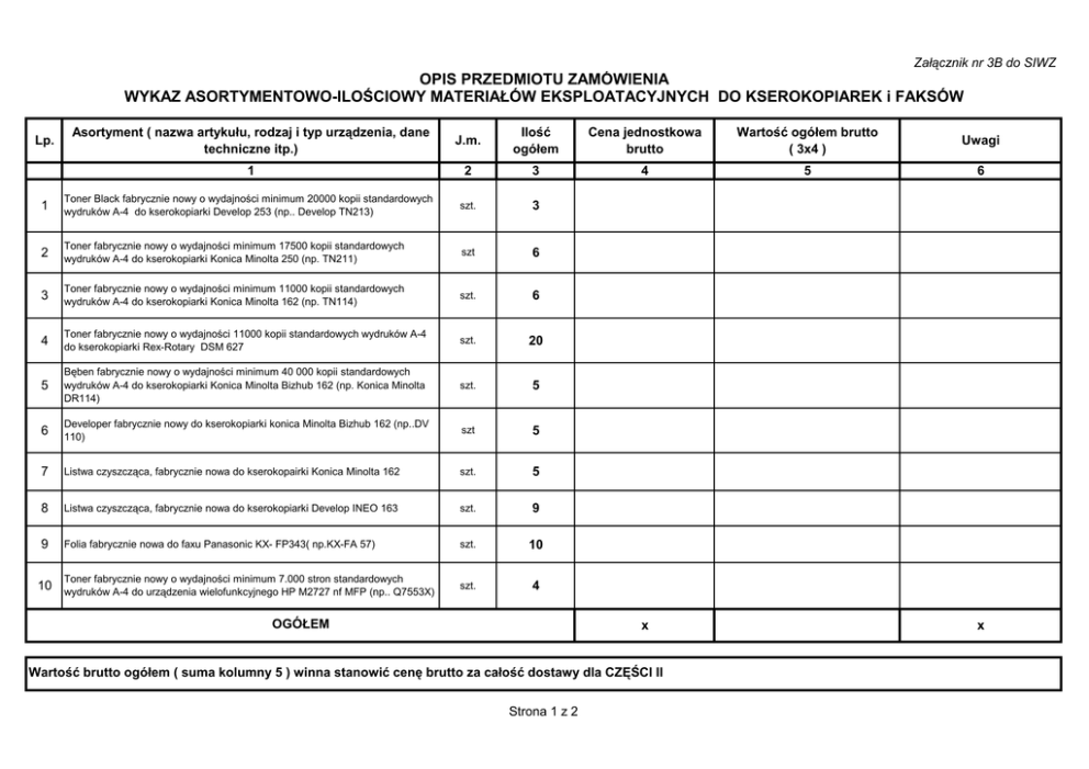 Załącznik nr 3B do SIWZ OPIS PRZEDMIOTU ZAMÓWIENIA WYKAZ ASORTYMENTOWO-ILOŚCIOWY MATERIAŁÓW EKSPLOATACYJNYCH DO KSEROKOPIAREK i FAKSÓW Asortyment ( nazwa artykułu, rodzaj i typ urządzenia, dane techniczne itp.) J.m. Ilość ogółem Cena jednostkowa brutto Wartość ogółem brutto ( 3x4 ) Uwagi 1 2 3 4 5 6 1 Toner Black fabrycznie nowy o wydajności minimum 20000 kopii standardowych wydruków A-4 do kserokopiarki Develop 253 (np.. Develop TN213) szt. 3 2 Toner fabrycznie nowy o wydajności minimum 17500 kopii standardowych wydruków A-4 do kserokopiarki Konica Minolta 250 (np. TN211) szt 6 3 Toner fabrycznie nowy o wydajności minimum 11000 kopii standardowych wydruków A-4 do kserokopiarki Konica Minolta 162 (np. TN114) szt. 6 4 Toner fabrycznie nowy o wydajności 11000 kopii standardowych wydruków A-4 do kserokopiarki Rex-Rotary DSM 627 szt. 20 5 Bęben fabrycznie nowy o wydajności minimum 40 000 kopii standardowych wydruków A-4 do kserokopiarki Konica Minolta Bizhub 162 (np. Konica Minolta DR114) szt. 5 6 Developer fabrycznie nowy do kserokopiarki konica Minolta Bizhub 162 (np..DV 110) szt 5 7 Listwa czyszcząca, fabrycznie nowa do kserokopairki Konica Minolta 162 szt. 5 8 Listwa czyszcząca, fabrycznie nowa do kserokopiarki Develop INEO 163 szt. 9 9 Folia fabrycznie nowa do faxu Panasonic KX- FP343( np.KX-FA 57) szt. 10 szt. 4 Lp. Toner fabrycznie nowy o wydajności minimum 7.000 stron standardowych 10 wydruków A-4 do urządzenia wielofunkcyjnego HP M2727 nf MFP (np.. Q7553X) OGÓŁEM x Wartość brutto ogółem ( suma kolumny 5 ) winna stanowić cenę brutto za całość dostawy dla CZĘŚCI II Strona 1 z 2 x W przypadku zaoferowania produktów równowaŜnych, tj. innych niŜ w opisie przedmiotu zamówienia (załącznik nr 3B do SIWZ), Wykonawca zobowiązany jest dołączyć do oferty oryginał lub poświadczoną za zgodność z oryginałem przez Wykonawcę kopię dokumentu wystawionego przez producenta danego równowaŜnego materiału eksploatacyjnego lub jego uprawnionego/autoryzowanego przedstawiciela – według wzoru załącznik nr 5 do SIWZ, wraz z jego tłumaczeniem na język polski poświadczonym przez Wykonawcę w przypadku, gdy dany dokument jest wystawiony w języku obcym. Ponadto Wykonawcy oferujący produkty równowaŜne są zobowiązani złoŜyć opis przedmiotu zamówienia wypełniony w kolumnie „uwagi" wskazując rodzaj oferowanych produktów równowaŜnych - Wykonawca jest zobowiązany dołączyć jedno oświadczenie do kaŜdego jednego równowaŜnego materiału eksploatacyjnego. ` Wszystkie materiały objęte niniejszym zamówieniem muszą być materiałami fabrycznie nowymi, nieuŜywanymi, wolnymi od wad, kompletnymi i najwyŜszej jakości, oryginalnie zapakowanymi, nie noszącymi śladów otwierania, nie regenerowanymi, nie poddanymi procesowi ponownego napełniania, recyklingu, demontaŜu lub wymiany jakichkolwiek elementów. Wszystkie elementy danego materiału eksploatacyjnego nie wchodziły wcześniej (pierwotnie) w całości ani w części w skład innych materiałów, są wyrobami fabrycznie nowymi, nieuŜywanymi, nieregenrowalnymi, nierefabrykowanymi, a ich zastosowanie nie moŜe spowodować utraty gwarancji producenta sprzętu. Materiały eksploatacyjne do wszystkich modeli urządzeń jednego producenta sprzętu, wskazanych w załączniku nr 3B do SIWZ, np. do urządzeń firmy Develop lub Konica Minolta, muszą pochodzić od jednego producenta materiałów eksploatacyjnych. Ilekroć w opisie przedmiotu zamówienia zawartym w SIWZ lub ogłoszeniu uŜyte są znaki towarowe, patenty lub pochodzenie, to przyjmuje się, Ŝe wskazaniom takim towarzyszą wyrazy „lub równowaŜne” tj. spełniające taką samą funkcję uŜytkową oraz minimalne wymagania techniczne o parametrach nie gorszych niŜ wskazane w SIWZ. Podane w załączniku nr 3B ilości materiałów eksploatacyjnych są wielkościami orientacyjnymi, oszacowanymi na podstawie zuŜycia w roku poprzednim oraz przewidywanego zapotrzebowania i mają jedynie charakter informacyjny. Zamawiający w zaleŜności od swoich potrzeb moŜe w okresie obowiązywania umowy zamówić mniejszej ilości materiałów eksploatacyjnych, co nie będzie stanowiło podstawy do zmiany cen jednostkowych. Wykonawcy, z którym Zamawiający podpisze umowę nie słuŜy Ŝadne roszczenie o realizację dostawy w wielkościach podanych w załączniku. …………………………………., dnia ………………….. 2009 r. ………………………………………………………………………………… Podpis osoby (osób) upowaŜnionej do występowania w imieniu Producenta (PoŜądany czytelny podpis albo podpis i pieczątka z imieniem i nazwiskiem). Strona 2 z 2