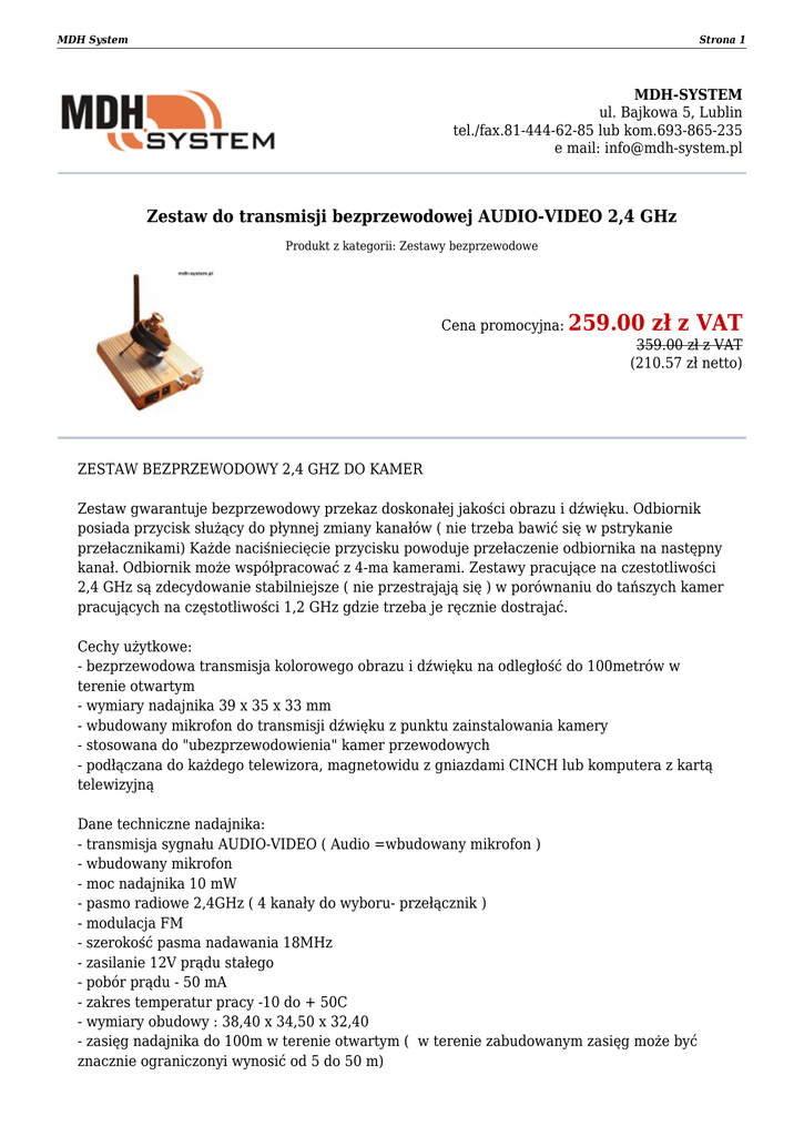 MDH System Strona 1 MDH-SYSTEM ul. Bajkowa 5, Lublin tel./fax.81-444-62-85 lub kom.693-865-235 e mail: [email protected] Zestaw do transmisji bezprzewodowej AUDIO-VIDEO 2,4 GHz Produkt z kategorii: Zestawy bezprzewodowe Cena promocyjna: 259.00 zł z VAT 359.00 zł z VAT (210.57 zł netto) ZESTAW BEZPRZEWODOWY 2,4 GHZ DO KAMER Zestaw gwarantuje bezprzewodowy przekaz doskonałej jakości obrazu i dźwięku. Odbiornik posiada przycisk służący do płynnej zmiany kanałów ( nie trzeba bawić się w pstrykanie przełacznikami) Każde naciśniecięcie przycisku powoduje przełaczenie odbiornika na następny kanał. Odbiornik może współpracować z 4-ma kamerami. Zestawy pracujące na czestotliwości 2,4 GHz są zdecydowanie stabilniejsze ( nie przestrajają się ) w porównaniu do tańszych kamer pracujących na częstotliwości 1,2 GHz gdzie trzeba je ręcznie dostrajać. Cechy użytkowe: - bezprzewodowa transmisja kolorowego obrazu i dźwięku na odległość do 100metrów w terenie otwartym - wymiary nadajnika 39 x 35 x 33 mm - wbudowany mikrofon do transmisji dźwięku z punktu zainstalowania kamery - stosowana do "ubezprzewodowienia" kamer przewodowych - podłączana do każdego telewizora, magnetowidu z gniazdami CINCH lub komputera z kartą telewizyjną Dane techniczne nadajnika: - transmisja sygnału AUDIO-VIDEO ( Audio =wbudowany mikrofon ) - wbudowany mikrofon - moc nadajnika 10 mW - pasmo radiowe 2,4GHz ( 4 kanały do wyboru- przełącznik ) - modulacja FM - szerokość pasma nadawania 18MHz - zasilanie 12V prądu stałego - pobór prądu - 50 mA - zakres temperatur pracy -10 do + 50C - wymiary obudowy : 38,40 x 34,50 x 32,40 - zasięg nadajnika do 100m w terenie otwartym ( w terenie zabudowanym zasięg może być znacznie ograniczonyi wynosić od 5 do 50 m) MDH System Strona 2 Dane techniczne odbiornika: - odbiorcze pasmo odbiorcze 2,4GHz - częstotliwość pośrednia 480MHz - demodulacja FM - czułość odbiornika < -85dBm - oporność falowa anteny 50ohm - wyjście sygnału video i audio typu Jack - napięcie zasilające 12V prądu stałego - zakres temperatur pracy -10 do + 50C - wymiary 78 x 92 x 23 mm - masa 200g W zalezności od dostawy nadajnik może wystepować w wersjach z różnymi przełącznikami wyboru kanału nadawania. Zapraszamy do naszego sklepu internetowego www.mdh-system.pl Dokument wygenerowany 2017-03-02 o godzinie 05:24
