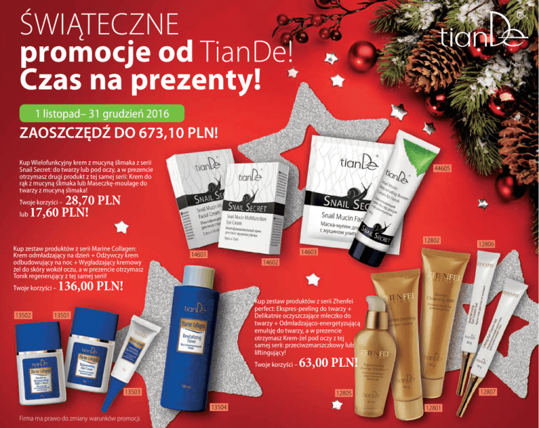 ŚWIĄTECZNE promocje od TianDe! Czas na prezenty! 1 listopad– 31 grudzień 2016 ZAOSZCZĘDŹ DO 673,10 PLN! Kup Wielofunkcyjny krem z mucyną ślimaka z serii Snail Secret: do twarzy lub pod oczy, a w prezencie otrzymasz drugi produkt z tej samej serii: Krem do rąk z mucyną ślimaka lub Maseczkę-moulage do twarzy z mucyną ślimaka! 44605 28,70 PLN 17,60 PLN! Twoje korzyści – lub Kup zestaw produktów z serii Marine Collagen: Krem odmładzający na dzień + Odżywczy krem odbudowujący na noc + Wygładzający kremowy żel do skóry wokół oczu, a w prezencie otrzymasz Tonik regenerujący z tej samej serii! Twoje korzyści – 13502 12802 14603 14601 12806 14602 136,00 PLN! Kup zestaw produktów z serii Zhenfei perfect: Ekspres-peeling do twarzy + Delikatnie oczyszczające mleczko do twarzy + Odmładzająco-energetyzującą emulsję do twarzy, a w prezencie otrzymasz Krem-żel pod oczy z tej samej serii: przeciwzmarszczkowy lub liftingujący! 13501 Twoje korzyści – 13503 12807 12805 13504 Firma ma prawo do zmiany warunków promocji. 63,00 PLN! 12801 Kup Transdermalny kompleks: efekt botoksu lub efekt liftingu, a w prezencie otrzymasz Przeciwzmarszczkowy żel-eliksir do twarzy: rewitalizujący lub ekstra-nawilżający! Twoje korzyści – 75,00 PLN! Kup opakowanie Płatków do zmywania lakieru oraz Zestaw pędzli do makijażu, a w prezencie otrzymasz Szklany pilnik do paznokci „Master Nail”! 54101 Twoje korzyści – 14802 Kup Sztyft kryształowy „Natural Veil“, a w prezencie otrzymasz 2 dowolne kostki Ręcznie robionego naturalnego mydła! 20,00 PLN! Twoje korzyści – 90201 12202 30,20 PLN! 90140 Kup opakowanie Masek do twarzy i szyi „Aktywny tlen“, a w prezencie otrzymasz opakowanie Masek do twarzy i szyi „Pestki winogron“! 12201 Twoje korzyści – 54102 90102 30101 65,80 PLN! 140101 140107 Kup Kremowy żel pod prysznic „Aloes” lub Balsam do ciała „Jedwabna róża“, a w prezencie otrzymasz Fito-sól do kąpieli! 14803 Twoje korzyści – 12108 13,00 PLN! 42303 41105 Kup Przeciwzmarszczkowe mleczko do mycia twarzy oraz Peeling do twarzy - z serii Tibetan Herbs, a w prezencie otrzymasz Odżywczy krem przeciwzmarszczkowy z tej samej serii! Twoje korzyści – 28,50 PLN! 80904 Kup Tusz do rzęs, a w prezencie otrzymasz 2 Kredki do ust i oczu „Pro Visage” w dowolnych kolorach! 12115 Twoje korzyści – 42301 18,80 PLN! 32506 12112 Kup Kąpiel do stóp: ziołową lub tonizującą, a w prezencie otrzymasz Krem do stóp z olejem węża: profilaktyczny lub regeneracyjny! Twoje korzyści – 80203 32601 Firma ma prawo do zmiany warunków promocji. 32603 10,00 PLN! 41106 Kup 10 opakowań Plastrów detoksykacyjnych do stóp, a w prezencie otrzymasz Kosmetyczne żelowe rękawiczki + skarpetki „Hydrobalance”! Twoje korzyści – 102,60 PLN! Kup 2 Kremy z tłuszczem węża: do stóp oraz do rąk, a w prezencie otrzymasz dowolną Maskę Dual System spośród: 51404-51406, 51408! 12,50 lub 11,00 lub 10,20 PLN! Twoje korzyści – 40114 41101 40113 51404, 51405, 51406, 51408 41102 41314 Kup Ziołowy żel do nóg „Slaviton”, a w prezencie otrzymasz opakowanie Ziołowych plastrów do ciała „TieGao“! 120105 Kup 2 saszetki Herbaty imbirowej, a w prezencie otrzymasz trzecią saszetkę! Twoje korzyści – 30114 18,00 PLN! 30113 Twoje korzyści – 9,00 PLN! 30119 34401 Kup Żel do masażu „Ortofit”, a w prezencie otrzymasz 2 opakowania Ziołowych plastrów do ciała: „Dong Feng“ oraz „Zhui Feng“! Firma ma prawo do zmiany warunków promocji. 44402 Twoje korzyści – 42,00 PLN!