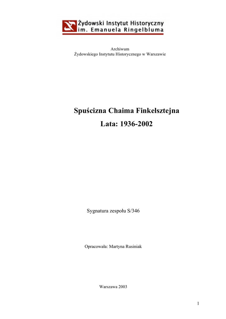 Archiwum Żydowskiego Instytutu Historycznego w Warszawie Spuścizna Chaima Finkelsztejna Lata: 1936-2002 Sygnatura zespołu S/346 Opracowała: Martyna Rusiniak Warszawa 2003 1 Spuścizna Chaima Finkelsztejna Lata: 1936-2002 Dzieje Zespołu archiwalnego Spuścizna Chaima Finkelsztejna, to zespół dokumentów, który znalazł się w ŻIH po śmierci autora, przekazany przez jego żonę. Mamy tu szereg listów, głównie z czasów wojny. Poza tym w spuściźnie znajduje się duża ilość czasopism głównie w jidysz zebranych po wojnie. Zespół po uporządkowaniu i opracowaniu liczy 178 jednostek archiwalnych, które myślę, że ułożyłam zgodnie jak sądzę z życzeniem autora. Spuścizna Chaima Finkelsztejna obejmuje materiały z lat 1936 – 2002. W wyniku opracowania, uporządkowania zespołu powstało sześć grup tematycznych. Grupę I stanowią dokumenty – dotyczące głównie Chaima Finkelsztejna. Grupę II stanowi korespondencja, która została podzielona na wojenną i powojenną, oraz prywatną: z rodziną i znajomymi; i urzędową. Grupa III obejmuje memoriały, notatki, projekty, prace w przygotowaniu z lat 1940 – do lat sześćdziesiątych XX w.; To fragmenty biografii Chaima Finkelsztejna, maszynopisy artykułów o czasopiśmie „Haynt”, o Ilji Schorze. Grupa IV to książki, broszury, czasopisma, wycinki prasowe, dotyczące Chaima Finkelsztejna lub napisane przez niego. Grupa V – to rachunki, bilet kolejowy, karta pokładowa, drobne notatki dotyczące różnych spraw. Grupę VI stanowią zdjęcia Chaima Finkelsztejna, Szmula Szwerdszarfa, Paula Bluma, Marysi Gierszonowicz z córeczką Waldeczką oraz zdjęcia apteki pod „Orłem” w getcie krakowskim. Większość z dokumentów zachowana jest w dobrym stanie. W wyniku opracowania spuścizny procedurze brakowania nie zostały poddane żadne materiały. Chaim Finkelsztejn, nazywany również przez bliskich Heńkiem lub panem Finkiem, urodził się 11 sierpnia 1899 roku w Warszawie. Rodzicami jego byli: Wolf Finkelsztejn (nauczyciel) i Chana. Miał trzech braci i dwie siostry: Dawida, przebywającego podczas wojny w getcie warszawskim; Josefa (Józefa) – zamieszkałego podczas wojny z żoną Zosią w Otwocku; Leona Arje (Lolka), który z żoną Noemi i córką Sarą mieszkał podczas wojny i po wojnie w Palestynie; Marysię Gierszonowicz, która z mężem Gienkiem i córeczką Waldemarą mieszkała w Białymstoku, a następnie w Słonimiu; Esterę, która przebywała podczas wojny w getcie warszawskim. Chaim Finkelsztejn ożenił się z Rywką z domu Ajzenberg 22.02.1924 w Warszawie ( Rywka ur. w 1897 r. w Białej Podlaskiej, córka Mendla Ajzenberga i Estery z domu Szklarz, umarła 21.04.1943 roku w Warszawie). Mieli dwie córki: Esterę (Tusię) urodzona 1925 r. w Warszawie, która umarła w getcie warszawskim i Awiwę - ur. 17.11.1931 w Warszawie, której udało się przeżyć wojnę po stronie aryjskiej i w listopadzie 1945 roku spotkać z ojcem w Nowym Jorku, gdzie ukończyła Columbia University i została psychoterapeutą. Syn Awiwy – Rishon Blumberg jest absolwentem Business School na Philadelphia University. Chaim Finkelsztejn zaczął swoją pracę w syjonistycznym czasopiśmie „Haynt” w 1918 roku. W latach 1936-1939 był dyrektorem tego czasopisma. Jako syjonista należał do grupy „A” (Al Hamishmar). W 1938 roku wydano jego książkę "Palestyna w pracy i walce"(Palestine in Tail and Fight). Jako dyrektor czasopisma latem 1939 roku został delegatem na Kongres Syjonistyczny w Genewie. Z powodu wybuchu wojny nie mógł powrócić do Polski, postał w Paryżu, skąd wyjechał w listopadzie 1939 roku do Nowego Jorku. 2 Po wojnie pracował w Institute of Jewish Research in New York City (Instytut Badań Żydowskich w Nowym Jorku) jako administrator i badacz Holocaustu. Wykaz skrótów: NY – New York msnp – maszynopis rkps – rękopis ang. – angielski pol. – polski ros. – rosyjski niem. – niemiecki franc. – francuski ss. – stron str. – strona k. – karta/karty r. – rok 3 Spis zawartości inwentarza: I. Dokumenty 1-14 II. Korespondencja 15-125 1. Korespondencja wojenna 15-82 a. Korespondencja z rodziną w okupowanej Warszawie i w getcie warszawskim 1939-1942 15-22 Korespondencja rodziny do Chaima Finkelsztejna 15-18 Korespondencja Chaima Finkelsztejna do rodziny: żony Rywki i córek: Estery i Awiwy 19-22 b. Korespondencja wojenna – inne 23-82 Korespondencja prywatna 23-71 Korespondencja urzędowa 72-82 2. Korespondencja powojenna Korespondencja w sprawie przyjazdu ocalałej córki Awiwy Finkelsztejn 83-125 do ojca Chaima Finkelsztejna - 1945 rok 83-108 Korespondencja prywatna 109-115 Korespondencja urzędowa 116-125 III. Memoriały, notatki, projekty, prace w przygotowaniu 126-135 IV. Książki, broszury, czasopisma, wycinki prasowe 136-166 V. Rachunki, bilety, drobne notatki, itp. 167-172 VI. Zdjęcia 173-178 4 Inwentarz Spuścizna Chaima Finkelsztejna I. Dokumenty 1. Legitymacja dziennikarska na nazwisko Chaima Finkelsztejna - przedstawiciela pisma „Haynt” Wydana w 1936 r. ważna do 1939 r.; ze zdjęciem – 1 k. 2. Legitymacja Syndykatu Dziennikarzy Warszawskich na nazwisko - Chaim Finkelsztejn dająca taryfę ulgową na przejazdy tramwajem wydana w 1937 ważna do 1939, pol.- franc.; Ze zdjęciem – 2 k. 3. Paszport RP na nazwisko Chaim Finkelsztejn Wydany przez starostę grodzkiego w 1938, ważny na wszystkie kraje w europie i poza nią; pol.; ze zdjęciem, stemple polskiej kontroli granicznej w: Śniatyniu, Landwarowie, Zbąszynie, Turmoncie; wizy m.in. do: Palestyny, Rumunii, Istambułu, Szwajcarii, wizy emigracyjne wydane w Montrealu w Kanadzie; odcisk palca; dołączona kartka z kolejnymi stemplami wiz – 23 k. 4. Tymczasowy dokument tożsamości na nazwisko Chaim Finkelsztejn wydany w Paryżu Wydany 21 października 1939 r., franc.; Ze zdjęciem i odciskami palców – 2 k. 5. Zaświadczenie złożenia dokumentu osobistego przez Chaima Finkelsztejna w k