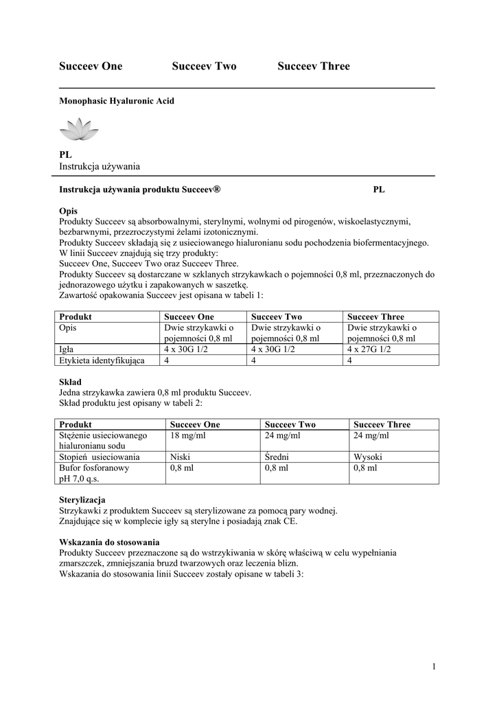 Succeev One Succeev Two Succeev Three Monophasic Hyaluronic Acid PL Instrukcja używania Instrukcja używania produktu Succeev® PL Opis Produkty Succeev są absorbowalnymi, sterylnymi, wolnymi od pirogenów, wiskoelastycznymi, bezbarwnymi, przezroczystymi żelami izotonicznymi. Produkty Succeev składają się z usieciowanego hialuronianu sodu pochodzenia biofermentacyjnego. W linii Succeev znajdują się trzy produkty: Succeev One, Succeev Two oraz Succeev Three. Produkty Succeev są dostarczane w szklanych strzykawkach o pojemności 0,8 ml, przeznaczonych do jednorazowego użytku i zapakowanych w saszetkę. Zawartość opakowania Succeev jest opisana w tabeli 1: Produkt Opis Igła Etykieta identyfikująca Succeev One Dwie strzykawki o pojemności 0,8 ml 4 x 30G 1/2 4 Succeev Two Dwie strzykawki o pojemności 0,8 ml 4 x 30G 1/2 4 Succeev Three Dwie strzykawki o pojemności 0,8 ml 4 x 27G 1/2 4 Skład Jedna strzykawka zawiera 0,8 ml produktu Succeev. Skład produktu jest opisany w tabeli 2: Produkt Stężenie usieciowanego hialuronianu sodu Stopień usieciowania Bufor fosforanowy pH 7,0 q.s. Succeev One 18 mg/ml Succeev Two 24 mg/ml Succeev Three 24 mg/ml Niski 0,8 ml Średni 0,8 ml Wysoki 0,8 ml Sterylizacja Strzykawki z produktem Succeev są sterylizowane za pomocą pary wodnej. Znajdujące się w komplecie igły są sterylne i posiadają znak CE. Wskazania do stosowania Produkty Succeev przeznaczone są do wstrzykiwania w skórę właściwą w celu wypełniania zmarszczek, zmniejszania bruzd twarzowych oraz leczenia blizn. Wskazania do stosowania linii Succeev zostały opisane w tabeli 3: 1 Produkt Wskazania do stosowania Succeev One Spłycanie drobnych zmarszczek Succeev Two Spłycanie średnich i głębokich zmarszczek Miejsce Wstrzyknięcia Powierzchniowa warstwa skóry właściwej Środkowa warstwa skóry właściwej Igły 30G ½ 30G ½ Succeev Three Spłycanie głębokich zmarszczek oraz powiększanie ust Środkowa i (lub) głęboka warstwa skóry właściwej 27G 1/2 Przeciwwskazania Należy omówić z pacjentem wszystkie przeciwskazania do stosowania produktów z linii Succeev: • Pacjenci z nadwrażliwością na którykolwiek ze składników produktu, szczególnie kwas hialuronowy. • Pacjenci z chorobą autoimmunologiczną w wywiadzie. • Pacjenci ze skłonnością do bliznowacenia hipertroficznego. • Pacjenci z zakażeniami paciorkowcowymi. • Kobiety w ciąży lub karmiące piersią. • Młodzież poniżej 18. roku życia. • Nie wolno wstrzykiwać produktów Succeev do naczyń krwionośnych, ścięgien, więzadeł oraz kości. • Nie wolno wstrzykiwać produktów Succeev w worki pod oczami lub powieki. • Nie wolno wstrzykiwać produktów Succeev Two ani Succeev Three w kurze łapki. • Nie wolno stosować produktów Succeev w połączeniu z innymi technikami medycyny estetycznej takimi jak peeling, dermabrazja lub jakimikolwiek innymi metodami leczenia. • Brak jest badań klinicznych dotyczących łącznego użycia produktów Succeev z wyżej wymienionymi metodami leczenia oraz innymi wypełniaczami stosowanymi wcześniej. Środki ostrożności dotyczące stosowania • Przed rozpoczęciem zabiegu należy przekazać pacjentowi informacje o produkcie, przeciwskazaniach do jego stosowania, możliwych działaniach niepożądanych oraz poinformować o czasowym utrzymywaniu się rezultatów zabiegu. • Przed użyciem należy sprawdzić integralność saszetki oraz datę ważności strzykawki i igły. Nie stosować produktów po upływie terminu ważności lub jeśli saszetka została otwarta lub uszkodzona. • Kwas hialuronowy wytrąca się w obecności czwartorzędowych soli amoniowych (takich jak chlorek benzalkoniowy). Należy unikać kontaktu produktów Succeev z takimi substancjami. • Skórę wrażliwą można wcześniej znieczulić. Należy pamiętać, że znieczulenie może powodować miejscowe zaczerwienienie lub nadwrażliwość. • Nie należy wykonywać nadmiernej korekcji (nadmiernego wypełnienia). • Pacjent powinien unikać nakładania makijażu przez 12 godzin po zabiegu oraz unikać sauny, łaźni tureckiej i przedłużonej ekspozycji na słońce lub światło UV przez 2 tygodnie po zabiegu. Pacjenci nie powinni także przez tydzień po zabiegu uciskać miejsc, które były poddane zabiegowi. Instrukcja stosowania • Produkty Succeev powinny być wstrzykiwane jedynie przez uprawnionego lekarza. Aby zabieg był skuteczny, lekarz musi wcześniej odbyć szkolenie w zakresie techniki wstrzyknięć stosowanej do wypełniania zmarszczek. • Zabieg musi być przeprowadzany w odpowiednich warunkach aseptycznych. Produkty te są przeznaczone do stosowania w gabinetach lekarskich. • Produkty Succeev należy wstrzykiwać w zdezynfekowaną, zdrową skórę, bez stanów zapalnych. • Ze względu na działanie produktu zaleca się wstrzykiwanie produktów Succeev w skórę właściwą, zgodnie z opisem przedstawionym w tabeli 3. • Zaleca się użycie igieł dostarczonych w pudełku. Podczas przykręcania igły na końcówkę typu "Luer lock" należy mocno trzymać stożek "Luer lock". Należy usunąć ochronną nasadkę 2 • • • obracając ją w tym samym kierunku, w którym przykręcana była igła. Następnie należy powoli rozpocząć wstrzykiwanie preparatu w skórę właściwą. Jeżeli dojdzie do zapchania igły i ciśnienie wstrzyknięcia będzie zbyt wysokie, należy przerwać wstrzykiwanie preparatu i zmienić igłę. Po wstrzyknięciu lekarz powinien delikatnie masować okolicę poddaną zabiegowi w celu równomiernego rozprowadzenia produktu. Po użyciu usunąć strzykawkę i pozostałość produktu. Nie należy sterylizować i używać powtórnie. Działania niepożądane Przed rozpoczęciem zabiegu należy poinformować pacjenta o możliwych działaniach niepożądanych. W sporadycznych przypadkach, jedno lub kilka z następujących działań niepożądanych może wystąpić bezpośrednio po zabiegu lub w formie reakcji opóźnion