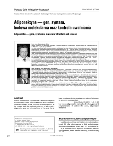 Mateusz Gola, Władysław Grzeszczak PRACA POGLĄDOWA Katedra i Klinika Chorób Wewnętrznych, Diabetologii i Nefrologii Śląskiego Uniwersytetu Medycznego Adiponektyna — gen, synteza, budowa molekularna oraz kontrola uwalniania Adiponectin — gene, synthesis, molecular structure and release Dr n. med. Mateusz Jan Gola Studia medyczne na Wydziale Lekarskim Collegium Medicum Uniwersytetu Jagiellońskiego w Krakowie ukończył w 2003 roku, uzyskując tytuł lekarza. Od 2006 roku pracuje jako młodszy asystent na Oddziale Nefrologii Katedry i Kliniki Chorób Wewnętrznych, Diabetologii i Nefrologii w Samodzielnym Publicznym Szpitalu Klinicznym Nr 1 SUM w Zabrzu. Pracując na oddziale, wykonuje badania biopsyjne nerek, badania elastyczności naczyń tętniczych oraz doskonali swoje umiejętności z zakresu ultrasonografii. Od 2008 roku pracuje również jako lekarz rodzinny w Poradniach Rejonowych. Jego zainteresowania z zakresu medycyny dotyczą głównie zagadnień związanych z zespołem metabolicznym, kłębuszkowymi zapaleniami nerek, hemodializoterapią oraz praktycznych aspektów w codziennej pracy lekarza rodzinnego. Jest współautorem prac naukowych opublikowanych między innymi w „Atherosclerosis” oraz „American Journal of Hypertension”. Obecnie prowadzi badania naukowe nad związkiem polimorfizmów genów APM1, FTO i TCF7L2 z predyspozycją do występowania nadwagi, otyłości i innych składowych zespołu metabolicznego. Do jego zainteresowań pozazawodowych należą między innymi programowanie (Object Pascal – Delphi), komputerowa obróbka materiału filmowego, fotografia przyrodnicza. Jest twórcą programu AVI ReComp przeznaczonego do rekompresji plików w formacie MPEG-4/AVI. Swoją wiedzę programistyczną wykorzystuje również w medycynie, tworząc kalkulatory nefrologiczne do obliczania dawkowania niektórych leków immunosupresyjnych, wartości GFR, Kt/V oraz PET u chorych dializowanych. Prof. dr hab. n. med. Władysław Grzeszczak Ukończył Wydział Lekarski Śląskiej Akademii Medycznej w Katowicach w 1978 roku, tam także otrzymał tytuł doktora nauk medycznych (w 1982 r.), a następnie tytuł doktora habilitowanego nauk medycznych (w 1986 r.). Jest specjalistą w dziedzinie chorób wewnętrznych, nefrologii, hipertensjologii i transplantologii klinicznej. Tytuł profesora został mu nadany przez Prezydenta Rzeczypospolitej Polskiej w 1993 roku. Od 1991 roku aż do chwili obecnej prof. Grzeszczak pełni funkcję kierownika Katedry i Kliniki Chorób Wewnętrznych, Diabetologii i Nefrologii Śląskiego Uniwersytetu Medycznego w Katowicach. W latach 1996–1999 był także Prorektorem ds. klinicznych ŚAM. Redaktor Naczelny „Diabetologii Doświadczalnej i Klinicznej”, „Diabetologii po Dyplomie” i „Annales Academiae Medicae Silesiensis”. Prezes Polskiego Towarzystwa Diabetologicznego w latach 2007–2011. Konsultant regionalny ds. diabetologii w latach 1995–1999. Członek Zespołu Ekspertów powołanych przez MZ ds. opracowania narodowego programu walki z cukrzycą. Prof. Władysław Grzeszczak jest autorem lub współautorem ponad 800 opublikowanych prac (artykułów, wyników badań, recenzji etc.) w prestiżowych czasopismach naukowych zarówno w kraju, jak i za granicą. W uznaniu dla swoich licznych prac badawczych otrzymał 20 nagród naukowych w Polsce oraz 2 międzynarodowe. Jego zainteresowania to podróże, astronomia i religioznawstwo. Abstract Human adiponectin is a protein with a molecular weight of approximately 30 kDa, built of 244 amino acids. Adiponectin gene is located on the long arm of chromosome 3. At the present study the molecular structure of adiponectin, adiponectin gene and polymorphisms of this gene, the re- Budowa molekularna adiponektyny Address for correspondence: dr n. med. Mateusz Gola Katedra i Klinika Chorób Wewnętrznych, Diabetologii i Nefrologii SUM ul. 3 Maja 13/15, 41–800 Zabrze tel.: 535 488 844; e-mail: [email protected] Diabetologia Doświadczalna i Kliniczna 2011, 11, 2: 84–92 Copyright © 2011 Via Medica, ISSN 1643–3165 84 lease of adiponectin, the structure and action of adiponectin receptors were described. Diabet Dośw Klin 2011; 11, 2: 84–92 key words: adiponectin, molecular structure, gene and polymorphisms of adiponectin gene, adiponectin receptors Ludzka adiponektyna jest białkiem o masie cząsteczkowej 30 kDa, zbudowanym z 244 aminokwasów. U myszy adiponektyna składa się z 247 aminokwasów. W jej budowie można wyróżnić: N-końcową sekwencję sygnałową, krótki odcinek zmienny, niewykazujący www.ddk.viamedica.pl Mateusz Gola, Władysław Grzeszczak, Adiponektyna — gen, synteza, budowa molekularna oraz kontrola uwalniania homologii z żadnymi innymi białkami, domenę kolagenową (zwaną też kolagenopodobną) oraz zlokalizowaną w C-końcowym fragmencie cząsteczki domenę globularną, zbliżoną pod względem budowy do domeny globularnej kolagenu typu VIII i X oraz składowej C1q dopełniacza [1, 2]. Ponadto domena globularna wykazuje na pewną homologię z trimeryczną budową czynników z rodziny TNF [3]. Podobieństwa te przekładają się na niektóre z efektów aktywności biologicznej adiponektyny. Może ona występować w postaci pełnej, a także pod postacią samej formy globularnej, choć ta druga forma jest identyfikowana w osoczu w niewielkich ilościach [4]. Sugeruje się, że izolowana postać globularna powstaje w wyniku rozkładu proteolitycznego, w którym bierze udział elastaza leukocytowa uwalniana przez aktywowane monocyty i/lub neutrofile [5]. Adiponektyna krąży w krwiobiegu głównie w postaci multimerów, a jej oligomeryczną formę warunkuje istnienie mostków dwusiarczkowych, tworzonych przy udziale cysteiny w kodonie 36 (ludzka adiponektyna) lub 39 (model mysi). Forma globularna adiponektyny występuje jedynie w postaci krótkich globularnych trimerów, podczas gdy forma o pełnej długości może przyjmować postać trimerów LMW, heksam