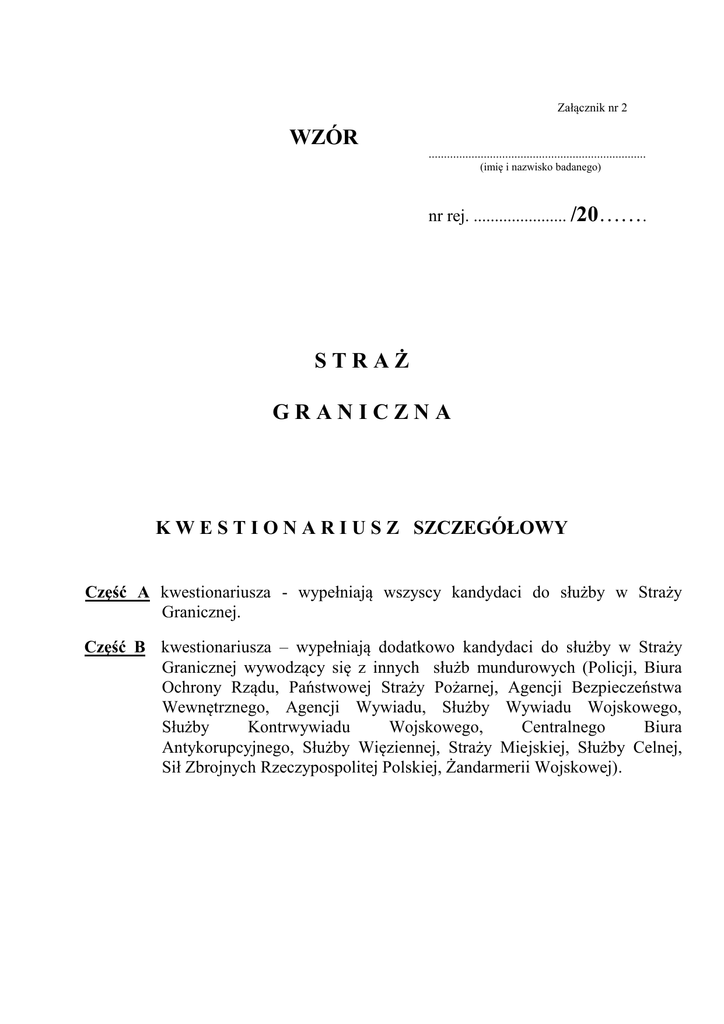 Załącznik nr 2 WZÓR ....................................................................... (imię i nazwisko badanego) nr rej. ...................... /20……. STRAŻ GRANICZNA K W E S T I O N A R I U S Z SZCZEGÓŁOWY Część A kwestionariusza - wypełniają wszyscy kandydaci do służby w Straży Granicznej. Część B kwestionariusza – wypełniają dodatkowo kandydaci do służby w Straży Granicznej wywodzący się z innych służb mundurowych (Policji, Biura Ochrony Rządu, Państwowej Straży Pożarnej, Agencji Bezpieczeństwa Wewnętrznego, Agencji Wywiadu, Służby Wywiadu Wojskowego, Służby Kontrwywiadu Wojskowego, Centralnego Biura Antykorupcyjnego, Służby Więziennej, Straży Miejskiej, Służby Celnej, Sił Zbrojnych Rzeczypospolitej Polskiej, Żandarmerii Wojskowej). INSTRUKCJA 1. Wypełniający kwestionariusz musi odpowiedzieć na wszystkie zawarte w nim pytania: (część A od nr 1 do 131), (część B od nr 1 do 44). W przypadku jakichkolwiek wątpliwości w czasie wypełniania kwestionariusza należy skonsultować to z prowadzącym badanie. Część A kwestionariusza - wypełniają wszyscy kandydaci do służby w Straży Granicznej. Część B kwestionariusza – wypełniają dodatkowo kandydaci do służby w Straży Granicznej wywodzący się z innych służb mundurowych (Policji, Biura Ochrony Rządu, Państwowej Straży Pożarnej, Agencji Bezpieczeństwa Wewnętrznego, Agencji Wywiadu, Służby Wywiadu Wojskowego, Służby Kontrwywiadu Wojskowego, Centralnego Biura Antykorupcyjnego, Służby Więziennej, Straży Miejskiej, Służby Celnej, Sił Zbrojnych Rzeczypospolitej Polskiej, Żandarmerii Wojskowej). 2. Umyślne pominięcie lub podanie nieprawdziwych danych stanowi podstawę do wydania przez eksperta negatywnej opinii z badania. 3. Przy odpowiedziach “TAK” należy stosować krótką formę opisową – (przybliżony termin, przedmiot zdarzenia, itp. określenia wyjaśniające). 4. Zobowiązuję się do zachowania w tajemnicy przebiegu badania, a w szczególności treści pytań zawartych w kwestionariuszu. ............................................... (imię i nazwisko badanego) data i podpis badanego ……………….... 2 CZĘŚĆ A wypełniają wszyscy kandydaci do służby w Straży Granicznej Odpowiedz na pytania - “ T A K ” lub “ N I E ”. Nie pozostawiaj pytań bez odpowiedzi. Zaznacz pytania wymagające wyjaśnienia. 1. Czy jest jakiś powód dla którego nie powinieneś(naś) dostać tej pracy? ................. 2. Czy kiedykolwiek przechodziłeś(aś) załamanie nerwowe, że musiałeś(aś) korzystać z porady lekarza lub zażywać jakieś leki? ................. 3. Czy znajdujesz się pod stałą opieką lekarską ze względu na jakieś schorzenie, które musisz leczyć? ................. 4. Czy kiedykolwiek miałeś(aś) odebrane prawo jazdy? ................. 5. Czy utrzymujesz prywatne kontakty z obcokrajowcami? ................. 6. Czy byłeś(aś) ukarany za popełnione wykroczenie ( mandaty drogowe, skarbowe itp.)? Jeżeli tak, to czy masz wszystko uregulowane? ................. 7. Czy posiadasz członków rodziny lub znajomych zamieszkałych na stałe za granicą? ................. 8. Czy starasz się o pracę w Straży Granicznej na zlecenie kogoś lub jakiejś organizacji? ................. 9. Czy podrobiłeś(aś) lub przerobiłeś(aś) jakiś dokument? ................. 10. Czy znasz osoby pracujące w służbach specjalnych innych państw? ................. data i podpis badanego ……………….... 3 11. Czy utrzymujesz kontakty z pracownikami placówek dyplomatycznych? ................. 12. Czy w ciągu ostatnich 24 godzin piłeś(aś) alkohol? ................. 13. Czy oszukujesz w sprawach podatkowych? ................. 14. Czy posługiwałeś(aś) się innym nazwiskiem? ................. 15. Czy miał(a) pan(i) problemy w pracy z uwagi na picie alkoholu, zażyciu narkotyków albo innych środków odurzających lub pobudzających (np. dopalaczy grzybków halucynogennych, wąchania kleju)? ................. 16. Czy kiedykolwiek leczyłeś(aś) się u lekarza specjalisty (kardiologa, neurologa, psychiatry)? ................. 17. Czy kiedykolwiek dokonywałeś(aś) kradzieży? ................. 18. Czy kiedykolwiek ubiegałeś(aś) się o przyjęcie do służby w Straży Granicznej? ................. 19. Czy twoi rodzice i dziadkowie są narodowości i obywatelstwa polskiego? ................. 20. Czy należysz do organizacji społecznych? ................. 21. Czy kiedykolwiek prowadziłeś(aś) pojazd mechaniczny po spożyciu alkoholu, zażyciu narkotyków, albo innych środków odurzających lub pobudzających (np. dopalaczy grzybków halucynogennych, wąchania kleju)? ................. data i podpis badanego ……………….... 4 22. Czy utrzymujesz kontakty z osobami, dokonującymi przestępstw lub osobami, które mają lub miały prowadzone postępowanie karne? ................. 23. Czy posiadany dyplom ukończenia uczelni wyższej / świadectwa ukończenia szkoły średniej uzyskałeś(aś) w sposób legalny? ................. 24. Czy kiedykolwiek zażywałeś(aś) środki odurzające lub pobudzające, takie jak opiaty/opiody, środki psychostymulujące pochodne konopi indyjskich, środki halucynogenne pochodzenia roślinnego (bieluń/datura, grzybki) lub syntetyczne, leki nasenne i uspokajające, inhalanty (butapren), sterydy i substancje zwane potocznie dopalaczami? ................. 25. Czy jesteś zobowiązany(a) do świadczeń z tytułu odszkodowań, długów, świadczeń alimentacyjnych, itp.? ................. 26. Czy w ciągu ostatniego roku zażywałeś(aś) narkotyki, środki odurzające lub pobudzające, takie jak opiaty/opiody, środki psychostymulujące pochodne konopi indyjskich, środki halucynogenne pochodzenia roślinnego (bieluń/datura, grzybki) lub syntetyczne, leki nasenne i uspokajające, inhalanty (butapren), sterydy i substancje zwane potocznie dopalaczami? ................. 2