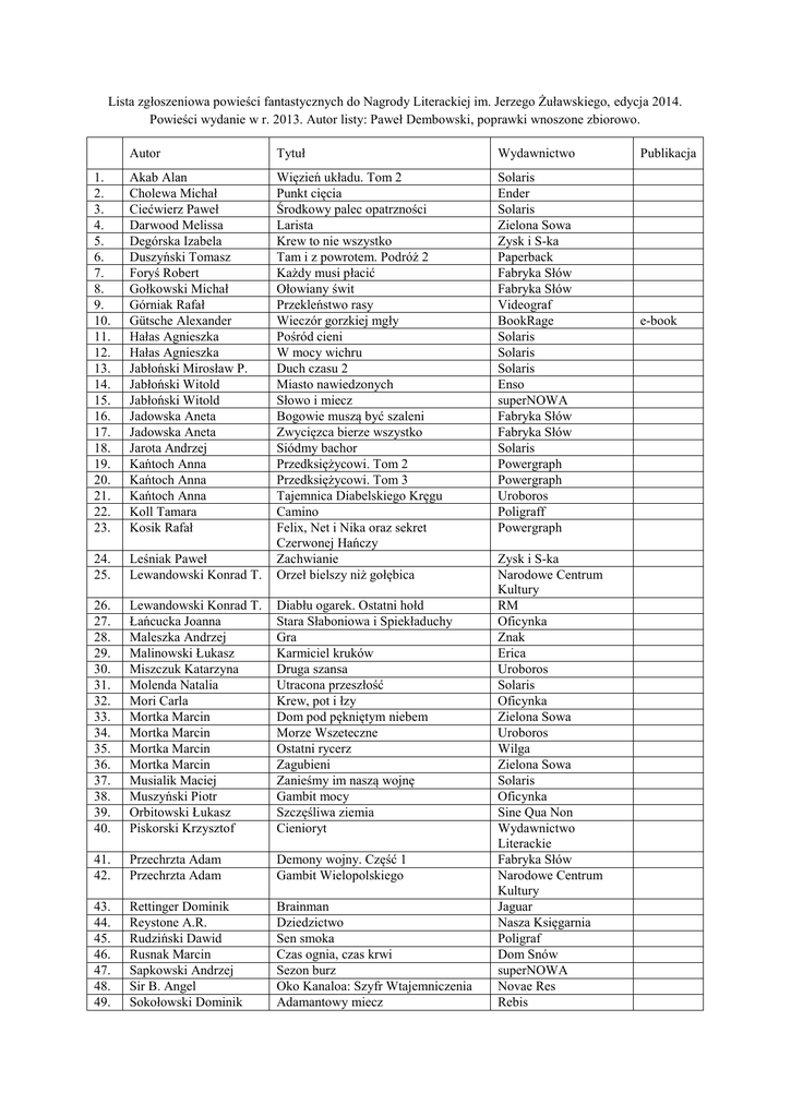 Lista zgłoszeniowa powieści fantastycznych do Nagrody Literackiej im. Jerzego Żuławskiego, edycja 2014. Powieści wydanie w r. 2013. Autor listy: Paweł Dembowski, poprawki wnoszone zbiorowo. Autor Tytuł Wydawnictwo 1. 2. 3. 4. 5. 6. 7. 8. 9. 10. 11. 12. 13. 14. 15. 16. 17. 18. 19. 20. 21. 22. 23. Akab Alan Cholewa Michał Ciećwierz Paweł Darwood Melissa Degórska Izabela Duszyński Tomasz Foryś Robert Gołkowski Michał Górniak Rafał Gütsche Alexander Hałas Agnieszka Hałas Agnieszka Jabłoński Mirosław P. Jabłoński Witold Jabłoński Witold Jadowska Aneta Jadowska Aneta Jarota Andrzej Kańtoch Anna Kańtoch Anna Kańtoch Anna Koll Tamara Kosik Rafał Solaris Ender Solaris Zielona Sowa Zysk i S-ka Paperback Fabryka Słów Fabryka Słów Videograf BookRage Solaris Solaris Solaris Enso superNOWA Fabryka Słów Fabryka Słów Solaris Powergraph Powergraph Uroboros Poligraff Powergraph 24. 25. Leśniak Paweł Lewandowski Konrad T. Więzień układu. Tom 2 Punkt cięcia Środkowy palec opatrzności Larista Krew to nie wszystko Tam i z powrotem. Podróż 2 Każdy musi płacić Ołowiany świt Przekleństwo rasy Wieczór gorzkiej mgły Pośród cieni W mocy wichru Duch czasu 2 Miasto nawiedzonych Słowo i miecz Bogowie muszą być szaleni Zwycięzca bierze wszystko Siódmy bachor Przedksiężycowi. Tom 2 Przedksiężycowi. Tom 3 Tajemnica Diabelskiego Kręgu Camino Felix, Net i Nika oraz sekret Czerwonej Hańczy Zachwianie Orzeł bielszy niż gołębica 26. 27. 28. 29. 30. 31. 32. 33. 34. 35. 36. 37. 38. 39. 40. Lewandowski Konrad T. Łańcucka Joanna Maleszka Andrzej Malinowski Łukasz Miszczuk Katarzyna Molenda Natalia Mori Carla Mortka Marcin Mortka Marcin Mortka Marcin Mortka Marcin Musialik Maciej Muszyński Piotr Orbitowski Łukasz Piskorski Krzysztof Diabłu ogarek. Ostatni hołd Stara Słaboniowa i Spiekładuchy Gra Karmiciel kruków Druga szansa Utracona przeszłość Krew, pot i łzy Dom pod pękniętym niebem Morze Wszeteczne Ostatni rycerz Zagubieni Zanieśmy im naszą wojnę Gambit mocy Szczęśliwa ziemia Cienioryt 41. 42. Przechrzta Adam Przechrzta Adam Demony wojny. Część 1 Gambit Wielopolskiego 43. 44. 45. 46. 47. 48. 49. Rettinger Dominik Reystone A.R. Rudziński Dawid Rusnak Marcin Sapkowski Andrzej Sir B. Angel Sokołowski Dominik Brainman Dziedzictwo Sen smoka Czas ognia, czas krwi Sezon burz Oko Kanaloa: Szyfr Wtajemniczenia Adamantowy miecz Zysk i S-ka Narodowe Centrum Kultury RM Oficynka Znak Erica Uroboros Solaris Oficynka Zielona Sowa Uroboros Wilga Zielona Sowa Solaris Oficynka Sine Qua Non Wydawnictwo Literackie Fabryka Słów Narodowe Centrum Kultury Jaguar Nasza Księgarnia Poligraf Dom Snów superNOWA Novae Res Rebis Publikacja e-book 50. 51. 52. 53. 54. 55. 56. 57. 58. Stelmarczyk Krzysztof Szelenbaum Katarzyna Szelenbaum Katarzyna Szelenbaum Katarzyna Szelenbaum Katarzyna Wojdowicz Agnieszka Wolski Marcin Zbierzchowski Cezary Ziemiański Andrzej Crom i mali barbarzyńcy Wielki Północny Ocean. Bóg Wielki Północny Ocean. Kosmos Wielki Północny Ocean. Los Wielki Północny Ocean. Morze Korona Mandalich Prezydent von Dyzma Holocaust F Pomnik cesarzowej Achai. Tom 2 Zielona Sowa G+J G+J G+J G+J Nasza Księgarnia Zysk i S-ka Powergraph Fabryka Słów