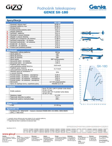 Podnośnik teleskopowy GENIE SX-180 Specyfikacja SX-180 A B C D D E E F F G Wysokość robocza max* Wysokość platformy max Wysięg boczny Prześwit poniżej poziomu ziemi Długość platformy Szerokość platformy Wysokość w pozycji złożonej Długość w pozycji złożonej Długość przy transporcie (Jib złożony) Szerokość podnośnika – oś złożona Szerokość podnośnika – oś rozłożona Środek kół - oś złożona Środek kół - oś rozłożona Prześwit pod podstawą podestu 56.86 m 54.86 m 24.38 m 0.61 m 2.44 m 0.91 m 3.05 m 14.33 m 12.98 m 2.49 m 5.03 m 5.03 m 4.72 m 0.38 m Wydajność Maksymalny udźwig platformy Obrót platformy Obrót Jib pionowo Obrót Jib poziomo Obrót kopuły Zarzucenie tyłem - oś złożona Zarzucenie tyłem - oś rozłożona Prędkość jazdy maszyny, ramię podniesione poniżej 38.10 m Prędkość jazdy maszyny, ramię podniesione powyżej 38.10 m Zdolność jazdy po wzniesieniu ** w pozycji złożonej Promień skrętu - oś złożona - wewnętrzny Promień skrętu - oś złożona - zewnętrzny Promień skrętu - oś rozłożona - wewnętrzny Promień skrętu - oś rozłożona - zewnętrzny Sterowanie 340 kg 160° 135° 180° 360° kontynuowany 1.14 m 1.06 m 0.65 km/h 0.17 km/h 35% 6.28 m 8.56 m 3.02 m 7.34 m 12 V DC proporcjonalne 445/65D 22.5 18 Opony do ciężkiego terenu, wypełnione pianą Zasilanie Źródło zasilania Zapasowy napęd Pojemność zbiornika na paliwo Pojemność systemu hydraulicznego Deutz TD 2011 L04i 4-cylinder turbo diesel, 55 kW (74 hp) Perkins 804-33T 4-cylinder turbo diesel, 55 kW (74 hp) 12 V DC 151 L 208 L Waga **** 4 WD 24 494 kg Zgodność CE Dyrektywa EU: 2006/42/EC - maszyny (standard EN280:2001+A2:2009); 2004/108/EC (EMC); 2 000/14/EC * wysokość robocza obliczana jest przez dodanie 2m do wysokości platformy **praca dotyczy pracy na wzniesieniu. Sprawdź instrukcję obsługi. *** waga może się różnić w zależności od wybranych opcji Specyfikacja 16.07.13 Podnośnik teleskopowy GENIE SX-180 CHARAKTERYSTYKA Opcje dodatkowe Standardowe wyposażenie Wymiary SX-180 - 56.86 m – wysokość robocza 24.38 m – wysięg boczny 3.05 m - obrotowy JiB 340 kg udźwigu platformy Platforma - 2.44 m - platforma stalowa platforma z systemem samopoziomowania 160° hydraulicznie obracana platforma Wyposażenie - - praca przy pełnej wysokości dwa światła robocze umiejscowione na platformie proporcjonalna jazda i podnoszenie przy pomocy joysticka proporcjonalna jazda i podnoszenie (joystick z czujnikiem Hall) chłodnica oleju hydraulicznego pozytywny system kontroli trakcji napęd linia 230 V doprowadzona do platformy alarmy dźwiękowe pulpit dolny alarm przechylenia alarm opuszczania podnośnika klakson licznik roboczogodzin kontynuowany obrót kopuły o 360° dwa silniki prędkości koła system kierowania, pozwalający ograniczyć wysokość podnoszenia do 24.38 m wyświetlacz stanu silnika rozsuwalne osie certyfikowany system kontroli udźwigu maszyny Zasilanie - - 12 V DC jako napęd zapasowy 4x4 generator 7.5 kW 415V/240V/50Hz (Europe) wszystkie silniki spełniają normę emisji zabezpieczenie silnika przed ponownym uruchomianiem automatyczne wyłączenie silnika w przypadku awarii nagrzewanie powietrza dolotowego Deutz Koła - koła do ciężkiego terenu wypełnione pianą 1 wymagana opcja platformy – platforma z wejściem z trzech stron 2 tylko montowane fabrycznie - 2.44 m - platforma stalowa, otwierana z trzech stron Deutz turbo diesel 55 kW (74 hp) Perkins turbo diesel 55 kW (74 hp) - dodatkowa poręcz na platformie bramka uchylna na platformie z siatką do połowy wysokości1 - zamykana osłona pulpitu sterowniczego filtr powietrza2 biodegradowalny olej hydrauliczny2 pakiet oświetleniowy: 2 światła do jazdy umiejscowione na podwoziu, 2 światła robocze umiejscowione na platformie półka na narzędzia zestaw do pracy w nieprzyjaznym środowisku2 pulpit sterowniczy na platformie wiatromierz pakiet oświetleniowy do pracy: 2 światła do jazdy umiejscowione na podwoziu, 2 światła robocze umiejscowione na platformie - - pakiet AC generator (120V/50Hz z dwoma gniazdami na platformie zabezpieczenie linii 230V doprowadzonej do platformy