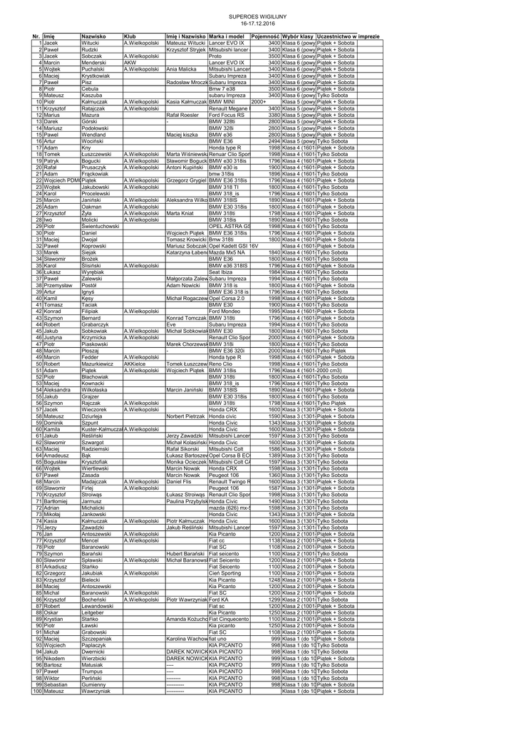 SUPEROES WIGILIJNY 16-17.12.2016 Nr. 1 2 3 4 5 6 7 8 9 10 11 12 13 14 15 16 17 18 19 20 21 22 23 24 25 26 27 28 29 30 31 32 33 34 35 36 37 38 39 40 41 42 43 44 45 46 47 48 49 50 51 52 53 54 55 56 57 58 59 60 61 62 63 64 65 66 67 68 69 70 71 72 73 74 75 76 77 78 79 80 81 82 83 84 85 86 87 88 89 90 91 92 93 94 95 96 97 98 99 100 Imię Nazwisko Klub Jacek Witucki A.Wielkopolski Paweł Rudzki Jacek Sobczak A.Wielkopolski Marcin Menderski AKW Wojtek Puchalski A.Wielkopolski Maciej Krystkowiak Paweł Pisz Piotr Cebula Mateusz Kaszuba Piotr Kałmuczak A.Wielkopolski Krzysztof Ratajczak A.Wielkopolski Marius Mazura Darek Górski Mariusz Podołowski Pawel Wendland Artur Wociński Adam Kny Tomek Łuszczewski A.Wielkopolski Patryk Bogucki A.Wielkopolski Rafał Prusaczyk A.Wielkopolski Adam Frąckowiak Wojciech PDMGPiątek Rally Team A.Wielkopolski Wojtek Jakubowski A.Wielkopolski Karol Procelewski Marcin Janiński A.Wielkopolski Adam Oakman A.Wielkopolski Krzysztof Żyła A.Wielkopolski Iwo Molicki A.Wielkopolski Piotr Świentuchowski Piotr Daniel Maciej Dwojal Paweł Koprowski Marek Siejak Sławomir Brożek Karol Ślisiński A.Wielkopolski Łukasz Wyrębiak Paweł Zalewski Przemysław Postół Artur Ignyś Kamil Kęsy Tomasz Taciak Konrad Filipiak A.Wielkopolski Szymon Bernard Robert Grabarczyk Jakub Sobkowiak A.Wielkopolski Justyna Krzymicka A.Wielkopolski Piotr Piaskowski Marcin Płoszaj Marcin Fedder A.Wielkopolski Robert Mazurkiewicz AKKielce Adam Piątek A.Wielkopolski Piotr Błachowiak Maciej Kownacki Aleksandra Wilkołaska Jakub Grajzer Szymon Rajczak A.Wielkopolski Jacek Wieczorek A.Wielkopolski Mateusz Dziurleja Dominik Szpunt Kamila Kuster-KałmuczakA.Wielkopolski Jakub Reśliński Sławomir Szwargot Maciej Radziemski Amadeusz Bąk Bogusław Krysztofiak Wojtek Wiertlewski Paweł Zasada Marcin Madajczak A.Wielkopolski Sławomir Firlej A.Wielkopolski Krzysztof Stroiwąs Bartłomiej Jarmusz Adrian Michalicki Mikołaj Jankowski Kasia Kałmuczak A.Wielkopolski Jerzy Zawadzki Jan Antoszewski A.Wielkopolski Krzysztof Mencel A.Wielkopolski Piotr Baranowski Szymon Barański Sławomir Spławski A.Wielkopolski Arkadiusz Stańko Grzegorz Jakubiak A.Wielkopolski Krzysztof Bielecki Maciej Antoszewski Michal Baranowski A.Wielkopolski Krzysztof Bocheński A.Wielkopolski Robert Lewandowski Oskar Leitgeber Krystian Stańko Piotr Ławski Michał Grabowski Maciej Szczepaniak Wojciech Paplaczyk Jakub Dwernicki Nikodem Wierzbicki Bartosz Matusiak Paweł Trumpus Wiktor Perliński Sebastian Gumienny Mateusz Wawrzyniak Imię i Nazwisko Pilota Marka i model Pojemność przeliczeniowa Wybór klasy Uczestnictwo w imprezie Mateusz Witucki Lancer EVO IX 3400 Klasa 6 (powyżej Piątek 2000+ cm3 Sobota - AWD) Krzysztof Stryjek Mitsubishi lancer evo 3400 Klasa 6 (powyżej Piątek 2000+ cm3 Sobota - AWD) Proto 3500 Klasa 6 (powyżej Piątek 2000+ cm3 Sobota - AWD) Lancer EVO IX 3400 Klasa 6 (powyżej Piątek 2000+ cm3 Sobota - AWD) Ania Malicka Mitsubishi Lancer EVO IV3400 Klasa 6 (powyżej Piątek 2000+ cm3 Sobota - AWD) Subaru Impreza 3400 Klasa 6 (powyżej Piątek 2000+ cm3 Sobota - AWD) Radosław Mroczkowski Subaru Impreza 3400 Klasa 6 (powyżej Piątek 2000+ cm3 Sobota - AWD) Bmw 7 e38 3500 Klasa 6 (powyżej Piątek 2000+ cm3 Sobota - AWD) subaru Impreza 3400 Klasa 6 (powyżej Tylko 2000 Sobota cm3 - AWD) Kasia Kałmuczak BMW MINI 2000+ Klasa 5 (powyżej Piątek 2000+ cm3 Sobota - FWD/RWD Renault Megane RS 3400 Klasa 5 (powyżej Piątek 2000+ cm3 Sobota - FWD/RWD Rafał Roesler Ford Focus RS 3380 Klasa 5 (powyżej Piątek 2000+ cm3 Sobota - FWD/RWD BMW 328ti 2800 Klasa 5 (powyżej Piątek 2000+ cm3 Sobota - FWD/RWD BMW 328i 2800 Klasa 5 (powyżej Piątek 2000+ cm3 Sobota - FWD/RWD Maciej kiszka BMW e36 2800 Klasa 5 (powyżej Piątek 2000+ cm3 Sobota - FWD/RWD BMW E36 2494 Klasa 5 (powyżej Tylko 2000 Sobota cm3 - FWD/RWD Honda type R 1998 Klasa 4 (1601-2000 Piątekcm3) + Sobota Marta WiśniewskaRenuar Clio Sport 1998 Klasa 4 (1601-2000 Tylko cm3) Sobota Sławomir BoguckiBMW e30 318is 1796 Klasa 4 (1601-2000 Piątekcm3) + Sobota Antoni Kupiński BMW e30 is 1900 Klasa 4 (1601-2000 Piątekcm3) + Sobota bmw 318is 1896 Klasa 4 (1601-2000 Tylko cm3) Sobota Grzegorz Grygiel BMW E36 318is 1796 Klasa 4 (1601-2000 Piątekcm3) + Sobota BMW 318 TI 1800 Klasa 4 (1601-2000 Tylko cm3) Sobota BMW 318_is 1796 Klasa 4 (1601-2000 Tylko cm3) Sobota Aleksandra Wilkołaska BMW 318IS 1890 Klasa 4 (1601-2000 Piątekcm3) + Sobota BMW E30 318is 1800 Klasa 4 (1601-2000 Piątekcm3) + Sobota Marta Kniat BMW 318ti 1798 Klasa 4 (1601-2000 Piątekcm3) + Sobota BMW 318is 1890 Klasa 4 (1601-2000 Tylko cm3) Sobota OPEL ASTRA GSI 1998 Klasa 4 (1601-2000 Tylko cm3) Sobota Wojciech Piątek BMW E36 318is 1796 Klasa 4 (1601-2000 Piątekcm3) + Sobota Tomasz Krowicki Bmw 318ti 1800 Klasa 4 (1601-2000 Piątekcm3) + Sobota Mariusz Sobczak Opel Kadett GSI 16V Klasa 4 (1601-2000 Piątekcm3) + Sobota Katarzyna Łabenda Mazda Mx5 NA 1840 Klasa 4 (1601-2000 Tylko cm3) Sobota BMW E36 1800 Klasa 4 (1601-2000 Tylko cm3) Sobota BMW e36 318IS 1796 Klasa 4 (1601-2000 Piątekcm3) + Sobota Seat Ibiza 1984 Klasa 4 (1601-2000 Tylko cm3) Sobota Małgorzata Zalewska Subaru Impreza 1994 Klasa 4 (1601-2000 Tylko cm3) Sobota Adam Nowicki BMW 318 is 1800 Klasa 4 (1601-2000 Piątekcm3) + Sobota BMW E36 318 is 1796 Klasa 4 (1601-2000 Tylko cm3) Sobota Michał Rogaczewski Opel Corsa 2.0 1998 Klasa 4 (1601-2000 Piątekcm3) + Sobota BMW E30 1900 Klasa 4 (1601-2000 Tylko cm3) Sobota Ford Mondeo 1995 Klasa 4 (1601-2000 Piątekcm3) + Sobota Konrad Tomczak BMW 318ti 1796 Klasa 4 (1601-2000 Piątekcm3) + Sobota Eve Subaru Impreza 1994 Klasa 4 (1601-2000 Tylko cm3) Sobota Michał SobkowiakBMW E30 1800 Klasa 4 (1601-2000 Tylko cm3) Sobota Renault Clio Sport 2000 Klasa 4 (1601-2000 Piątekcm3) + Sobota Marek ChorzewskiBMW 318i 1800 Klasa 4 (1601-2000 Tylko cm3) Sobota BMW E36 320i 2000 Klasa 4 (1601-2000 Tylko cm3) Piątek Honda type R 1998 Klasa 4 (1601-2000 Piątekcm3) + Sobota Tomek Łuszc