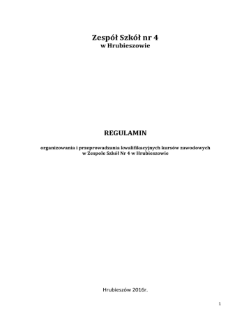 Zespół Szkół nr 4 w Hrubieszowie REGULAMIN organizowania i przeprowadzania kwalifikacyjnych kursów zawodowych w Zespole Szkół Nr 4 w Hrubieszowie Hrubieszów 2016r. 1 PODSTAWY PRAWNE KSZTAŁCENIA ZAWODOWEGO Zagadnienia dotyczące kształcenia w formach pozaszkolnych, w tym na kwalifikacyjnych kursach zawodowych zawarte są w następujących aktach prawnych: Ustawa z dnia 7 września 1991 r. o systemie oświaty (Dz. U. z 2004 r. Nr 256, poz. 2572, z późn. zm.; w szczególności ze zmianą wprowadzoną ustawą 19 sierpnia 2011 r. o zmianie ustawy o systemie oświaty oraz niektórych innych ustaw – Dz. U. Nr 205, poz. 1206); Rozporządzenie Ministra Edukacji Narodowej z dnia 23 grudnia 2011 r. w sprawie klasyfikacji zawodów szkolnictwa zawodowego (Dz. U. z 2012 r. poz. 7); Rozporządzenie Ministra Edukacji Narodowej z dnia 7 lutego 2012 r. w sprawie podstawy programowej kształcenia w zawodach (Dz. U. poz. 184); Rozporządzenie Ministra Edukacji Narodowej z dnia 11 stycznia 2012 r. w sprawie kształcenia ustawicznego w formach pozaszkolnych (Dz. U. poz. 186); Rozporządzenie Ministra Edukacji Narodowej z dnia z dnia 24 lutego 2012 r. zmieniającego rozporządzenie w sprawie warunków i sposobu oceniania, klasyfikowania i promowania uczniów i słuchaczy oraz przeprowadzania sprawdzianów i egzaminów w szkołach publicznych (Dz. U. poz. 262); Rozporządzenie Ministra Edukacji Narodowej z dnia 16 lipca 2012 r. w sprawie przypadków, w jakich do publicznej lub niepublicznej szkoły dla dorosłych można przyjąć osobę, która ukończyła 16 albo 15 lat oraz przypadków, w jakich osoba, która ukończyła gimnazjum, może spełniać obowiązek nauki przez uczęszczanie na kwalifikacyjny kurs zawodowy (Dz. U. poz. 857); Rozporządzenie Ministra Edukacji Narodowej z dnia 16 października 2012 r. zmieniającego rozporządzenie w sprawie kształcenia ustawicznego w formach pozaszkolnych (Dz. U. poz. 1152); Rozporządzenie Ministra Zdrowia z dnia 26 sierpnia 2014r. w sprawie badań lekarskich kandydatów do szkół ponadgimnazjalnych lub wyższych i na kwalifikacyjne kursy zawodowe, uczniów tych szkół, studentów, słuchaczy kwalifikacyjnych kursów zawodowych oraz uczestników studiów doktoranckich. 2 §1 W ZS Nr 4 w Hrubieszowie kwalifikacyjne kursy zawodowe (KKZ) są prowadzone według programu nauczania uwzględniającego podstawę programową kształcenia w zawodach: 1. Technik agrobiznesu 331402 2. Technik rolnik 314207 3. Technik obsługi turystycznej 422103 4. Technik turystyki wiejskiej 515203 5. Technik ogrodnik 314205 6. Rolnik 613003 7. Ogrodnik 611303 8. Florysta 343203 §2 1. KKZ jest prowadzony w zakresie jednej kwalifikacji. 2. KKZ dla danego zawodu na poziomie technikum jest realizowany od pierwszej kwalifikacji. §3 Na KKZ stosuje się przedmiotowy typ programu nauczania. §4 1. KKZ w ZS Nr 4 w Hrubieszowie jest prowadzony w systemie zaocznym. 2. Kształcenie w formie zaocznej odbywa się co najmniej raz na dwa tygodnie przez dwa dni (piątek, sobota). 3. Jednostka dydaktyczna trwa 45 minut. 4. Zajęcia teoretyczne jak i praktyczne mogą być blokowane. 5. Zajęcia praktyczne mogą odbywać się na terenie bazy dydaktycznej ZS nr 4 w Hrubieszowie jak i na terenie gospodarstw/przedsiębiorstw strefy agrobiznesu na podstawie zawartych porozumień między stronami. 3 §5 Minimalna liczba godzin kształcenia na KKZ prowadzonego w formie zaocznej nie może być mniejsza niż 65% minimalnej liczby godzin kształcenia zawodowego określonej w podstawie programowej dla danej kwalifikacji. §6 KKZ są prowadzone dla słuchaczy nieodpłatnie. §7 ZS Nr 4 w Hrubieszowie może organizować KKZ na zamówienie: a) Pracodawcy, b) Powiatowego Urzędu Pracy. §8 1. Liczba słuchaczy uczestniczących w kwalifikacyjnym kursie zawodowym wynosi co najmniej 20 i nie przekracza 50 osób. 2. Za zgodą organu prowadzącego liczba słuchaczy może być mniejsza niż 20. §9 O przyjęcie na KKZ mogą ubiegać się osoby pełnoletnie, które ukończyły co najmniej gimnazjum lub ośmioletnią szkołę podstawową. § 10 1. Wymagane dokumenty do przyjęcia na KKZ: a) podanie o przyjęcie na KKZ (formularz szkolny), b) świadectwo ukończenia szkoły (kserokopia potwierdzona za zgodność z oryginałem), c) zaświadczenie lekarskie wydane przez lekarza medycyny pracy o braku przeciwwskazań zdrowotnych do wykonywania i pobierania praktycznej nauki zawodu (dotyczy kwalifikacji R.3 Prowadzenie produkcji rolniczej), 4 § 11 1. Rekrutacja słuchaczy jest prowadzona przez Zespół Szkół nr 4 w Hrubieszowie, w ciągu całego roku szkolnego (kończy się przed pierwszymi zajęciami – zgodnie z opracowanym harmonogramem zajęć). 2. W przypadku większej liczby kandydatów niż liczba wolnych miejsc pierwszeństwo mają kandydaci, którzy nie posiadają żadnych kwalifikacji oraz kolejność zgłoszeń. § 12 Organizator zastrzega sobie prawo do odwołania kursu przy niewystarczającej liczbie słuchaczy. § 13 1. O terminie rozpoczęcia i zakończenia KKZ decyduje Dyrektor ZS Nr 4 w Hrubieszowie (może się rozpoczynać lub kończyć nawet w trakcie trwania semestru). 2. Kurs może być kontynuowany w czasie ferii szkolnych. 3. Powołuje się opiekuna kursu spośród nauczycieli uczących. § 14 ZS Nr 4 w Hrubieszowie prowadząc KKZ jest obowiązany poinformować okręgową komisję egzaminacyjną o rozpoczęciu kształcenia w terminie 14 dni od daty jego rozpoczęcia. Informacja ta powinna zawierać: § 15 a) oznaczenie podmiotu prowadzącego KKZ, b) nazwę i symbol cyfrowy zawodu oraz nazwę i oznaczenie kwalifikacji, zgodnie z podstawą programową kształcenia w zawodach, c) termin rozpoczęcia i zakończenia KKZ, d) wykaz słuchaczy KKZ ( zawierający imię i nazwisko, datę i miejsce urodzenia oraz numer PESEL słuchacza, a w przypadku słuchacza, który nie posiada numeru PESEL – numer dokumentu potwierdzającego jego tożsamość). 5 § 16 Osoba podejmująca kształcenie na KKZ posiada