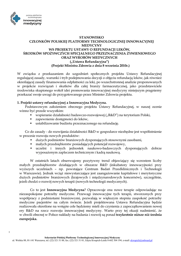 STANOWISKO CZŁONKÓW POLSKIEJ PLATFORMY TECHNOLOGICZNEJ INNOWACYJNEJ MEDYCYNY WS PROJEKTU USTAWY O REFUNDACJI LEKÓW, ŚRODKÓW SPOśYWCZYCH SPECJALNEGO PRZEZNACZENIA śYWIENIOWEGO ORAZ WYROBÓW MEDYCZNYCH („Ustawa Refundacyjna”) (Projekt Ministra Zdrowia z dnia 8 września 2010r.) W związku z przekazaniem do uzgodnień społecznych projektu Ustawy Refundacyjnej regulującej zasady, warunki i tryb podejmowania decyzji o objęciu refundacją leków, jak równieŜ określającej zasady finansowania odpłatności za leki, po wszechstronnej analizie proponowanych w projekcie rozwiązań i skutków dla całej branŜy farmaceutycznej, jako przedstawiciele środowiska skupionego wokół idei promowania innowacyjnej medycyny niniejszym pragniemy przekazać swoje uwagi do przygotowanego przez Minister Zdrowia projektu. 1. Projekt ustawy refundacyjnej a Innowacyjna Medycyna. Podstawowym załoŜeniem obecnego projektu Ustawy Refundacyjnej, w naszej ocenie winno być przede wszystkim: wspieranie działalności badawczo-rozwojowej („R&D”) na terytorium Polski, zapewnienie dostępności do leków, ustabilizowanie budŜetu przeznaczonego na refundację. Co do zasady - do rozwijania działalności R&D w gospodarce niezbędne jest współistnienie w procesie rozwoju nowych produktów: duŜych podmiotów branŜowych dysponujących stosownymi zasobami, małych przedsiębiorstw posiadających potencjał rozwojowy, uczelni i innych jednostek naukowo-badawczych dysponujących dobrze wyposaŜonym zapleczem technicznym i kadrą naukową. W ostatnich latach obserwujemy pozytywny trend objawiający się wzrostem liczby małych przedsiębiorstw działających w obszarze R&D (inkubatory innowacyjności przy wyŜszych uczelniach – np. powstające Centrum Badań Przedklinicznych i Technologii w Warszawie). Jednak wciąŜ niewystarczające jest zaangaŜowanie kapitałowe i merytoryczne duŜych podmiotów branŜowych (krajowych i międzynarodowych koncernów), szczególnie, jeŜeli chodzi o rozwój nowych terapii (nowych technologii medycznych). Co to jest Innowacyjna Medycyna? Opracowuje ona nowe terapie odpowiadając na niezaspokojone potrzeby medyczne. Przewagi innowacyjne tych terapii, stworzonych przy współpracy z podmiotami branŜowymi, pozwalają w większym stopniu zaspokoić potrzeby medyczne pacjentów na całym świecie. JeŜeli projektowana Ustawa Refundacyjna będzie realizowała określone na wstępie cele będziemy mieli do czynienia z zapoczątkowaniem nowej ery R&D na rzecz rozwoju innowacyjnej medycyny. Warto przy tej okazji nadmienić, Ŝe w chwili obecnej w Polsce nakłady na badania i rozwój są ponad trzykrotnie niŜsze niŜ średnia europejska. 1 Sekretariat Polskiej Platformy Technologicznej Innowacyjnej Medycyny ul. Wolska 88, 01-141 Warszawa, tel. (22) 321 51 00, fax. (22) 321 51 01, Edyta Kwapich-Lenik 0-602 304 194; e-mail: [email protected] Przygotowanie nowych systemowych rozwiązań refundacyjnych powinno sprzyjać innowacyjnemu podejściu do opracowania rozwiązań prawnych, które będą skutkowały nie tylko rozwojem Innowacyjnej Medycyny, ale równieŜ miały stymulujący wpływ na rozwój polskiej myśli wynalazczej. W przypadku przyjęcia projektu Ustawy Refundacyjnej w obecnym kształcie, Polska moŜe stracić unikalną okazję do szybkiego rozwoju gospodarki opartej na wiedzy i nowoczesnych technologiach, a wręcz doprowadzić do regresu w zakresie postępu naukowotechnologicznego. Poprzez efektywne tworzenie struktur naukowo-przemysłowych zwiększa się innowacyjność polskiej gospodarki, a gospodarka oparta na wiedzy i rozwoju kapitału intelektualnego – to jedno z wyzwań wskazanych w opracowaniu „Raport Polska 2030” przygotowanego pod redakcją Pana Ministra Michała Boniego. Realizacja wskazanych wyzwań prowadzić powinna do zrównowaŜonego rozwoju medycyny w Polsce poprzez synergię systemów innowacji i edukacji. Jednak biorąc pod uwagę przepisy projektowanej ustawy refundacyjnej wydaje się, Ŝe nie znaleziono skutecznego mechanizmu zachęcającego duŜe firmy (krajowe i zagraniczne) do rozwijania działalności naukowo-badawczej na terenie Polski. Oznacza to, Ŝe wskazany w preambule Dyrektywy Przejrzystości cel: „…środki te mają równieŜ na celu wspieranie efektywności wytwarzania produktów leczniczych oraz popierania badań i rozwoju nowych produktów leczniczych, od których zaleŜy utrzymanie wysokiego poziomu zdrowia publicznego we Wspólnocie….”. nie jest realizowany. 2. Wsparcie dla rozwoju R&D w medycynie - „Certyfikat Innowacyjności” Toczące się prace nad Ustawą Refundacyjną to dobry moment, by przyjąć rozwiązania systemowe gwarantujące rozwój Innowacyjnej Medycyny a nie tylko wprowadzić prosty mechanizm kontroli kosztów. W tym zakresie proponujemy rozwaŜyć rozwiązanie w postaci ustanowienia „Certyfikatu Innowacyjności”. Proponowane rozwiązanie umoŜliwiłoby wykorzystanie potencjału innowacyjności, jakim dysponuje branŜa medyczna, m.in. przedsiębiorstwa farmaceutyczne (z kapitałem zarówno polskim jak i zagranicznym) działające na terenie Polski. Proponowane, nowatorskie rozwiązanie w postaci ustanowienia „Certyfikatów Innowacyjności” spowoduje większe zaangaŜowanie duŜych podmiotów na rzecz R&D. Z całą pewnością zyskają na tym równieŜ małe przedsiębiorstwa, które wraz ze wsparciem finansowym opartym na „Certyfikatach Innowacyjności” uzyskają takŜe dostęp do międzynarodowego know-how, oraz moŜliwość współpracy z międzynarodowymi i krajowymi firmami branŜowymi. System ten moŜe spowodować odwrócenie kierunku z importu do eksportu wypracowanych nowoczesnych technologii medycznych. W długotrwałej perspektywie przyczyni się to do wzrostu konkurencyjności i obecności polskich firm na międzynarodowych rynkach farmaceutycznych. ZaangaŜowanie duŜych podmiotów spowoduje równieŜ rozwój zaplecza technicznego i rozwój kompetencji zawodowej w procesie 
