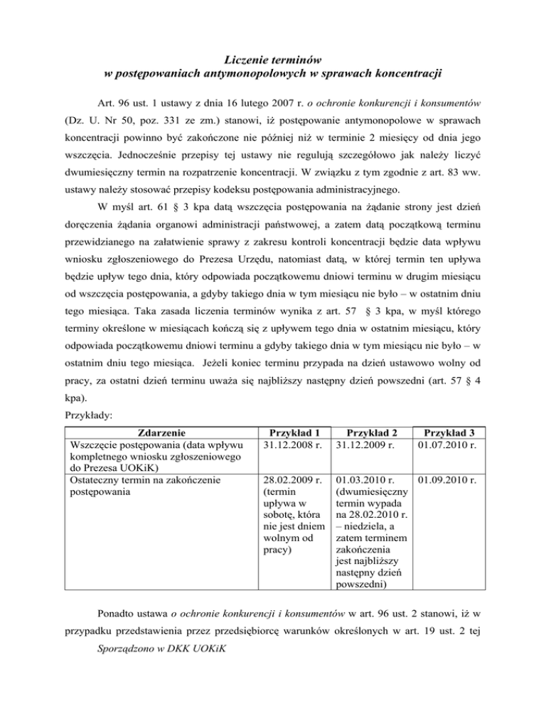 Liczenie terminów w postępowaniach antymonopolowych w sprawach koncentracji Art. 96 ust. 1 ustawy z dnia 16 lutego 2007 r. o ochronie konkurencji i konsumentów (Dz. U. Nr 50, poz. 331 ze zm.) stanowi, iż postępowanie antymonopolowe w sprawach koncentracji powinno być zakończone nie później niż w terminie 2 miesięcy od dnia jego wszczęcia. Jednocześnie przepisy tej ustawy nie regulują szczegółowo jak należy liczyć dwumiesięczny termin na rozpatrzenie koncentracji. W związku z tym zgodnie z art. 83 ww. ustawy należy stosować przepisy kodeksu postępowania administracyjnego. W myśl art. 61 § 3 kpa datą wszczęcia postępowania na żądanie strony jest dzień doręczenia żądania organowi administracji państwowej, a zatem datą początkową terminu przewidzianego na załatwienie sprawy z zakresu kontroli koncentracji będzie data wpływu wniosku zgłoszeniowego do Prezesa Urzędu, natomiast datą, w której termin ten upływa będzie upływ tego dnia, który odpowiada początkowemu dniowi terminu w drugim miesiącu od wszczęcia postępowania, a gdyby takiego dnia w tym miesiącu nie było – w ostatnim dniu tego miesiąca. Taka zasada liczenia terminów wynika z art. 57 § 3 kpa, w myśl którego terminy określone w miesiącach kończą się z upływem tego dnia w ostatnim miesiącu, który odpowiada początkowemu dniowi terminu a gdyby takiego dnia w tym miesiącu nie było – w ostatnim dniu tego miesiąca. Jeżeli koniec terminu przypada na dzień ustawowo wolny od pracy, za ostatni dzień terminu uważa się najbliższy następny dzień powszedni (art. 57 § 4 kpa). Przykłady: Zdarzenie Wszczęcie postępowania (data wpływu kompletnego wniosku zgłoszeniowego do Prezesa UOKiK) Ostateczny termin na zakończenie postępowania Przykład 1 31.12.2008 r. Przykład 2 31.12.2009 r. Przykład 3 01.07.2010 r. 28.02.2009 r. (termin upływa w sobotę, która nie jest dniem wolnym od pracy) 01.03.2010 r. 01.09.2010 r. (dwumiesięczny termin wypada na 28.02.2010 r. – niedziela, a zatem terminem zakończenia jest najbliższy następny dzień powszedni) Ponadto ustawa o ochronie konkurencji i konsumentów w art. 96 ust. 2 stanowi, iż w przypadku przedstawienia przez przedsiębiorcę warunków określonych w art. 19 ust. 2 tej Sporządzono w DKK UOKiK ustawy wskazany powyżej termin na załatwienie postępowania antymonopolowego w sprawie koncentracji ulega przedłużeniu o 14 dni. Przykłady: Zdarzenie Wszczęcie postępowania (data wpływu kompletnego wniosku zgłoszeniowego do Prezesa UOKiK) Przedstawienie przez przedsiębiorcę warunków (data wpływu do Prezesa UOKiK) Ostateczny termin na zakończenie postępowania Przykład 1 31.12.2008 r. Przykład 2 31.12.2009 r. Przykład 3 01.07.2010 r. 14.01.2009 r. 29.01.2010 r. 20.08.2010 r. 14.03.2009 r. 15.03.2010 r. 15.09.2010 r. Jednocześnie w myśl art. 96 ust. 3 ustawy o ochronie konkurencji i konsumentów do ww. terminów nie wlicza się: • okresów oczekiwania na dokonanie zgłoszenia przez pozostałych uczestników koncentracji, • okresów na usunięcie braków lub uzupełnienie informacji, do których zgłaszający zamiar został wezwany przez Prezesa Urzędu, • okresów na ustosunkowanie się do przedstawionych przez Prezesa Urzędu warunków, o których mowa w art. 19 ust. 2 ustawy o ochronie konkurencji i konsumentów oraz • okresów oczekiwania na uiszczenie opłaty, o której mowa w art. 94 ust. 4 ustawy o ochronie konkurencji i konsumentów. Taki zapis ustawowy powoduje, iż dwumiesięczny termin na załatwienie sprawy faktycznie ulega przedłużeniu o wskazane powyżej okresy. W przypadku pierwszej i czwartej sytuacji początkiem terminu jest odpowiednio dzień złożenia wniosku zgłoszeniowego przez ostatnią ze stron i dzień wpływu potwierdzenia uiszczenia opłaty. W pozostałych dwóch sytuacjach zawieszenie biegu terminu następuje od dnia następnego po dniu nadania przez organ antymonopolowy pisma w UP, natomiast ponowny bieg terminu rozpoczyna się w następnym dniu po dniu wpływu kompletnego uzupełnienia lub pisma, w którym strona ustosunkowuje się do przedstawionych przez Prezesa Urzędu warunków (stosownie do art. 57 § 1 kpa jeżeli początkiem terminu określonego w dniach jest pewne zdarzenie, przy obliczaniu tego terminu nie uwzględnia się dnia, w którym zdarzenie nastąpiło). Jeżeli natomiast w okresie zawieszenia biegu terminu Prezes Urzędu kieruje kolejne pismo wzywające do usunięcia braków i uzupełnienia informacji (przed udzieleniem odpowiedzi przez stronę) termin ulega odwieszeniu w dniu następnym po dniu wpływu kompletnej odpowiedzi przedsiębiorcy na ostatnie pismo Prezesa Urzędu. Przykłady: Sporządzono w DKK UOKiK 2 Zdarzenie Wszczęcie postępowania (data wpływu wniosku zgłoszeniowego do Prezesa UOKiK) Pismo Prezesa UOKiK wzywające do usunięcia braków (data nadania w UP) Pismo Prezesa UOKiK wzywające do nadesłania niezbędnych informacji (data nadania w UP) Odpowiedź przedsiębiorcy na pierwsze pismo Prezesa UOKiK (data wpływu do Prezesa UOKiK) Odpowiedź przedsiębiorcy na drugie pismo Prezesa UOKiK (data wpływu do Prezesa UOKiK) Ostateczny termin na zakończenie postępowania Przykład 1 31.12.2009 r. Przykład 2 31.12.2009 r. Przykład 3 31.12.2009 r. 12.01.2010 r. 12.01.2010 r. 12.01.2010 r. 19.01.2010 r. 02.02.2010 r. 28.01.2010 r. 28.01.2010 r. 02.02.2010 r. 18.02.2010 r. 28.01.2010 r. 17.03.2010 r. 22.03.2010 r. 02.04.2010 r. (01.03.2010 r. (01.03.2010 r. (01.03.2010 r. +16 dni) +21 dni) +16 dni +16 dni) Podkreślić należy, iż przy jednoczesnym zbiegu sytuacji polegających na wezwaniu przedsiębiorcy przez Prezesa Urzędu do uzupełnienia niezbędnych przedstawienia przez przedsiębiorcę warunków określonych w informacji i art. 19 ust. 2 ustawy o ochronie konkurencji i konsumentów liczenie terminu każdej z nich należy potraktować odrębnie, a zatem okres oczekiwania na udzielenie odpowiedzi przez przedsiębiorcę będzie 