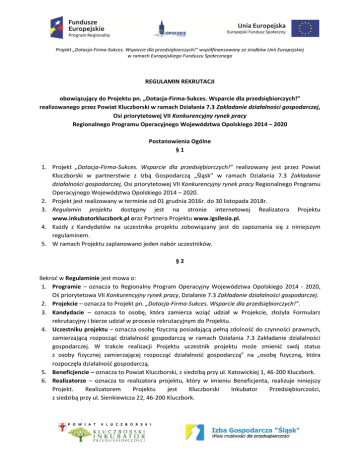 Projekt „Dotacja-Firma-Sukces. Wsparcie dla przedsiębiorczych!” współfinansowany ze środków Unii Europejskiej w ramach Europejskiego Funduszu Społecznego REGULAMIN REKRUTACJI obowiązujący do Projektu pn. „Dotacja-Firma-Sukces. Wsparcie dla przedsiębiorczych!” realizowanego przez Powiat Kluczborski w ramach Działania 7.3 Zakładanie działalności gospodarczej, Osi priorytetowej VII Konkurencyjny rynek pracy Regionalnego Programu Operacyjnego Województwa Opolskiego 2014 – 2020 Postanowienia Ogólne §1 1. Projekt „Dotacja-Firma-Sukces. Wsparcie dla przedsiębiorczych!” realizowany jest przez Powiat Kluczborski w partnerstwie z Izbą Gospodarczą „Śląsk” w ramach Działania 7.3 Zakładanie działalności gospodarczej, Osi priorytetowej VII Konkurencyjny rynek pracy Regionalnego Programu Operacyjnego Województwa Opolskiego 2014 – 2020. 2. Projekt jest realizowany w terminie od 01 grudnia 2016r. do 30 listopada 2018r. 3. Regulamin projektu dostępny jest na stronie internetowej Realizatora Projektu www.inkubatorkluczbork.pl oraz Partnera Projektu www.igsilesia.pl. 4. Każdy z Kandydatów na uczestnika projektu zobowiązany jest do zapoznania się z niniejszym regulaminem. 5. W ramach Projektu zaplanowano jeden nabór uczestników. §2 Ilekroć w Regulaminie jest mowa o: 1. Programie – oznacza to Regionalny Program Operacyjny Województwa Opolskiego 2014 - 2020, Oś priorytetowa VII Konkurencyjny rynek pracy, Działanie 7.3 Zakładanie działalności gospodarczej. 2. Projekcie – oznacza to Projekt pn. „Dotacja-Firma-Sukces. Wsparcie dla przedsiębiorczych!”. 3. Kandydacie – oznacza to osobę, która zamierza wziąć udział w Projekcie, złożyła Formularz rekrutacyjny i bierze udział w procesie rekrutacyjnym do Projektu. 4. Uczestniku projektu – oznacza osobę fizyczną posiadającą pełną zdolność do czynności prawnych, zamierzającą rozpocząć działalność gospodarczą w ramach Działania 7.3 Zakładanie działalności gospodarczej. W trakcie realizacji Projektu uczestnik projektu może zmienić swój status z osoby fizycznej zamierzającej rozpocząć działalność gospodarczą” na „osobę fizyczną, która rozpoczęła działalność gospodarczą. 5. Beneficjencie – oznacza to Powiat Kluczborski, z siedzibą przy ul. Katowickiej 1, 46-200 Kluczbork. 6. Realizatorze – oznacza to realizatora projektu, który w imieniu Beneficjenta, realizuje niniejszy Projekt. Realizatorem Projektu jest Kluczborski Inkubator Przedsiębiorczości, z siedzibą przy ul. Sienkiewicza 22, 46-200 Kluczbork. Projekt „Dotacja-Firma-Sukces. Wsparcie dla przedsiębiorczych!” współfinansowany ze środków Unii Europejskiej w ramach Europejskiego Funduszu Społecznego 7. Partnerze – oznacza to podmiot, który jest wymieniony we wniosku o dofinansowanie projektu, realizujący wspólnie z Beneficjentem (i ewentualnie innymi Partnerami/Realizatorem) projekt na warunkach określonych w umowie o dofinansowanie oraz umowie partnerskiej i wnoszący do projektu zasoby ludzkie, organizacyjne, techniczne lub finansowe. W ramach niniejszego projektu Partnerem jest Izba Gospodarcza „Śląsk”, z siedzibą przy ul. Ozimska 184, 46-020 Opole. 8. Biurze Projektu – oznacza to miejsce zarządzania finansowego i merytorycznego Projektem, znajdujące się w Kluczborskim Inkubatorze Przedsiębiorczości przy ul. Sienkiewicza 22, 46-200 Kluczbork, I piętro – Administracja KIP. 9. Instytucja Pośrednicząca RPO WO (IP) – w województwie opolskim w zakresie wybranych obszarów EFS funkcję Instytucji Pośredniczącej RPO WO 2014-2020 pełni Wojewódzki Urząd Pracy w Opolu. 10. Dokumentach rekrutacyjnych – oznacza to dokumenty, o których mowa w § 4 niniejszego Regulaminu. 11. Komisja rekrutacyjna – oznacza to komisję powołaną przez Realizatora projektu, do oceny merytorycznej Formularzy rekrutacyjnych. 12. Grupie docelowej – oznacza to adresatów pomocy udzielanej w ramach projektu, tj. osoby fizyczne mieszkające w rozumieniu Kodeksu Cywilnego1 i/lub uczące się na terenie woj. opolskiego zamierzające rozpocząć działalność gospodarczą z wyłączeniem osób, które w dniu przystąpienia do projektu w okresie 12-stu miesięcy poprzedzających ten dzień posiadały wpis CEiDG, KRS lub prowadziły działalność na podstawie innych przepisów (w tym działalność adwokacka, komornicza lub oświatowa). Wszyscy kandydaci to osoby w wieku powyżej 29 roku życia (za osoby, powyżej 29 roku życia uznaje się osoby, które w dniu rozpoczęcia udziału w Projekcie mają ukończony 30 rok życia tj. od dnia 30 urodzin) pozostające bez pracy (bezrobotne, poszukujące pracy oraz nieaktywne zawodowo/bierne zawodowo), w tym zwłaszcza osoby znajdujące się w szczególnie trudnej sytuacji na rynku pracy tj. osoby powyżej 50 roku życia, kobiety, osoby z niepełnosprawnością, osoby długotrwale bezrobotne, osoby o niskich kwalifikacjach, osoby posiadające co najmniej jedno dziecko do 6 roku życia lub co najmniej jedno dziecko z niepełnosprawością do 18 roku życia, migranci powrotni i imigranci. Osoby w szczególnie trudnej sytuacji stanowić będą min. 90% uczestników (113 osób). Pozostałe 10% grupy docelowej stanowić będą osoby, które nie wpisują się w definicję osób w szczególnie trudnej sytuacji na rynku pracy, niemniej pozostają osobami pozostającymi bez pracy o statusie osoby bezrobotnej, osoby poszukującej pracy lub nieaktywnej zawodowo/biernej zawodowo. 13. Imigrancie – oznacza to cudzoziemca zamierzającego wykonywać pracę na terytorium Polski, w tym posiadającego zezwolenie na pobyt stały lub status uchodźcy (zgodnie z ustawą o promocji zatrudnienia i instytucjach rynku pracy). 1Ilekroć w niniejszym dokumencie jest mowa o miejscu zamieszkania w rozumieniu przepisów Kodeksu Cywilnego - zgodnie z zapisami Kodeksu Cywilnego (Rozdział II Art. 25 i 28) Miejsce zamieszkania stanowi: „Art. 25. Miejscem zamieszka