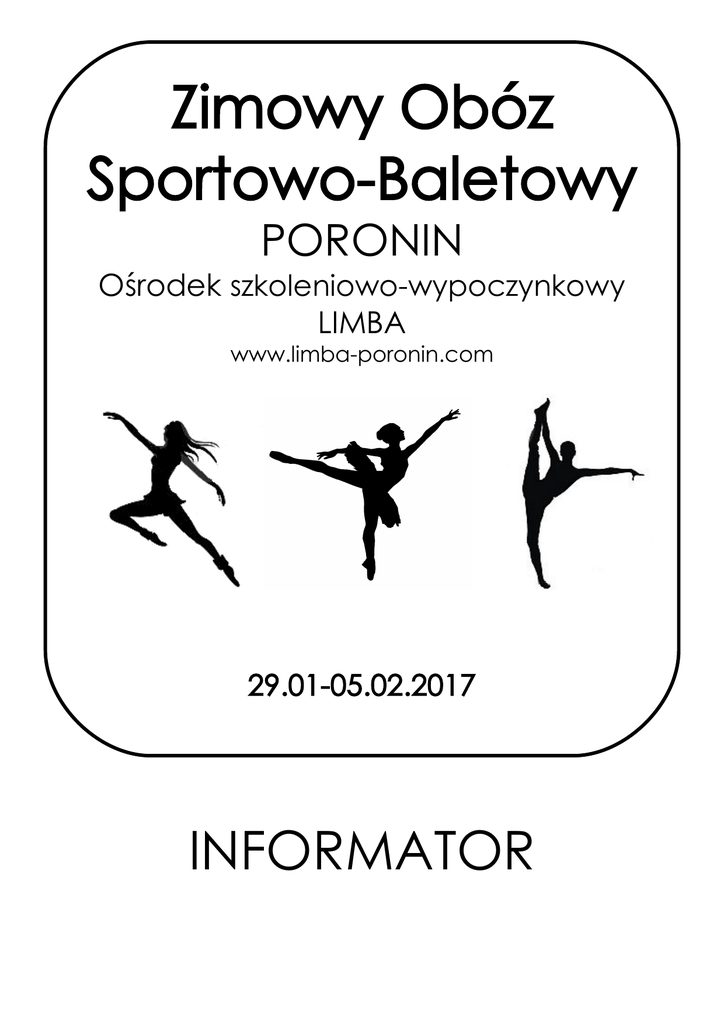 Zimowy Obóz Sportowo-Baletowy PORONIN Ośrodek szkoleniowo-wypoczynkowy LIMBA www.limba-poronin.com 29.01-05.02.2017 INFORMATOR Informacje organizacyjne 1. DZIEŃ WYJAZDU– 29.01.2016 / niedziela / parking przy Parku Handlowym Zakopianka (ul. Zakopiańska 62) GODZINA ZBIÓRKI: 10:10 / GODZINA WYJAZDU: 10:30 Na miejscu zbiórki: 1. 2. 3. UDAJ SIĘ DO OPIEKUNA PRZEKAŻ OPIEKUNOWI PODPISZ SIĘ U OPIEKUNA GRUPY DZIECKA. PODPISANĄ KOPERTĘ Z POD OŚWIADCZENIEM Lista podziału na grupy KIESZONKOWYM (najlepiej DOTYCZĄCYM ZGODY NA opiekuńcze znajduje się w drobne) ORAZ jeżeli PODAWANIE LEKÓW ORAZ dalszej części istnieje potrzeba NA FOTOGRAFOWANIE. „Informatora”. (podpisane i osobno spakowane) LEKI DZIECKA. *Narciarze przekazują również w osobno podpisanej kopercie opłatę za pakiet narciarski. Bardzo prosimy o pożegnanie się z dziećmi przed ich wejściem do autobusu. 1.DZIEŃ POWROTU – 05.02.2017 niedziela / około godz. 12.30 / 13.00* / parking przy Parku Handlowym Zakopianka. *w zależności od warunków panujących na drodze 2.Telefon dzieci będą odbierać w trakcie ciszy poobiedniej – około 14.30 – 15.30 (ostateczną godzinę podamy pierwszego dnia Obozu). Telefon powinien znajdować w się w podpisanym futerale. 3.Prosimy o zapewnienie dzieci, że w każdej sytuacji może liczyć na pomoc wychowawcy i kierownika obozu. 4.Z przyczyn organizacyjnych przydział dzieci do pokojów oraz grup ćwiczeniowych odbędzie się po przyjeździe do Poronina. Dojazd do Parku Handlowego Zakopianka Podział na grupy opiekuńcze Grupa 1 „Różowe” pod opieką Pani Karoliny Łaciak: 1. Bonarek Krystyna 2. Gawor Janeczka 3. Jaglarz Maja 4. Kasperek Karolina 5. Klimczyk Lilianna 6. Lewkowicz Hanna 7. Matusik Joanna 8. Ochońska Emilia 9. Roman Kinga 10. Stec Magdalena 11. Wąsikowska Alicja Grupa 2 „Fioletowe” pod opieką Pani Aleksandry Domagała: 1. Bożek Natalia 2. Budyn Hanna 3. Bułacz Maja 4. Foszcz Paulina 5. Grzyb Maja 6. Kotyras Paulina 7. Kowalska Milena 8. Łodzińska Klaudia 9. Mirosław Hanna 10. Płonka Joanna 11. Skrzypczak Zuzanna 12. Słonecka Maria 13. Szkaradek Maria 14. Warias Nel 15. Wąsik Kinga Grupa 3 „Niebieskie” pod opieką Pani Anny Banaś: 1. Brągiel Antonina 2. Foszcz Karolina 3. Harasymów Anita 4. Kruczek Urszula 5. Puszczyńska Celina 6. Satora Gabriela 7. Seweryn Zuzanna 8. Walczak Jagoda 9. Wiktorczyk Zuzanna 10. Wiktorczyk Gabriela 11. Zapała Ewa Grupa 4 „Złote” pod opieką Pani Karoliny Kursa- Bargieł: 1. Felczak Natalia 2. Filec Amelia 3. Gaujour Paulina 4. Jakima Gabriela 5. Kamasz Laura 6. Kuc Zuzanna 7. Loster Martyna 8. Malasińska Jagoda 9. Paszko Wiktoria 10. Pawlik Oliwia 11. Płonka Katarzyna 12. Puszczyńska Zuzanna 13. Pyzia Estera 14. Sendor Zuzanna 15. Sochacka Iga 16. Sroczyńska Eliza 17. Szerla Natalia Lista rzeczy Oto lista potrzebnych oraz przydatnych rzeczy: Strój baletowy, rajstopy, baletki, Dres, legginsy, t-shirt, Strój kąpielowy, klapki, 2 ręczniki (jeden na basen), Buty do hip-hopu (tenisówki/adidasy), Strój sceniczny (na baletowy bal przebierańców), Podpisana szczotka do włosów i inne przybory do czesania, Podpisany bidon, Ciepła odzież zimowa (ocieplane spodnie/kombinezon, kurtka z kapturem, buty śniegowce, golfy, 2 pary rękawiczek, 2 czapki, szalik), Plecak na wycieczki, Legitymacja szkolna, Przybory do pisania, Płyty / pendrive lub inny nośnik danych z ulubioną muzyką, Lekarstwa (w przypadku osób, które muszą przyjmować leki specjalistyczne np. Aviomarin), Dobry humor i głowę pełną pomysłów :-) UWAGA! Nie ponosimy odpowiedzialności za cenne rzeczy (m.in. mp3, aparaty, telefony komórkowe). NARCIARZE: Podpisane: narty (sprawdzone w serwisie, spięte paskami), buty narciarskie, kije do nart oraz gogle, Kask- osoby bez kasku nie zostaną wpuszczone na stok! Odzież narciarska: kombinezon, rękawiczki, bielizna, 2 pary skarpet, GOLF – dzieci na stoku jeżdżą w golfach, nie w szalikach, Krem do twarzy z filtrem UV, szminka ochronna. Notatki Dane kontaktowe Organizator: Niepubliczna Pozaszkolna Specjalistyczna Placówka Oświatowo-Wychowawcza „Edukacja Artystyczna Dzieci” ul. Krowoderska 48 / 2 31-158 Kraków tel.+48 504 676 955 +48 537 379 955 Ośrodek: Ośrodek wypoczynkowy „Limba” ul. Kośne Hamry 15A 34-520 Poronin tel.+48 18 20 74 042 +48 603 656 765 Kierownik obozu: Bernadetta Zwierowska tel. +48 510 073 678 Wychowawcy: Karolina Kursa- Bargieł tel. +48 505 328 180 Karolina Łaciak tel. +48 510 779 138 Aleksandra Domagała tel. +48 605 610 713 Anna Banaś tel. + 48 512 053 675
