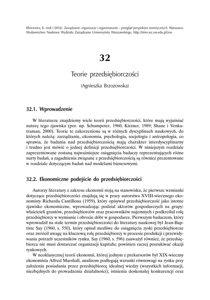 Klincewicz, K. (red.) (2016). Zarządzanie, organizacje i organizowanie – przegląd perspektyw teoretycznych. Warszawa: Wydawnictwo Naukowe Wydziału Zarządzania Uniwersytetu Warszawskiego, http://timo.wz.uw.edu.pl/zoo 32 Teorie przedsiębiorczości (Agnieszka Brzozowska) 32.1. Wprowadzenie W literaturze znajdziemy wiele teorii przedsiębiorczości, które mają wyjaśniać naturę tego zjawiska (por. np. Schumpeter, 1960; Kirzner, 1989; Shane i Venkatraman, 2000). Teorie te zakorzenione są w różnych dyscyplinach naukowych, do których należą: zarządzanie, ekonomia, psychologia, socjologia i antropologia, co sprawia, że badania nad przedsiębiorczością mają charakter interdyscyplinarny i trudno jest mówić o jednej definicji przedsiębiorczości. W niniejszym rozdziale zaprezentowane zostaną najważniejsze osiągnięcia badaczy reprezentujących różne nurty badań, a zagadnienia związane z przedsiębiorczością są również prezentowane w rozdziale dotyczącym badań nad modelami biznesowymi. 32.2. Ekonomiczne podejście do przedsiębiorczości Autorzy literatury z zakresu ekonomii stoją na stanowisku, że pierwsze wzmianki dotyczące przedsiębiorczości znajdują się w pracy autorstwa XVIII-wiecznego ekonomisty Richarda Cantillona (1959), który opisywał przedsiębiorczość jako istotne zjawisko ekonomiczne, wprowadzając podział aktorów gospodarczych na grupy: właścicieli gruntów, przedsiębiorców oraz pracowników najemnych i podkreślał rolę przedsiębiorcy w wymianie i obrocie dóbr w gospodarce. Pierwszym badaczem, który wprowadził na stałe termin przedsiębiorczości do literatury naukowej był Jean-Baptiste Say (1960, s. 550), który opisał możliwe do osiągnięcia zyski przedsiębiorcze oraz zwrócił uwagę na kluczową rolę przedsiębiorcy w procesie produkcji i przewidywania potrzeb uczestników rynku. Say (1960, s. 596) zauważył również, że przedsiębiorca nie musi dostarczać organizacji kapitału; powinien raczej poszukiwać okazji rynkowych. W neoklasycznej teorii ekonomii, której jednym z prekursorów był XIX-wieczny ekonomista Alfred Marshall, analizom podlegają warunki równowagi na rynku przy założeniu posiadania przez przedsiębiorcę idealnej wiedzy (wszystkich informacji, niezbędnych do prowadzenia działalności), istnienia doskonałej konkurencji oraz 460 VI. PRZEDSIĘBIORCZOŚĆ, INNOWACJE I WIEDZA niezróżnicowanych towarów, a także braku barier rynkowych wejścia i wyjścia, przez co rynek staje się odpowiednikiem „czarnej skrzynki”, pozwalającej podmiotom na maksymalizowanie zysków (Marshall, 1890/1930, s. 554–598). Krytycy wskazują jednak, że nie każdy właściciel firmy będzie w podobnym stopniu przedsiębiorczy (Loasby, 1982, s. 235), a perspektywa neoklasyczna w niedostatecznym stopniu wyjaśnia zachowania przedsiębiorcze. Szkoła austriacka w ekonomii analizuje procesy rynkowe przez pryzmat ludzkiego działania i jego efektów (von Mises, 2007, s. 215). Jej przedstawicielem był m.in. Joseph A. Schumpeter, według którego funkcją przedsiębiorcy jest zrywanie z dotychczasowymi wzorcami produkcji poprzez wdrażanie nowych sposobów wytwarzania, a jednocześnie docenianie znaczącego wpływu zachowań indywidualnych osób na procesy rynkowe (Schumpeter, 1995, s. 162). Za przyczynę rozwoju gospodarczego Schumpeter (1995, s. 102) uznaje wprowadzanie nowych kombinacji czynników wytwórczych, czyli działalność, którą zajmują się przedsiębiorcy. Poprzez ciągłą reorganizację posiadanych zasobów przedsiębiorca wytrąca rynek z równowagi, wprowadzając „twórczą destrukcję” (ang. creative destruction). Schumpeter wprowadził pojęcie innowacji w naukach ekonomicznych, rozumianej nie jako stworzenie nowego pomysłu lub rozwiązania, ale wprowadzenie go do praktyki gospodarczej (Schumpeter, 1960, s. 104). Israel M. Kirzner wskazuje na indywidualny charakter działań przedsiębiorcy, który realizuje założone cele i wykorzystuje szanse rynkowe, dokonując odpowiedniej alokacji w celu zaspokojenia popytu (Kirzner, 1973, s. 15). Do unikalnych zdolności przedsiębiorcy należy wrażliwość na informacje (ang. alertness to information), pozwalająca lepiej od innych osób rozpoznawać szanse rynkowe (Kirzner, 1989, s. 27), jak również subiektywna umiejętność dostrzegania i wykorzystywania okazji biznesowych (Kirzner, 1979, s. 158). S.A. Alvarez i J.B. Barney (2007) sugerują, że szanse nie muszą istnieć obiektywnie i czekać na odkrycie (jak sądził Kirzner), ale mogą być też tworzone przez samych przedsiębiorców za sprawą kreatywności i innowacyjnego wykorzystania zasobów. Przedsiębiorca w ujęciu Casson (1982; 1987) ma się specjalizować w podejmowaniu decyzji na temat zasobów i ich alokacji na rynkach, na których koszty pozyskania informacji są różne dla różnych osób. William J. Baumol powiązał zagadnienie przedsiębiorczości z dorobkiem głównych nurtów ekonomii jako zjawisko stałe i niezmiennie występujące w społeczeństwie, postulując wsparcie przez instytucje publiczne tych działań przedsiębiorców, które są produktywne, czyli wpływają na wzrost PKB (Baumol, 1990, s. 898), a produktywność przedsiębiorców wiążąc z efektywnością działań podejmowanych przez te instytucje. Na zjawisko przedsiębiorczości możemy spojrzeć również w kontekście teorii agencji, która interesuje się asymetrycznymi pozycjami stron w organizacji – pryncypała (właściciela) i agenta (menedżera) (Shleifer i Vishny, 1997). Alternatywnych ekonomicznych interpretacji przedsiębiorczości dostarcza wreszcie perspektywa, która analizuje powstawanie firm przez pryzmat procesów rozpowszechniania się wiedzy pomiędzy organizacjami (ang. knowledge spillovers) (Acs i in., 2009). Agnieszka Brzozowska – Teorie przedsiębiorczości 461 32.3. Psychologiczne podejście do przedsiębiorczości Badania psychologiczne analizują przedsiębiorczo