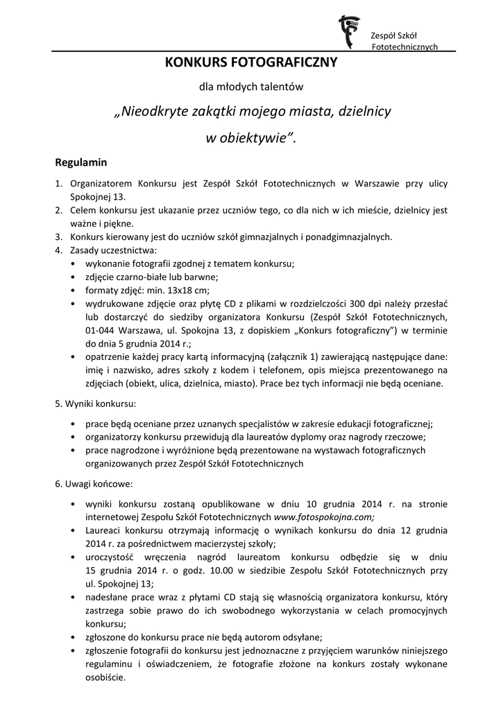 Zespół Szkół Fototechnicznych KONKURS FOTOGRAFICZNY dla młodych talentów „Nieodkryte zakątki mojego miasta, dzielnicy w obiektywie”. Regulamin 1. Organizatorem Konkursu jest Zespół Szkół Fototechnicznych w Warszawie przy ulicy Spokojnej 13. 2. Celem konkursu jest ukazanie przez uczniów tego, co dla nich w ich mieście, dzielnicy jest ważne i piękne. 3. Konkurs kierowany jest do uczniów szkół gimnazjalnych i ponadgimnazjalnych. 4. Zasady uczestnictwa: • wykonanie fotografii zgodnej z tematem konkursu; • zdjęcie czarno-białe lub barwne; • formaty zdjęć: min. 13x18 cm; • wydrukowane zdjęcie oraz płytę CD z plikami w rozdzielczości 300 dpi należy przesłać lub dostarczyć do siedziby organizatora Konkursu (Zespół Szkół Fototechnicznych, 01-044 Warszawa, ul. Spokojna 13, z dopiskiem „Konkurs fotograficzny”) w terminie do dnia 5 grudnia 2014 r.; • opatrzenie każdej pracy kartą informacyjną (załącznik 1) zawierającą następujące dane: imię i nazwisko, adres szkoły z kodem i telefonem, opis miejsca prezentowanego na zdjęciach (obiekt, ulica, dzielnica, miasto). Prace bez tych informacji nie będą oceniane. 5. Wyniki konkursu: • • • prace będą oceniane przez uznanych specjalistów w zakresie edukacji fotograficznej; organizatorzy konkursu przewidują dla laureatów dyplomy oraz nagrody rzeczowe; prace nagrodzone i wyróżnione będą prezentowane na wystawach fotograficznych organizowanych przez Zespół Szkół Fototechnicznych 6. Uwagi końcowe: • • • • • • wyniki konkursu zostaną opublikowane w dniu 10 grudnia 2014 r. na stronie internetowej Zespołu Szkół Fototechnicznych www.fotospokojna.com; Laureaci konkursu otrzymają informację o wynikach konkursu do dnia 12 grudnia 2014 r. za pośrednictwem macierzystej szkoły; uroczystość wręczenia nagród laureatom konkursu odbędzie się w dniu 15 grudnia 2014 r. o godz. 10.00 w siedzibie Zespołu Szkół Fototechnicznych przy ul. Spokojnej 13; nadesłane prace wraz z płytami CD stają się własnością organizatora konkursu, który zastrzega sobie prawo do ich swobodnego wykorzystania w celach promocyjnych konkursu; zgłoszone do konkursu prace nie będą autorom odsyłane; zgłoszenie fotografii do konkursu jest jednoznaczne z przyjęciem warunków niniejszego regulaminu i oświadczeniem, że fotografie złożone na konkurs zostały wykonane osobiście. Zespół Szkół Fototechnicznych KARTA INFORMACYJNA Imię i nazwisko ...................................................................................................... Nazwa, adres i telefon szkoły ................................................................................ .................................................................................................................................... ...............…………............................................................................................... Miejsca prezentowane na zdjęciach: 1. ................................................................................................... 2. ................................................................................................... 3. ................................................................................................... 4. ................................................................................................... 5. ................................................................................................... Oświadczam, że jestem autorem załączonych fotogramów. Niniejszym udzielam Zespołowi Szkół Fototechnicznych prawa do wykorzystania fotogramów w celach wystawienniczych i promocyjnych. Akceptuję, że przesłane przeze mnie materiały nie zostaną zwrócone. Wyrażam zgodę na przetwarzanie przez Zespół Szkół Fototechnicznych moich danych osobowych zgodnie z ustawą z dnia 29.08.1997 r. o ochronie danych osobowych (tekst jednolity Dz. U. z 2002 r. nr 101 poz. 926 ze zm.) w celach związanych z rozstrzygnięciem konkursu i publikacją fotogramów. .................... ............................................................................................. Data Czytelny podpis uczestnika ………………..………..…………………………………………………….. Czytelny podpis opiekuna prawnego (w przypadku osób niepełnoletnich)