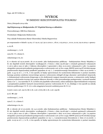 Sygn. akt XV K 881/12 WYROK W IMIENIU RZECZYPOSPOLITEJ POLSKIEJ Dnia 5 listopada 2014 roku Sąd Rejonowy w Białymstoku XV Wydział Karny w składzie: Przewodniczący: SSR Ewa Dakowicz Protokolant: Małgorzata Maliszewska Przy udziale Prokuratora Marty Olszewskiej i Marka Bogacewicza po rozpoznaniu w dniach: 14.09, 17 i 19.10, 23 i 30.11.2012 r., 18.01, 1.03.2013 r., 10.01, 21.02, 29.10.2014 r. sprawy: 1. A. P. urodzonego (...) w B. syna M. i T. z domu G. oskarżonego o to, że: I. w okresie od 19.10.2006r. do 27.10.2006r. jako funkcjonariusz publiczny - funkcjonariusz Straży Miejskiej w B. nie dopełnił swoich obowiązków wynikających z Ustawy z dnia 29.08.1997 o strażach gminnych wskazanych w art.11 pkt.2 oraz 27 pkt.1 i Zakresu obowiązków i uprawnień z dnia 10.01.2001 wskazanych w pkt. I.9 poprzez niezgodne z prawem prowadzenie postępowania o wykroczenie z art. 97 kw o sygn. RSOW 5220/447F/06 dotyczącego przekroczenia dopuszczalnej prędkości pojazdem nr rej. (...) zarejestrowanego fotoradarem w dniu 19.10.2006r. o godz. 11.44 na ul. (...) w B., w ten sposób, że będąc uprawnionym do wystawienia dokumentu w postaci mandatu karnego pomimo ustalenia rzeczywistego sprawcy wykroczenia odstąpił od jego ukarania i poświadczył nieprawdę w dokumentacji wykroczenia drogowego co do okoliczności mającej znaczenie prawne, a mianowicie osoby będącej sprawcą wykroczenia tworząc tym samym fałszywe dowody w toku prowadzonego postępowania i wystawił mandat karny o nr (...) na nazwisko N. N. (1) która nie popełniła wykroczenia, celem uniknięcia odpowiedzialności związanej z przypisaniem punktów karnych rzeczywistemu sprawcy wykroczenia M. N. (1), działając w ten sposób na szkodę interesu publicznego i N. N. (1) w celu osiągnięcia korzyści osobistej przez M. N. (1) to jest o czyn z art. 231 § 2 kk w zb. z art. 271§ 3 kk w zb. z art. 235 kk 2. C. W. (1) urodzonego (...) w B. syna Z. i A. z domu J. oskarżonego o to, że: II. w okresie od 27.10.2006r. do 14.11.2006r. jako funkcjonariusz publiczny - funkcjonariusz Straży Miejskiej w B. nie dopełnił swoich obowiązków wynikających z Ustawy z dnia 29.08.1997 o strażach gminnych wskazanych w art.11 pkt.2 oraz 27 pkt.1 i Zakresu obowiązków i uprawnień z dnia 10.01.2001 wskazanych w pkt. I.9 poprzez niezgodne z prawem prowadzenie postępowania o wykroczenie z art. 97 kw o sygn. RSOW 5220/577F/06 dotyczącego przekroczenia dopuszczalnej prędkości pojazdem nr rej. (...) zarejestrowanej fotoradarem w dniu 27.10.2006r. o godz. 12.25 na ul. (...) w B., w ten sposób, że będąc uprawnionym do wystawienia dokumentu w postaci mandatu karnego pomimo ustalenia rzeczywistego sprawcy wykroczenia odstąpił od jego ukarania i poświadczył nieprawdę w dokumentacji wykroczenia drogowego co do okoliczności mającej znaczenie prawne, a mianowicie osoby będącej sprawcą wykroczenia tworząc tym samym fałszywe dowody w toku prowadzonego postępowania i wystawił mandat karny o nr (...) na nazwisko W. K. (1), która wykroczenia nie popełniła, celem uniknięcia odpowiedzialności związanej z przypisaniem punktów karnych rzeczywistemu sprawcy wykroczenia P. Z. (1), działając w ten sposób na szkodę interesu publicznego i W. K. (1) w celu osiągnięcia korzyści osobistej przez P. Z. (1) to jest o czyn z art. 231 § 2 kk w zb. z art. 271 § 3 kk w zb. z art. 235 kk 3. J. P. (1) urodzonego (...) w M. syna W. i A. z domu B. oskarżonego o to, że: III. w okresie od 29.01.2008r. do 29.02.2008r. jako funkcjonariusz publiczny - funkcjonariusz Straży Miejskiej w B. nie dopełnił swoich obowiązków wynikających z Ustawy z dnia 29.08.1997 o strażach gminnych wskazanych w art.11 pkt.2 oraz 27 pkt.1 i Zakresu obowiązków i uprawnień z dnia 10.11.2001 wskazanych w pkt. I.9 poprzez niezgodne z prawem prowadzenie postępowania o wykroczenie z art. 97 kw o sygn. RSOW 5220/0200F/08 dotyczącego przekroczenia dopuszczalnej prędkości pojazdem nr rej. (...) zarejestrowanego fotoradarem w dniu 29.01.2008r. o godz.10.51 na ul.(...) w B., w ten sposób, że będąc uprawnionym do wystawienia dokumentu w postaci mandatu karnego zaniechał czynności zmierzających do ustalenia rzeczywistego sprawcy wykroczenia i poświadczył nieprawdę w dokumentacji wykroczenia drogowego co do okoliczności mającej znaczenie prawne, a mianowicie osoby będącej sprawcą wykroczenia tworząc tym samym fałszywe dowody w toku prowadzonego postępowania i wystawił mandat karny o nr (...) na nazwisko M. K., która nie popełniła wykroczenia, celem uniknięcia odpowiedzialności związanej z ujawnionym wykroczeniem rzeczywistemu sprawcy wykroczenia, działając w ten sposób na szkodę interesu publicznego i nieustalonego sprawcy wykroczenia w celu osiągnięcia przez niego korzyści osobistej, to jest o czyn z art. 231 § 2 kk w zb. z art. 271 § 3 kk w zb. z art. 235 kk 4. J. L. (1) urodzonego (...) w B. syna M. i Z. z domu D. oskarżonego o to, że: IV. w okresie od 19.12.2006r. do 16.01.2007r. jako funkcjonariusz publiczny - funkcjonariusz Straży Miejskiej w B. nie dopełnił swoich obowiązków wynikających z Ustawy z dnia 29.08.1997 o strażach gminnych wskazanych w art.27 pkt.1 i Zakresu obowiązków i uprawnień z dnia 24.11.2006 wskazanych w pkt. I.9 poprzez niezgodne z prawem prowadzenie postępowania o wykroczenie z art. 97 kw o sygn. RSOW 5220/1123F/06 dotyczącego przekroczenia dopuszczalnej prędkości pojazdem nr rej. (...) zarejestrowanego fotoradarem w dniu 19.12.2006r. o godz. 18:18 na ul. (...). (...)w B., w ten sposób, że będąc uprawnionym do wystawienia dokumentu w postaci mandatu karnego pomimo ustalenia tożsamości rzeczywistego sprawcy wykroczenia odstąpił od jego ukarania i poświadczył nieprawdę w dokumentacji wykroczenia drogowego co do okoliczności mającej znaczenie prawne, a mianowicie osoby będącej sprawcą wykroczenia tworząc tym samym fałszywe dowody w toku prowadzonego postępowania i kierując 