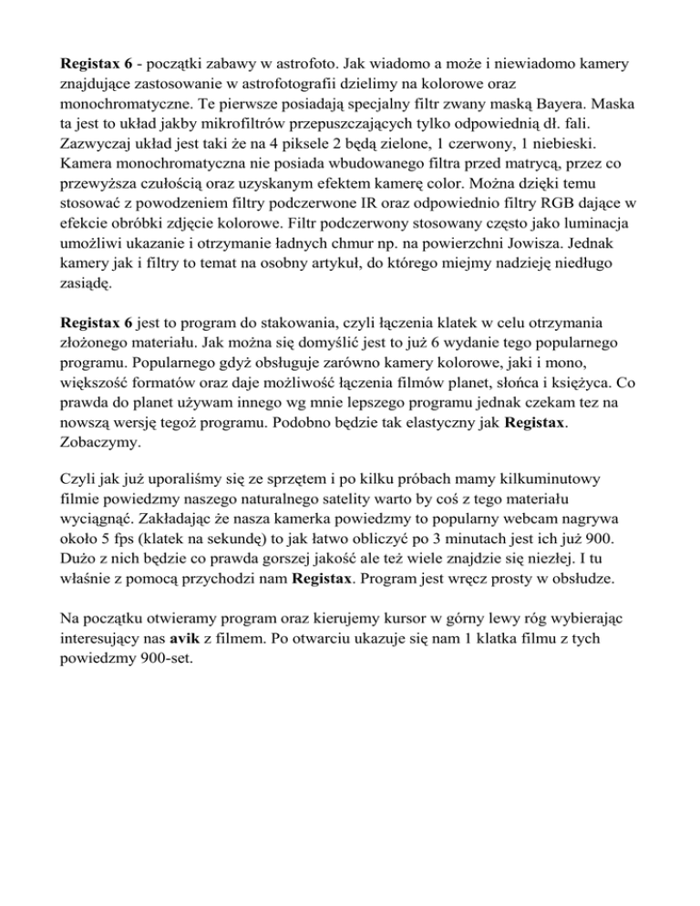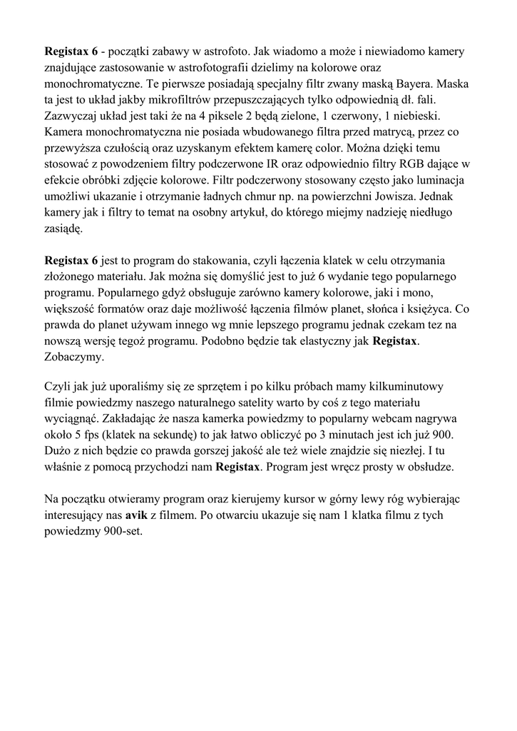 Registax 6 - początki zabawy w astrofoto. Jak wiadomo a może i niewiadomo kamery znajdujące zastosowanie w astrofotografii dzielimy na kolorowe oraz monochromatyczne. Te pierwsze posiadają specjalny filtr zwany maską Bayera. Maska ta jest to układ jakby mikrofiltrów przepuszczających tylko odpowiednią dł. fali. Zazwyczaj układ jest taki że na 4 piksele 2 będą zielone, 1 czerwony, 1 niebieski. Kamera monochromatyczna nie posiada wbudowanego filtra przed matrycą, przez co przewyższa czułością oraz uzyskanym efektem kamerę color. Można dzięki temu stosować z powodzeniem filtry podczerwone IR oraz odpowiednio filtry RGB dające w efekcie obróbki zdjęcie kolorowe. Filtr podczerwony stosowany często jako luminacja umożliwi ukazanie i otrzymanie ładnych chmur np. na powierzchni Jowisza. Jednak kamery jak i filtry to temat na osobny artykuł, do którego miejmy nadzieję niedługo zasiądę. Registax 6 jest to program do stakowania, czyli łączenia klatek w celu otrzymania złożonego materiału. Jak można się domyślić jest to już 6 wydanie tego popularnego programu. Popularnego gdyż obsługuje zarówno kamery kolorowe, jaki i mono, większość formatów oraz daje możliwość łączenia filmów planet, słońca i księżyca. Co prawda do planet używam innego wg mnie lepszego programu jednak czekam tez na nowszą wersję tegoż programu. Podobno będzie tak elastyczny jak Registax. Zobaczymy. Czyli jak już uporaliśmy się ze sprzętem i po kilku próbach mamy kilkuminutowy filmie powiedzmy naszego naturalnego satelity warto by coś z tego materiału wyciągnąć. Zakładając że nasza kamerka powiedzmy to popularny webcam nagrywa około 5 fps (klatek na sekundę) to jak łatwo obliczyć po 3 minutach jest ich już 900. Dużo z nich będzie co prawda gorszej jakość ale też wiele znajdzie się niezłej. I tu właśnie z pomocą przychodzi nam Registax. Program jest wręcz prosty w obsłudze. Na początku otwieramy program oraz kierujemy kursor w górny lewy róg wybierając interesujący nas avik z filmem. Po otwarciu ukazuje się nam 1 klatka filmu z tych powiedzmy 900-set. U dołu ekranu będzie widoczna ilość zdjęć(frame). Przesuwając dolny suwak wybieramy wg nas najlepszą klatkę zawierająca najostrzejszy obraz i najwięcej szczegółów. Będzie to wzorcowa klatkę wg której program dopasuje i odrzuci inne zbędne. Gdy już wybierzemy ta klatkę naciskamy opcję „set alinpoints”. W ten sposób program wyznacza punkty odniesienia i pomiaru. Teraz wciskamy opcję Align, czyli wyrównaj. Program śledzi wszystkie klatki filmu i porównuje je do klatki wzorcowej. Oczywiście wg swoich odpowiednich algorytmów. Po opcji align można użyć opcji Stack, czyli łączenie wcześniej wybranych dobrych klatek. Otrzymujemy w ten sposób Stack frame czyli jedna klatkę jako sumę łączenia wszystkich. W tej chwili zapisujemy obraz. Docieranie-wyostrzanie” wavelety czy Lucy Richardson Deconvoluton”? Oba sposoby są dobre i tylko od nas zależy czy nasza klatkę potraktujemy suwakami wavelets w Registaxie czy tez o ile mamy zainstalowany program Astra Imane (polecam!) zastosujemy wyostrzanie LRD. Jeżeli wyostrzamy suwakami Wavelets to ja zazwyczaj korzystam z 3 dolnych. Wyciąga nam to jak najwięcej detalu bez otrzymania niepotrzebnego szumu. Jak daleko wyostrzyć i jak mocno przesunąć suwaki to zależy tylko od nas czyli metoda prób i błędów. Na końcu, jeżeli istnieje taka potrzeba można troche przeciągnąc krzywą Gamma oraz zmienić jasność oraz kontrast suwakami w dolnym prawym rogu. Korzystając z programu Astra Image oraz opcji LRD wyostrzanie prowadzimy poprzez korekcję PSF Size oraz Iterations. Zanim zaakceptujemy wynik jest możliwość sprawdzenia, jaki efekt da wyostrzanie za pomocą dwóch okienek „przed” i „po” EFEKT KOŃCOWY REGISTAX ASTRA IMAGE