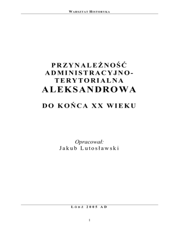 W A R S ZT A T H I S T O R Y KA PRZYNALEśNOŚĆ ADMINISTRACYJNOTERYTORIALNA ALEKSANDROWA DO KOŃCA XX WIEKU Opracował: Jakub Lutosławski Ł Ó D Ź 2005 AD 1 W A R S ZT A T H I S T O R Y KA SPIS RZECZY Wstęp 3 Rozdział I Administracyjna przynaleŜność BruŜycy Wielkiej. 4 Rozdział II Osada Aleksandrów w ujęciu administracyjnym od powstania do roku 1837. 8 Rozdział III Status administracyjny Miasta Aleksandrów w latach 1837 -1866. 10 Rozdział IV Osada Aleksandrów w latach 1866 – 1914. 12 Rozdział V Status administracyjny Aleksandrowa w latach 1914 – 1918. 14 Rozdział VI Aleksandrów między wojnami 1918-1939. 15 Rozdział VII Aleksandrów w administracji terytorialnej III Rzeszy. 17 Rozdział VIII Od reformy do reformy – Aleksandrów po 1945 roku. 19 Bibliografia 22 2 W A R S ZT A T H I S T O R Y KA WSTĘP Aleksandrów Łódzki – jedna z wielu osad powstałych na ziemiach polskich po burzliwej epoce wojen napoleońskich nigdy nie był tematem wielkich rozpraw historycznych. O ile PrzynaleŜność administracyjno-terytorialna Aleksandrowa do końca XX wieku nie jest oględną formą przekazu historycznego, o tyle zamiarem moim w tworzeniu tejŜe monografii było poszerzenie dosyć skromnego zbioru publikacji o Aleksandrowie. Praca ta poza związkami stricte administracyjno-terytorialnymi obejmuje równieŜ w niewielkim stopniu zagadnienia historyczne, których zastosowanie wiąŜę się z wyjaśnieniem niektórych wątków tematycznych pracy. Granice okresu, w jakim się poruszam trudno określić jednoznacznie. Zamierzam nieco więcej miejsca poświęcić BruŜ ycy Wielkiej, więc za źródłami encyklopedycznymi sięgam do XII wieku. Czas właściwy będący przedmiotem badań rozpoczynają księgi sądowe łęcz yckie z 1386 roku w sposób niezbity świadczące o istnieniu BruŜyc y Wielkiej. Kwartyl górny w sposób logiczny wiąŜe się z ostatnią reformą podziału administracyjnego w Polsce z 1999 roku. W kaŜdym z rozdziałów starałem się ukazać prz ynaleŜność Aleksandrowa, bądź BruŜyc y Wielkiej do właściwych jednostek terytorialnych, czasem poszerzając je o prz ynaleŜność sądowniczą, kościelną (katolicką) itp. Kamili za pomoc w badaniach poświęcam Autor. 3 W A R S ZT A T H I S T O R Y KA Rozdział I Administracyjna przynaleŜność BruŜycy Wielkiej Zarówno JaŜdŜyńska 1, jak i duet Tukaj Wróbel 2 zgodnie piszą o wsi BruŜyca Wielka jako o bezpośredniej poprzedniczce Aleksandrowa na ziemiach Królestwa Kongresowego. Pierwsze zapiski dotyczące wsi szlacheckiej Bruzica, bądź BruŜyca są duŜo starsze i pochodzą z ksiąg sądowych łęczyckich z 1386 roku 3. W okresie I Rzeczypospolitej BruŜyca leŜała w granicach prowincji wielkopolskiej w Koronie. Księgi sądowe, w których wymienia się nazwę BruŜyca przynaleŜność zostały wsi do wydane tegoŜ w łęczyckim, województwa. co Nie wskazuje ma na natomiast zgodności, co do lokacji powiatowej BruŜycy, choć wiadomo, Ŝe granicach administracyjnych łęczyckiego znajdowały się wówczas powiaty łęczycki, brzeziński i orłowski. Taki stan rzeczy pozostał nienaruszony aŜ do II rozbioru Polski. W 1793 niemal cały obszar ziem sieradzko-łęczyckich wszedł w skład prowincji tzw. Prus Południowych. BruŜyca Wielka wraz z całym województwem łęczyckim została wcielona do nowoutworzonego departamentu łęczyckiego z narzuconą administracją pruską. Po zniknięciu Polski z map Europy w roku 1796 terytorium dzisiejszego województwa łódzkiego znalazło się w granicach departamentów warszawskiego i kaliskiego 4. Taki stan administracyjny trwał do 1806 roku, gdy zaborcę wyparły wojska napoleońskie. W 1 J. JaŜdŜyńska, Monografia miasta przemysłowego Aleksandrów w latach 1822-1870, Łódź 1954, s. 9. H. Tukaj J. Wróbel, Aleksandrów Łódzki. Zarys dziejów 1816-1948, Aleksandrów 1992, s. 5. 3 J. JaŜdŜyńska, Monografia … , s.9 4 M. Bandurka, Zmiany administracyjne i terytorialne województwa łódzkiego w XIX i XX wieku, Warszawa 1974, s. 9. 2 4 W A R S ZT A T H I S T O R Y KA styczniu 1807 została powołana tzw. Komisja Rządząca, która przejęła władzę administracyjną nad terytoriami podległymi Napoleonowi. Reforma terytorialna została wprowadzona w Ŝycie dopiero po traktatach tylŜyckich i uregulowana dekretem z 19 grudnia 1807 roku. Ustanowiono niniejszym na terenie dzisiejszego województwa łódzkiego 60 powiatów zamiast dotychczasowych 58. BruŜyca Wielka znalazła się w granicach administracyjnych powiatu zgierskiego z siedzibą władz w Piątku w nowoutworzonym departamencie warszawskim. Po względem sądowniczym w okresie Księstwa Warszawskiego w sprawach mieszkańców BruŜycy Wielkiej rozstrzygał Sąd Pokoju dla powiatu zgierskiego i Trybunał Cywilny I instancji dla departamentu warszawskiego. Sąd Karny i Odzewny (Apelacyjny) był jeden na całe Księstwo Warszawskie, wobec czego podlegały mu wszystkie jednostki administracyjne. 22 maja 1815 roku prawnie przestało istnieć Księstwo Warszawskie. Mocą ustawy konstytucyjnej z 27 listopada 1815 roku Królestwo Kongresowe podzielono na województwa nawiązując do przedrozbiorowego rozkładu terytorialnego. BruŜyca Wielka w nowym porządku znalazła się w granicach województwa mazowieckiego. Władze rosyjskie przy zachowaniu nazewnictwa województw zlikwidowały powiaty jako jednostki administracyjne. Dotychczasowy powiat zgierski, na terenie którego znajdowała się BruŜyca wszedł wespół z powiatem łęczyckim w skład obwodu łęczyckiego. Dotychczasowe terytorium powiatów posłuŜyło jako jednostka przy podziale na okręgi wyborcze i miejsca zwoływania sejmików ziemskich. Dla omawianego obszaru siedzibą powiatu było miasto 5 W A R S ZT A T H I S T O R Y KA 5 Piątek. Podział, o którym szerzej pisze Bandurka wszedł w Ŝycie w drugiej połowie 1816 roku. Po względem kościelnym BruŜyca Wielka podlegała parafii zgierskiej. Jak pisze Splitt w artyku