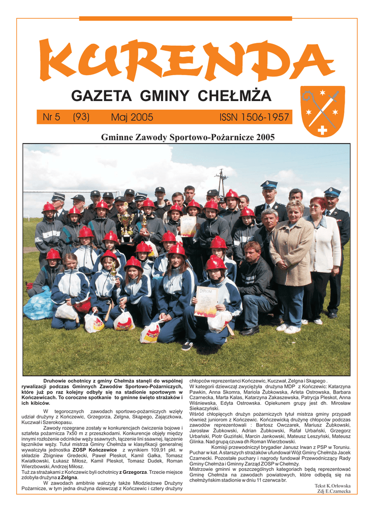 GAZETA GMINY CHEŁMŻA Nr 5 (93) Maj 2005 ISSN 1506-1957 Gminne Zawody Sportowo-Pożarnicze 2005 Druhowie ochotnicy z gminy Chełmża stanęli do wspólnej rywalizacji podczas Gminnych Zawodów Sportowo-Pożarniczych, które już po raz kolejny odbyły się na stadionie sportowym w Kończewicach. To coroczne spotkanie to gminne święto strażaków i ich kibiców. W tegorocznych zawodach sportowo-pożarniczych wzięły udział drużyny z Kończewic, Grzegorza, Zelgna, Skąpego, Zajączkowa, Kuczwał i Szerokopasu. Zawody rozegrane zostały w konkurencjach ćwiczenia bojowe i sztafeta pożarnicza 7x50 m z przeszkodami. Konkurencje objęły między innymi rozłożenie odcinków węży ssawnych, łączenie lini ssawnej, łączenie łączników węży. Tutuł mistrza Gminy Chełmża w klasyfikacji generalnej wywalczyła jednostka ZOSP Kończewice z wynikiem 109,91 pkt. w składzie Zbigniew Gredecki, Paweł Pleskot, Kamil Gałka, Tomasz Kwiatkowski, Łukasz Miłosz, Kamil Pleskot, Tomasz Dudek, Roman Wierzbowski, Andrzej Miłosz. Tuż za strażakami z Kończewic byli ochotnicy z Grzegorza. Trzecie miejsce zdobyła drużyna z Zelgna. W zawodach ambitnie walczyły także Młodzieżowe Drużyny Pożarnicze, w tym jedna drużyna dziewcząt z Kończewic i cztery drużyny chłopców reprezentanci Kończewic, Kuczwał, Zelgna i Skąpego . W kategorii dziewcząt zwyciężyła drużyna MDP z Kończewic: Katarzyna Pawkin, Anna Skomra, Mariola Żubkowska, Arleta Ostrowska, Barbara Czarnecka, Marta Kalas, Katarzyna Zakaszewska, Patrycja Pleskot, Anna Wiśniewska, Edyta Ostrowska. Opiekunem grupy jest dh. Mirosław Siekaczyński. Wśród chłopięcych drużyn pożarniczych tytuł mistrza gminy przypadł również juniorom z Kończewic. Kończewicką drużynę chłopców podczas zawodów reprezentowali : Bartosz Owczarek, Mariusz Żubkowski, Jarosław Żubkowski, Adrian Żubkowski, Rafał Urbański, Grzegorz Urbański, Piotr Guziński, Marcin Jankowski, Mateusz Leszyński, Mateusz Glinka. Nad grupą czuwa dh Roman Wierzbowski. Komisji przewodniczył brygadier Janusz Irwan z PSP w Toruniu. Puchar w kat. A starszych strażaków ufundował Wójt Gminy Chełmża Jacek Czarnecki. Pozostałe puchary i nagrody fundował Przewodniczący Rady Gminy Chełmża i Gminny Zarząd ZOSP w Chełmży. Mistrzowie gminni w poszczególnych kategoriach będą reprezentować Gminę Chełmża na zawodach powiatowych, które odbędą się na chełmżyńskim stadionie w dniu 11 czerwca br. Tekst K.Orłowska Zdj E.Czarnecka Serwis informacyjny z Urzędu Gminy Informacje z pracy Rady Gminy Informacja z pracy Wójta i Urzędu Gminy od 18 marca do 29 kwietnia 2005 roku Informacja z obrad XXXVI Sesji Rady Gminy I.Przetargi 1. Renowacja rowów melioracyjnych na terenie Gminy Chełmża. Ilość złożonych ofert 2. Jako najkorzystniejszą wybrano ofertę Przedsiębiorstwa Budownictwa Wodnego „PROMEL” z Drzycimia na łączną wartość 35.705,76 zł. 2. Przygotowanie i dostarczenie posiłków w ramach dożywiania uczniów w szkołach. W postępowaniu wpłynęła 1 oferta złożona przez firmę Usługi Gastronomiczne Adrian Swędera Przysiersk. Cena 1 posiłku brutto 1,77 zł. 3. Budowa łączników sal gimnastycznych przy Gimnazjum w Głuchowie i Pluskowęsach oraz zagospodarowanie terenu wokół obiektu. Ilość złożonych ofert 9. Jako najkorzystniejszą wybrano ofertę firmy Przedsiębiorstwo Usług Miejskich PUM Sp. z o.o. Z Grudziądza na łączną kwotę 1.770.585,79 zł. II. Inwestycje i remonty 1. Prace remontowo budowlane: Nawra - likwidacja usterek w gabinetach Ośrodka Zdrowia, Kończewice - ocieplanie budynku mieszkalnego, Grzegorz - remont świetlicy, Dziemiony - malowanie świetlicy i ułożenie chodnika. III. Rolnictwo i ochrona środowiska 1. Akcja Sprzątanie Świata wiosna 2005 Każda osoba, która wzięła udział w akcji mogła skorzystać z nieodpłatnego przyjęcia zebranych śmieci na wysypisko w Kamionkach Dużych po okazaniu upoważnienia wydanego przez UG. W sprzątaniu uczestniczyli: uczniowie wszystkich szkół z terenu gminy, 3 Drużyna Harcerska im. Gen Bema z Zelgna , 26 sołectw, pracownicy brygady budowlanej utworzonej przy UG oraz członkowie Polskiego Związku Wędkarskiego. Wywóz nieczystości zapewniło Gospodarstwo Pomocnicze. Łączna ilość nieczystości wywiezionych na wysypisko w ramach akcji wiosennego sprzątania wyniosła 45,36 t. 2. W ramach akcji wiosennej przeprowadzono zabiegi szczepienia drzew kasztanowca. Łącznie zaszczepiono 81 szt. w miejscowościach: Brąchnówko- park, Kończewice, Zelgno, Witkowo, Grzegorz. Zabiegi przeprowadziła firma „DDD Jeszka” z Torunia. Całkowity koszt zadania 5.985,33 zł. IV. Gospodarka gruntami i nieruchomościami 1. Nieruchomości przygotowywane do zbycia: -8 działek letniskowych w Zalesiu o pow. od 0,1118 ha do 0,1705 ha. -5 działek budowlanych we wsi Strużal o pow. 0,1005 ha każda. -4 działki budowlane z możliwością uprawiania rzemiosła nieuciążliwego we wsi Kuczwały o pow. o 0,1368 do 0,1733 ha. 2. Nieruchomości przygotowywane do oddania w dzierżawę - działka o pow. ok 1 ha w Zalesiu z przeznaczeniem na 14 budynków letniskowych ( przeznaczonych pod wynajem), - nieruchomości stanowiące grunty rolne oraz ogródki przydomowe w mciach: Grzegorz, Pluskowęsy, Dziemiony, Kiełbasin, Dźwierzno, Mirakowo. 3. W m-cu kwietniu przejęto protokolarnie nieruchomość stanowiącą mienie komunalne Gminy Chełmża poł. w Grzegorzu będącą w posiadaniu Kółka Rolniczego. Przejęciem objęto również znajdujące się na tych gruntach budynki i budowle. Podczas obrad Sesji w dniu 29 kwietnia br Rada Gminy podjęła 7 uchwał. 1. Rozpatrzenie sprawozdania z wykonania budżetu za 2004 rok. Rada Gminy po wysłuchaniu sprawozdania oraz zapoznaniu się z opiniami Regionalnej Izby Obrachunkowej oraz wnioskiem Komisji Rewizyjnej w wyniku przeprowadzonego głosowania przy 14 głosach- za i 1 głosie przeciwnym udzieliła Wójtowi Gminy absol