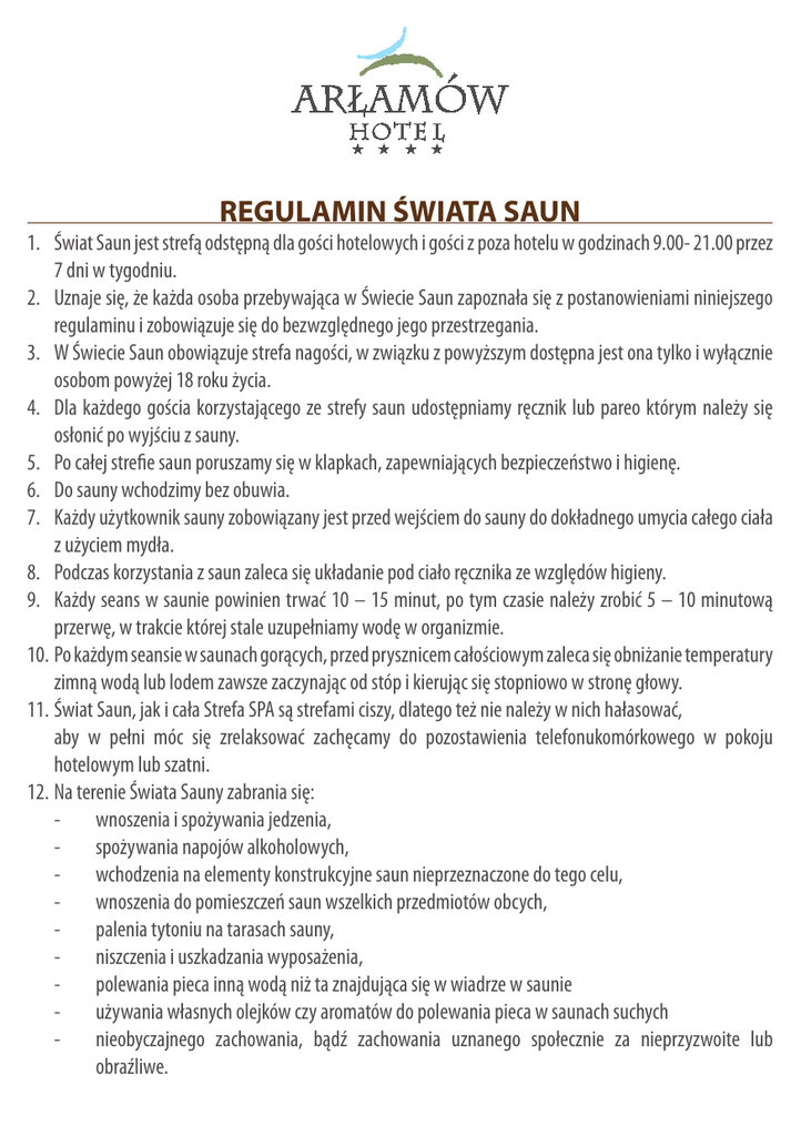 REGULAMIN ŚWIATA SAUN 1. Świat Saun jest strefą odstępną dla gości hotelowych i gości z poza hotelu w godzinach 9.00- 21.00 przez 7 dni w tygodniu. 2. Uznaje się, że każda osoba przebywająca w Świecie Saun zapoznała się z postanowieniami niniejszego regulaminu i zobowiązuje się do bezwzględnego jego przestrzegania. 3. W Świecie Saun obowiązuje strefa nagości, w związku z powyższym dostępna jest ona tylko i wyłącznie osobom powyżej 18 roku życia. 4. Dla każdego gościa korzystającego ze strefy saun udostępniamy ręcznik lub pareo którym należy się osłonić po wyjściu z sauny. 5. Po całej strefie saun poruszamy się w klapkach, zapewniających bezpieczeństwo i higienę. 6. Do sauny wchodzimy bez obuwia. 7. Każdy użytkownik sauny zobowiązany jest przed wejściem do sauny do dokładnego umycia całego ciała z użyciem mydła. 8. Podczas korzystania z saun zaleca się układanie pod ciało ręcznika ze względów higieny. 9. Każdy seans w saunie powinien trwać 10 – 15 minut, po tym czasie należy zrobić 5 – 10 minutową przerwę, w trakcie której stale uzupełniamy wodę w organizmie. 10. Po każdym seansie w saunach gorących, przed prysznicem całościowym zaleca się obniżanie temperatury zimną wodą lub lodem zawsze zaczynając od stóp i kierując się stopniowo w stronę głowy. 11.Świat Saun, jak i cała Strefa SPA są strefami ciszy, dlatego też nie należy w nich hałasować, aby w pełni móc się zrelaksować zachęcamy do pozostawienia telefonukomórkowego w pokoju hotelowym lub szatni. 12.Na terenie Świata Sauny zabrania się: - wnoszenia i spożywania jedzenia, - spożywania napojów alkoholowych, - wchodzenia na elementy konstrukcyjne saun nieprzeznaczone do tego celu, - wnoszenia do pomieszczeń saun wszelkich przedmiotów obcych, - palenia tytoniu na tarasach sauny, - niszczenia i uszkadzania wyposażenia, - polewania pieca inną wodą niż ta znajdująca się w wiadrze w saunie - używania własnych olejków czy aromatów do polewania pieca w saunach suchych - nieobyczajnego zachowania, bądź zachowania uznanego społecznie za nieprzyzwoite lub obraźliwe. 13.Z Świata Saun nie mogą korzystaćosoby których oznaki zewnętrzne wskazują na zakaźne choroby skóry tj. grzybica, rumień, róża, itp., osoby, które cierpią na choroby układu krążenia lub oddechowego ( żylaki, choroba niedokrwienna serca, astma itp. ), kobietyw czasie menstruacji oraz osoby posiadające otwarte rany na ciele. 14.SPA Arłamów zastrzega sobie prawo do odmówienia wpuszczenia do Strefy Saun osób, których stan wyraźnie wskazuje na spożycie alkoholu. 15.Wszelkie skaleczenia, problemy ze zdrowiem oraz pogorszenie samopoczucia należy niezwłocznie zgłaszać najbliższemu pracownikowi obsługi SPA Arłamów lub skorzystać z czerwonego przycisku sygnalizacyjnego (ALARM), który znajduje się w każdym pomieszczeniu sauny. 16.W celu zaczerpnięcia dodatkowych informacji, należy zgłosić się do jednego z pracowników obsługi SPA Arłamów. 17.Hotel Arłamów nie ponosi odpowiedzialności za skutki zdrowotne przebywających w saunach, osób niezgłaszających przeciwwskazań z ich korzystania oraz za rzeczy pozostawione lub zgubione na terenie SPA. Szczegółowych informacji udziela recepcja Spa Tel. 13 443 1059 Szersza oferta usług wellness oraz rekreacyjno-sportowych dostępna na www.arlamow.pl