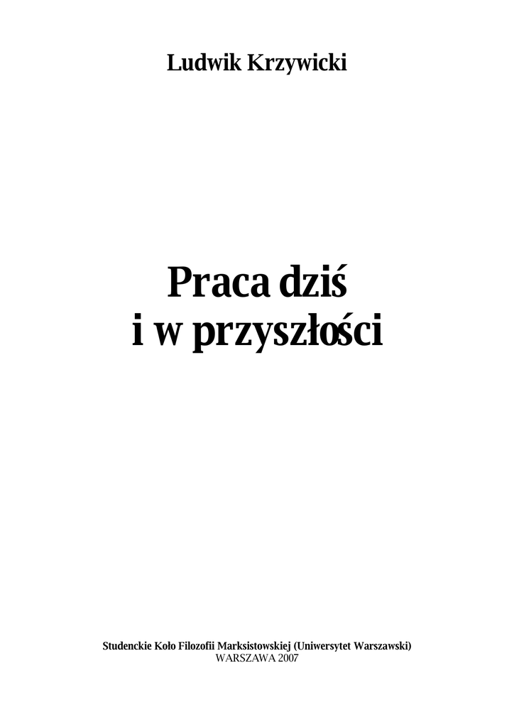 Ludwik Krzywicki Praca dziś i w przyszłości Studenckie Koło Filozofii Marksistowskiej (Uniwersytet Warszawski) WARSZAWA 2007 Ludwik Krzywicki – Praca dziś i w przyszłości (1884 rok) Artykuł Ludwika Krzywickiego „Praca dziś i w przyszłości” został napisany w 1884 roku i ukazał się w piśmie „Przedświt” nr 8, z grudnia 1884 r. Podstawa niniejszego wydania: „Pierwsze pokolenie marksistów polskich”, tom 2, wyd. Książka i Wiedza, Warszawa 1962. -2© Studenckie Koło Filozofii Marksistowskiej (UW) www.skfm-uw.w.pl Ludwik Krzywicki – Praca dziś i w przyszłości (1884 rok) Wielu z nas zdarzyła się sposobność prowadzić dysputę o socjalizmie z jakimś panem, majstrem albo dobrze płatnym pisarczykiem. Otóż przy takiej dyspucie każdy z nas słyszał następujący zarzut stawiany socjalizmowi. Dzisiaj, powiadają ci panowie, każdy z nas musi pracować, bo inaczej nie otrzyma żadnego wynagrodzenia i nie będzie miał za co żyć. Fabrykant zatem, choć i zarabia na robotniku, ma taką samą zasługę jak nauczyciel przy dziecku. Jak dziecko bez nauczyciela niczego się nie nauczy, tak robotnik bez bicza-fabrykanta nie pracowałby wcale albo pracowałby tyle tylko, ile trzeba na zaspokojenie głodu. Byłaby więc gorsza nędza niż za naszych czasów. Dziś fabrykant wprawdzie zarabia na robotniku, ale dlatego też, że zarabia, to stara się o wynalazki, o ulepszenia, co i na dobro robotnika wychodzi. Dziś wreszcie praca jest produkcyjną, to jest dużo wydaje, bo jest konkurencja między ludźmi. Jak nasz mądrala wszystko to jednym tchem powie – to aż cmoknie językiem z radości, bo wydaje mu się, że wielką prawdę wygłosił, a tymczasem jest to bredzenie nie lepsze jak owego Piekarskiego na mękach. Przypatrzmy się teraz bliżej temu gadaniu, by wszystkie fałsze poodkrywać i odpowiedzieć na nie słowami prawdy. Święta to prawda, że gdyby ludzie nie pracowali, to nie mieliby za co żyć. Wszystko, co zużywamy, to wszak jest dziełem rąk ludzkich; a ludzie dlatego znowu pracują i mozolą się, bo muszą się utrzymać, muszą swój głód zaspokoić, odziać się i mieć dach, pod którym by spocząć mogli. Ale aby pracować, nie trzeba nam już żadnego bicza-fabrykanta, bo chłód, głód i zmęczenie wystarczą na to, by zmusić do pracy. Więc nie fabrykant jest tu biczem, ale żołądek, dreszcz, co po skórze przechodzi, i zmęczenie, co nam kości łamie. To, co nasz mądrala mówi o podobieństwie człowieka do dziecka, a fabrykanta do nauczyciela, to już taka jest bajeczka, o której i w Tysiącu i jednej nocy ani słowa nie ma. Przede wszystkim uczy nauczyciel dzieciaka dodawania i mnożenia, tak samo jak uczy odejmowania i dzielenia, tymczasem fabrykant to taki profesor, który dodawanie i mnożenie dla siebie chowa, a robotnika uczy jeno, by sobie od gęby odejmować i jemu dawać albo by się owocami swej pracy z nim dzielić. Co najważniejsza jednak, to to, że nauka dziecka wcale niepodobna do pracy robotnika. Dlaczego dzieciak nie chce się uczyć? Dlatego, że nie rozumie on, iż nauka jest potrzebna, więc nie chce kawęczyć nad abecadłem. Ale weźmy niemowlę, to czyż trzeba je uczyć, że ono głodne? Jak je w żołądku głód zaświerzbi, to zaraz biegnie do piersi ssać i wrzeszczy lepiej za darmo niż dobrze płatny śpiewak za pieniądze. Co je nauczyło chcieć jeść? Jużci nie żaden profesor, jeno ścisk w żołądku. Jak więc dziecku nie trzeba nauczyciela do tego, by krzyczeć o pierś, tak i człowiekowi innych batów nie trzeba nad to, co głód, chłód i zmęczenie wymogą na nim. Więc niepotrzebny tu fabrykant wcale a wcale. Przeciwnie, jego pomoc tu tylko szkodliwa. Co by dzieciak powiedział, gdyby ni stąd ni zowąd zjawił się jakiś profesorzyna i powiedział: Nie wiesz, hebesie, że trzeba jeść; otóż ja ci to powiem, ale za to i ja się pożywię twoim mlekiem. Oj, nakrzyczałaby się dziecina tak, żeby wrzaskiem swoim mądrego profesora w kąt zapędziła. Warto i nam o takim środku pomyśleć, co by zagnał fabrykanta w dalekie kraje. Zresztą widzimy, że i dzicy ludzie rozumieją, że trzeba pracować na to, by zaspokoić swe potrzeby, choć żadnych nie mają fabrykantów. Przypatrzmy się teraz temu zarzutowi, co przypuszcza, że bez fabrykantów pracowalibyśmy ledwo tyle, ile na przykład dziki człowiek pracuje, a zatem że nie mielibyśmy tych wszystkich wynalazków i odkryć, którymi nasz świat tak już bogaty. Otóż zapytajmy się: czy dlatego dziki człowiek ma tak mało potrzeb, że nie ma on fabrykanta? Wcale nie dlatego – jeno z tej przyczyny, że nie rozumie jeszcze tej albo owej potrzeby. Dzieciak nie chce się uczyć dlatego, że nie czuje jeszcze potrzeby nauki. Ale co to o dzieciakach gadać! Gdybyśmy się naszych pradziadów rozpytali, czy chcą kolei żelaznej, to by nas wykpili. Wiadomo przecież, że taki mocarz, jak Napoleon I, wykpił wynalazcę statków parowych. My dlatego takeśmy się ucywilizowali, bo z ojca na syna przechodzi całe doświadczenie ludzkie, i ponieważ tak dużo odziedziczamy, więc się coraz dalej rozwijamy. A fabrykanci bardzo mało się do tego przyczyniają. -3© Studenckie Koło Filozofii Marksistowskiej (UW) www.skfm-uw.w.pl Ludwik Krzywicki – Praca dziś i w przyszłości (1884 rok) Dowiodę wam, na odwrót, że gdyby nie fabrykanci, to byłoby nierównie lepiej i praca ludzka przynosiłaby nierównie więcej korzyści. Każda praca jest wysileniem, jest nadwerężeniem sił. Im ona jest cięższa i dłuższa, tym przykrzejsza i człowiek ją z niechęcią wtedy wykonywa. Wiadoma przecież rzecz, że fabrykanci angielscy przyszli do tego przekonania, że robotnik robi więcej pracując dziesięć godzin dziennie, niż jak dwanaście się godzin mozoli. Po pierwsze – raźniej robi cały dzień i nie jest tak wycieńczony, a po wtóre, co człowiek zaoszczędzi na czasie, to doda jakimś wynalazkiem, jakąś odkryt