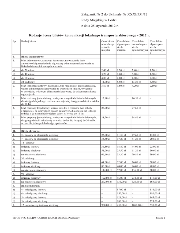 Załącznik Nr 2 do Uchwały Nr XXXI/551/12 Rady Miejskiej w Łodzi z dnia 25 stycznia 2012 r. Rodzaje i ceny biletów komunikacji lokalnego transportu zbiorowego - 2012 r. Lp. Rodzaj biletu I. Bilety jednorazowe: 1. bilet jednorazowy, czasowy, kasowany, na wszystkie linie, z możliwością przesiadania się, ważny od momentu skasowania na liniach dziennych i nocnych w czasie: Cena biletu normalnego – strefa miejska Cena biletu ulgowego – strefa miejska Cena biletu normalnego – strefa aglomeracyjna Cena biletu ulgowego – strefa aglomeracyjn a a) do 20 minut 2,40 zł 1,20 zł 2,40 zł 1,20 zł b) do 40 minut 3,20 zł 1,60 zł 3,20 zł 1,60 zł c) do 60 minut 4,00 zł 2,00 zł 4,00 zł 2,00 zł d) 24 godzinny 11,00 zł 5,50 zł 13,20 zł 6,60 zł 2. bilet jednoprzejazdowy, kasowany, bez możliwości przesiadania się, ważny od momentu skasowania na wszystkich liniach, wyłącznie w pojeździe, w którym bilet został skasowany, do zakończenia kursu tego pojazdu 3,60 zł 1,80 zł 4,20 zł 2,10 zł 3. bilet rodzinny jednodniowy, ważny na wszystkich liniach dziennych 13,80 zł dla obojga lub jednego rodzica z co najmniej dwojgiem dzieci w wieku do 16 lat – 16,50 zł – 4. bilet rodzinny trzydniowy, ważny trzy dni z rzędu (w tym soboty i niedziele), na wszystkich liniach dziennych, dla obojga lub jednego rodzica z co najmniej dwojgiem dzieci w wieku do 16 lat 23,00 zł – 27,60 zł – 5. bilet grupowy jednodniowy, ważny na wszystkich liniach dziennych, dla grupy dzieci i młodzieży w wieku do lat 16, liczącej do 30 osób, w tym dla jednego lub dwojga opiekunów 28,70 zł – 34,40 zł – II. Bilety okresowe: 1. 3 - dniowy na okaziciela sieciowy 23,00 zł 11,50 zł 27,60 zł 13,80 zł 2. 7 - dniowy na okaziciela sieciowy 34,40 zł 17,20 zł 41,20 zł 20,60 zł 3. 14 - dniowy a) imienny liniowy 36,80 zł 18,40 zł 44,00 zł 22,00 zł b) imienny sieciowy 51,00 zł 25,50 zł 61,20 zł 30,60 zł c) na okaziciela sieciowy 66,60 zł 33,30 zł 79,80 zł 39,90 zł 4. 30 - dniowy a) imienny liniowy 64,00 zł 32,00 zł 76,00 zł 38,00 zł b) imienny sieciowy 80,00 zł 40,00 zł 96,00 zł 48,00 zł c) na okaziciela sieciowy 114,00 zł 57,00 zł 136,00 zł 68,00 zł 5. 90 - dniowy a) imienny sieciowy 192,00 zł 96,00 zł 230,00 zł 115,00 zł b) na okaziciela sieciowy 272,00 zł 136,00 zł 326,00 zł 163,00 zł 6. Bilet semestralny a) 4 - miesięczny liniowy – 97,00 zł – 116,00 zł b) 4 - miesięczny sieciowy – 150,00 zł – 180,00 zł c) 5 - miesięczny liniowy – 121,00 zł – 145,00 zł d) 5 - miesięczny sieciowy – 186,00 zł – 223,00 zł 7. 12 - miesięczny imienny sieciowy 900,00 zł 450,00 zł 1060,00 zł 530,00 zł Id: OBYVG-SBLHW-CQBQQ-RKZCB-OPKQE. Podpisany Strona 1